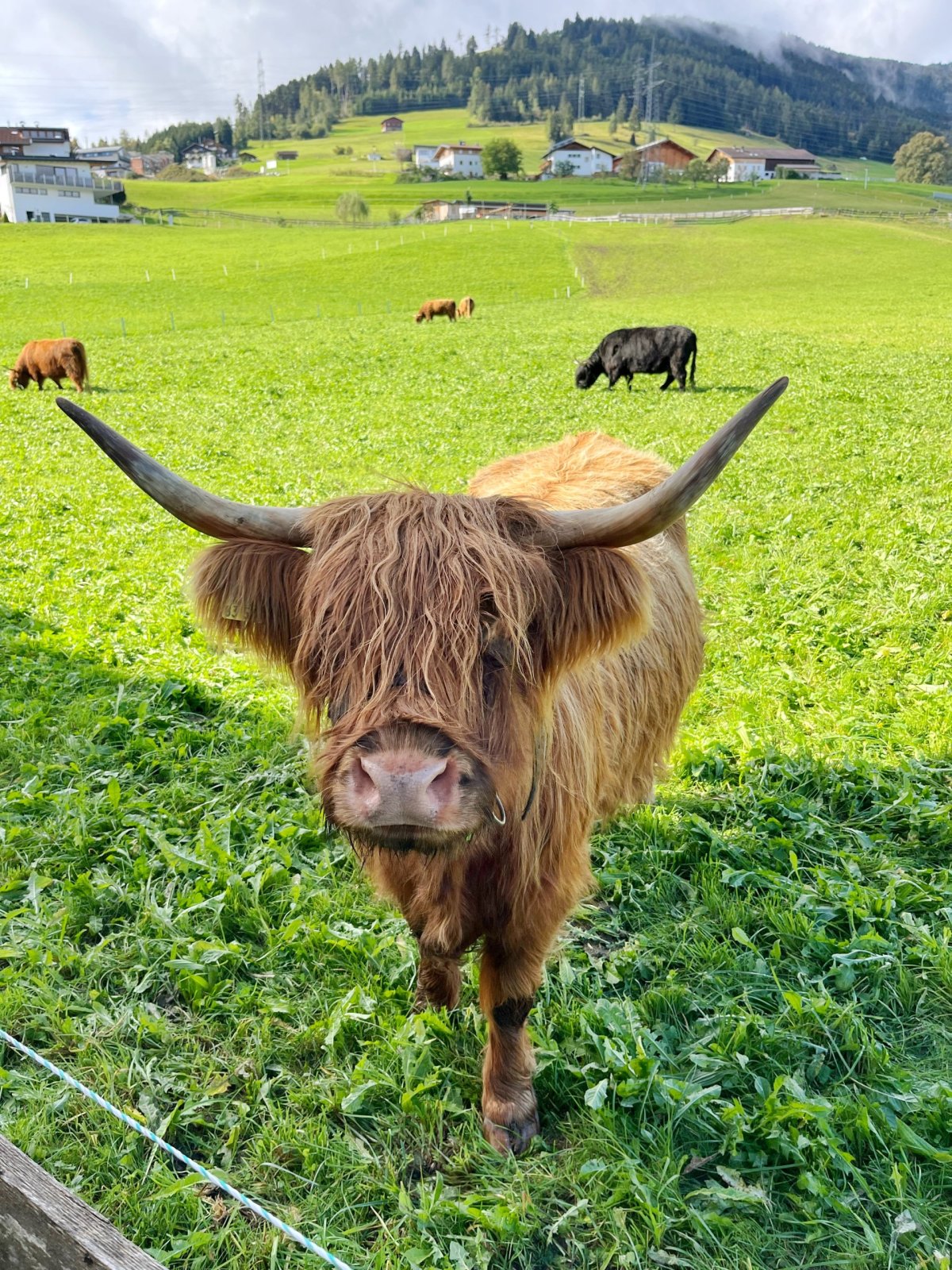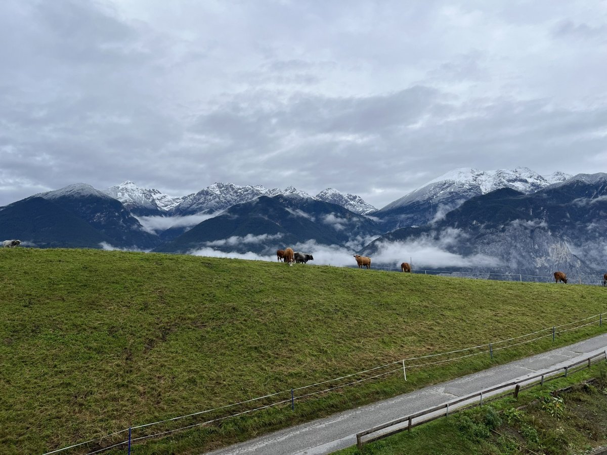 Ubytování jsem hledala klasicky přes Booking, vybírala jsem podle hodnocení a do oka mi padl rodinný penzion Studlerhof (Dickicht 6a, 6173 Oberperfuss, Rakousko) s poníky a krávami, nacházející se ve vesnici Oberperfuss s asi 3 000 obyvateli, 14 km daleko od Innsbrucku, jezdí sem překvapivě i autobus, a to přímo před penzion. Ubytování nemohlo být lepší, na 4 noci jsme dostali krásný apartmán s výhledem na hory a pastvinu s krávami, které nonstop cinkaly zvonečky na krku, vlastní kuchyní a dvěma balkony a každé ráno snídaní, celkem nás to vyšlo na 536 EUR, za psa zaplatíte potom 10 EUR/den a ještě městskou daň 2 EUR/osoba/den. Paní domácí je nejmilejší člověk na světě a připraví vám ráno vejce naměkko, jehož skořápku si můžete rozbít pomocí Eierschalensollbruchstellenverursacher (malý exkurz do němčiny nikdy neuškodí, může se hodit :D).