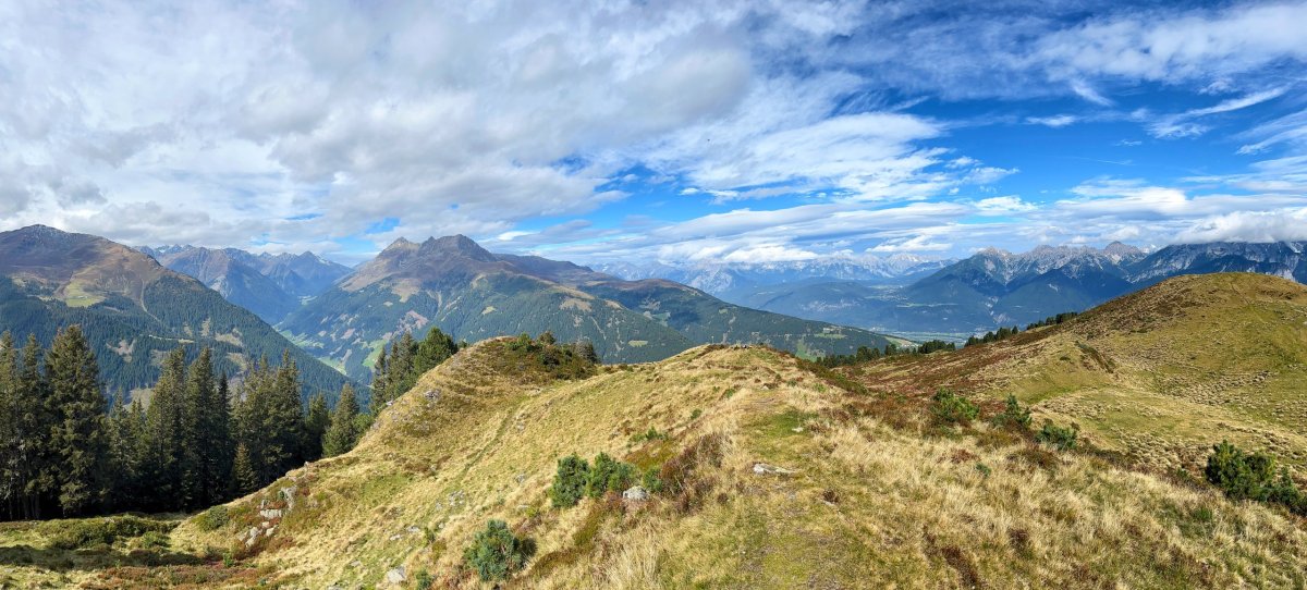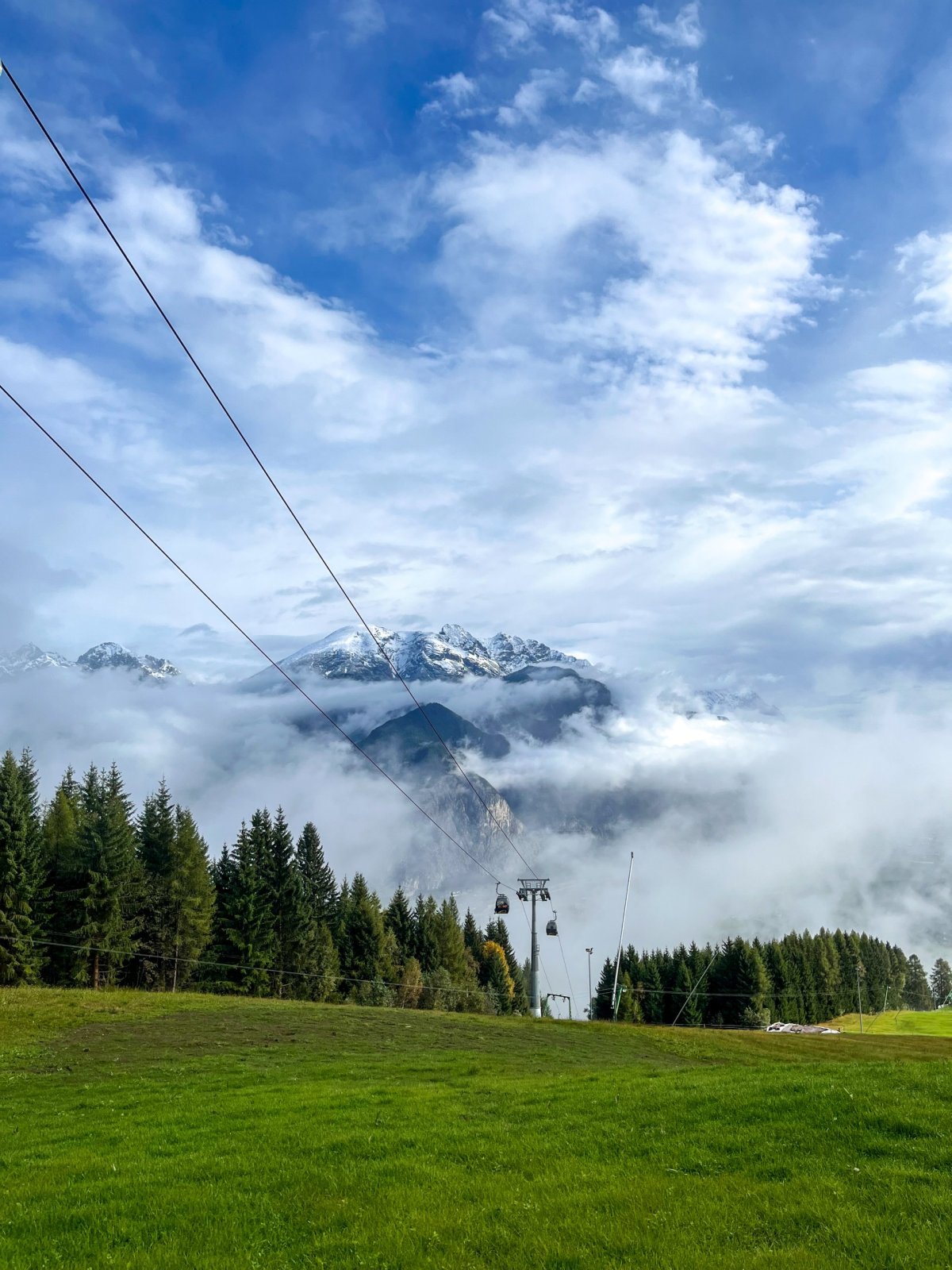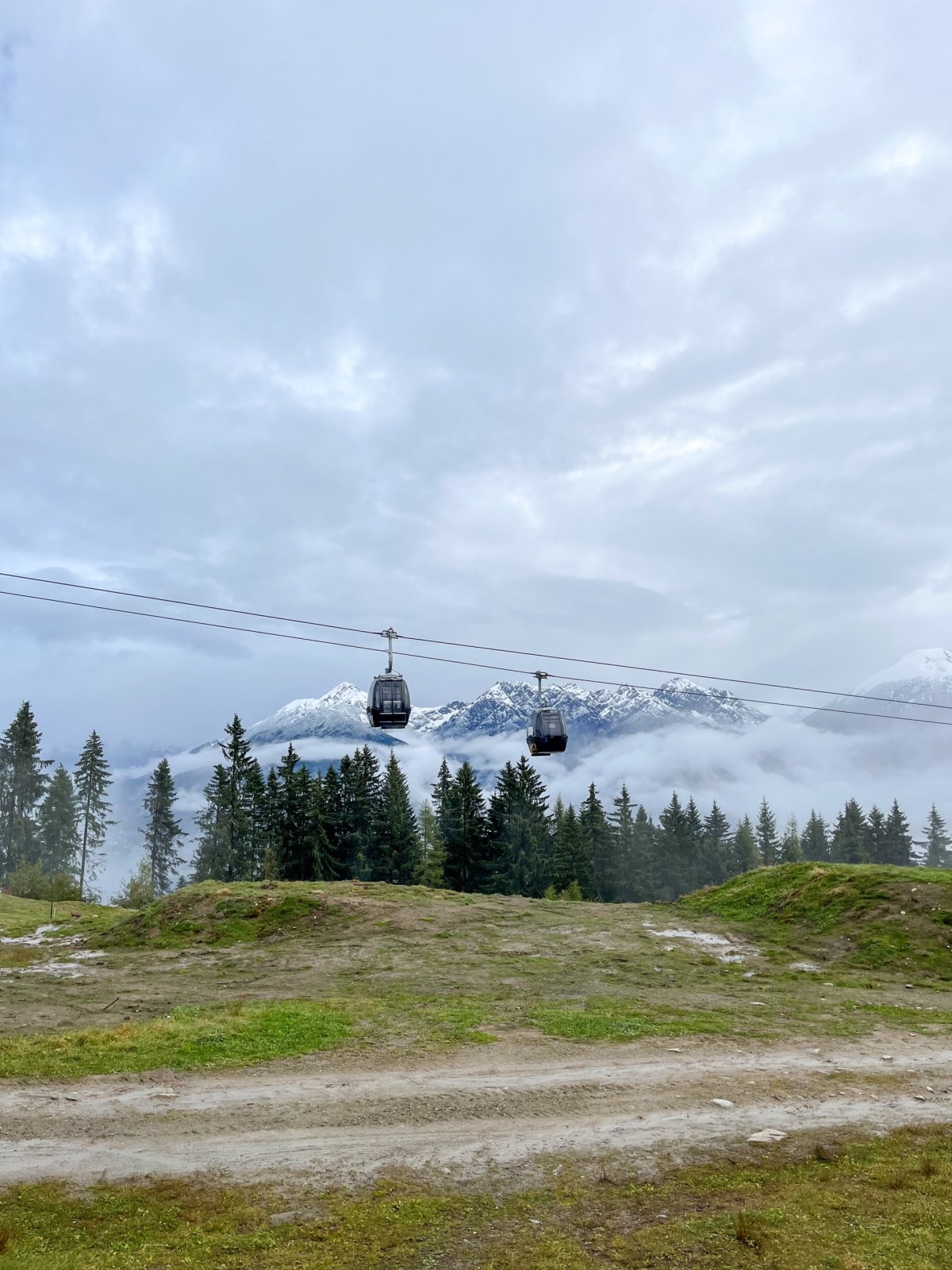 Předposlední den zase hlásili déšť, zimu a mlhu, což mě moc nepotěšilo, takže jsme vynechali nejpopulárnější Instafriendly místo Panoramabrücke Olpererhütte a změnili plán díky paní domácí, která nám doporučila jet lanovkou (zdarma) nahoru se pokochat. Moc se mi tam nechtělo, ale nakonec jsme vyrazili (když je to, táto, zadarmo!). Místo nástupu se na mapě jmenuje Bergbahnen Oberperfuss - Rangger Köpfl a jedete malou kabinovou lanovkou, která staví s jedním přestupem na dvou stanicích, my jsme jeli rovnou na tu poslední. Lanovka jezdí mimo zimní sezónu jenom o víkendu a v pondělí a pokud nemáte Innsbruck Card, tak zaplatíte vůbec netuším kolik, nejsem schopná to dohledat, pardon :D