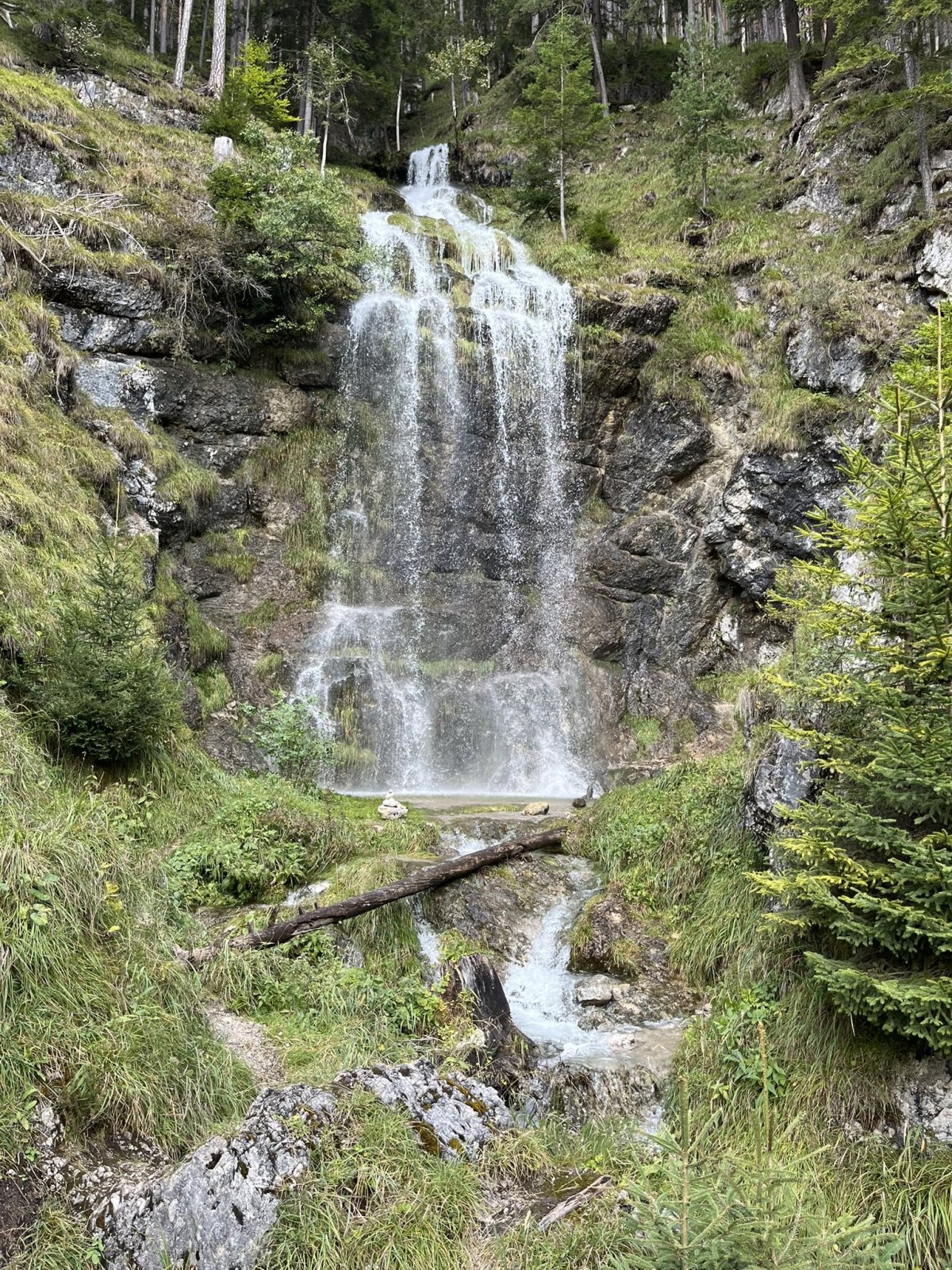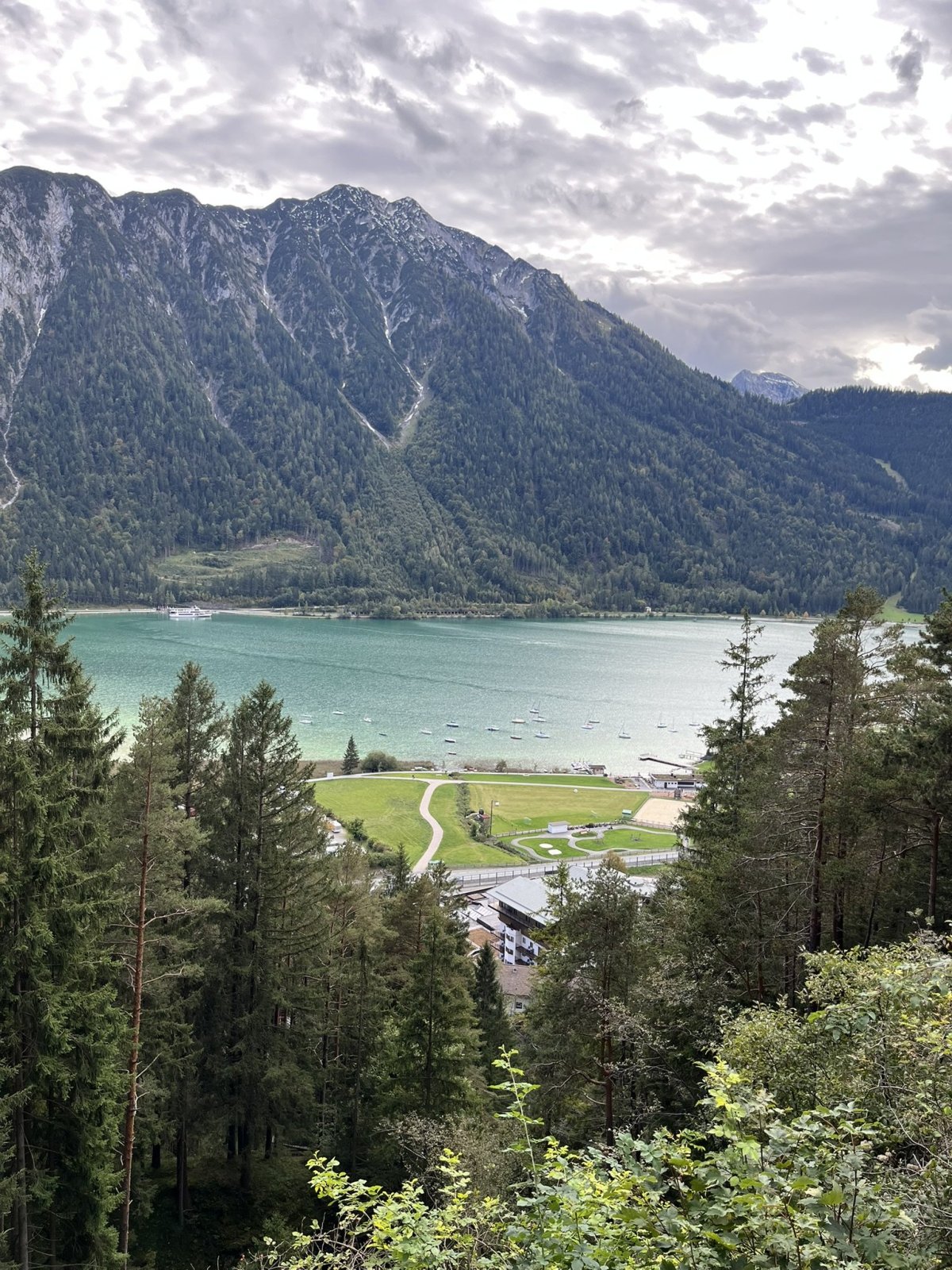 Naší první zastávkou bylo jezero Achensee (děkuji všem tady za tipy na něj!) a jeho okolí. Neměli jsme už po cestě moc sílu a čas, ale i tak jsme se šli podívat na vodopád Dalfazalm, ke kterému dojdete pěšky z parkoviště na adrese Seeuferstrasse 147, 6212 Buchau, Rakousko, asi za 40 minut, cesta je docela do kopce. Parkování stojí 2 EUR/hodina, platit můžete kartou nebo hotovostí (mincemi) v automatu.