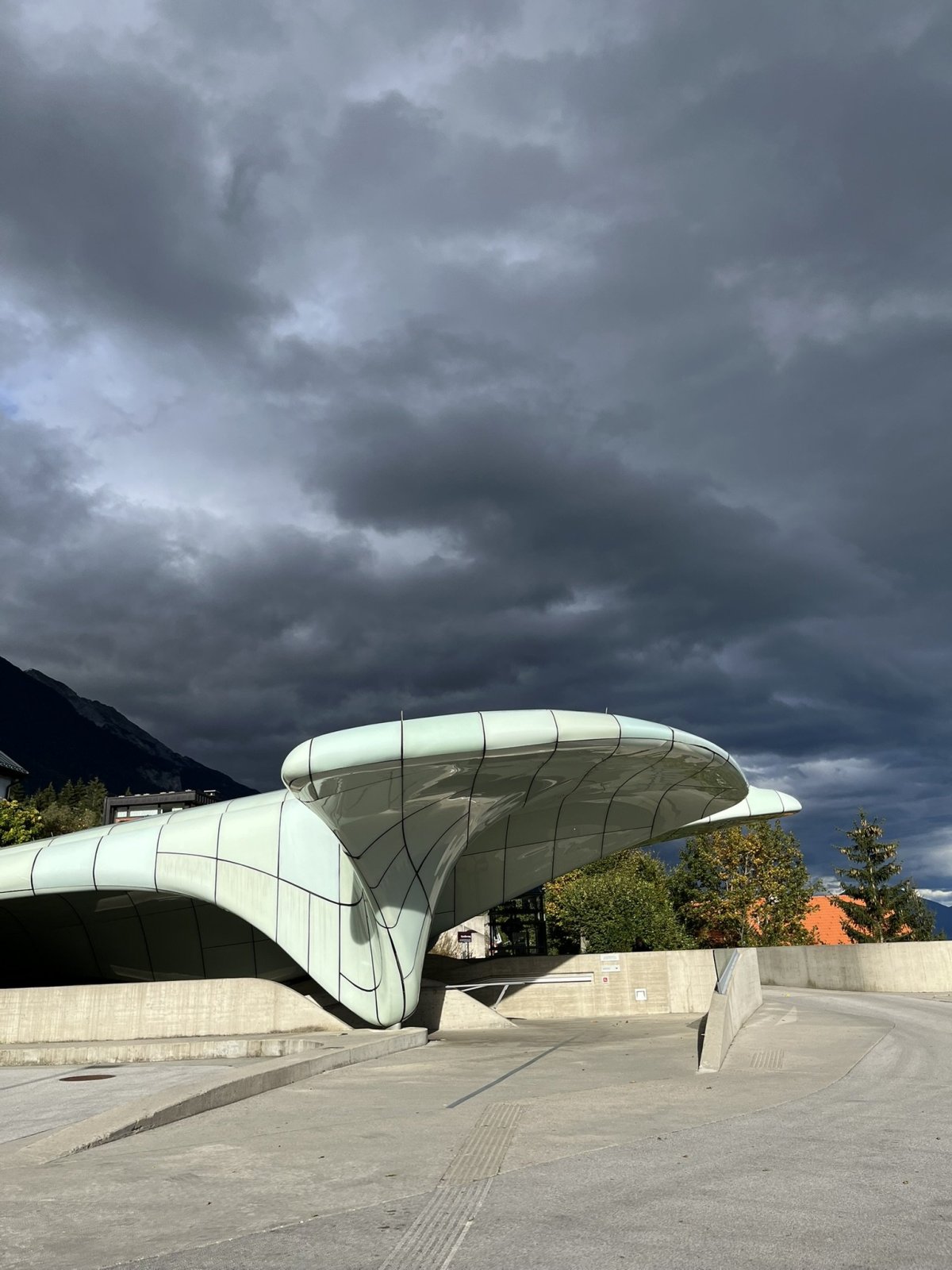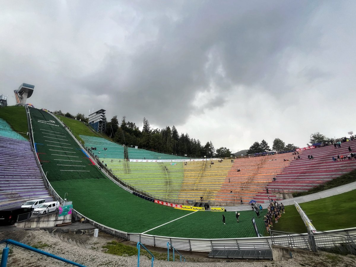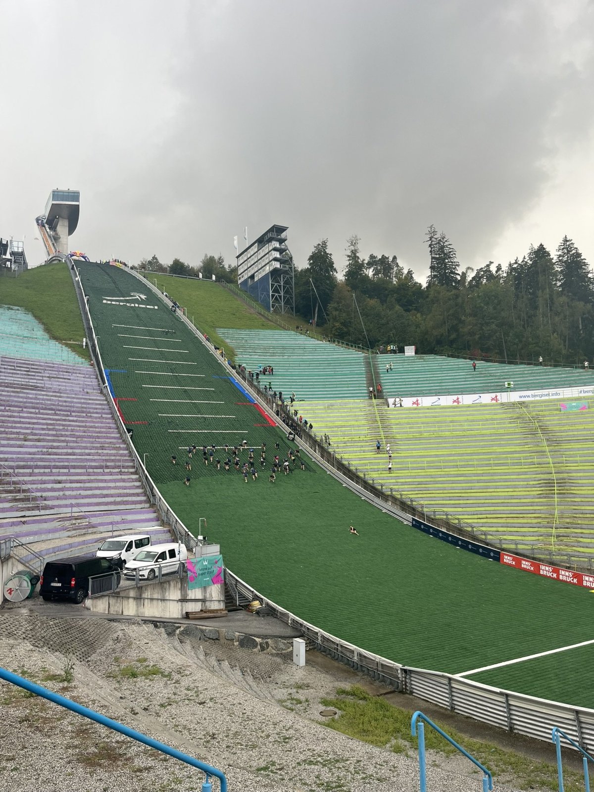 Můstek se nachází asi 8 minut pěšky od parkoviště, ale když hodně prší, tak se vaše tempo zrychlí, vyzkoušeno za vás. V době naší návštěvy se konala běžecká akce od RedBullu s cílem vyběhnout až na můstek, což umocnilo atmosféru takhle pro mě už zvlášního a děsivě monumentálního místa. Dovnitř se nesmí se psem, ale to jsem se dozvěděla až při odchodu. Nahoře na můstku je restaurace Bergisel Sky a vede k ní jakási lanovka/výtah, cena byla myslím okolo 10-15 EUR/osoba.