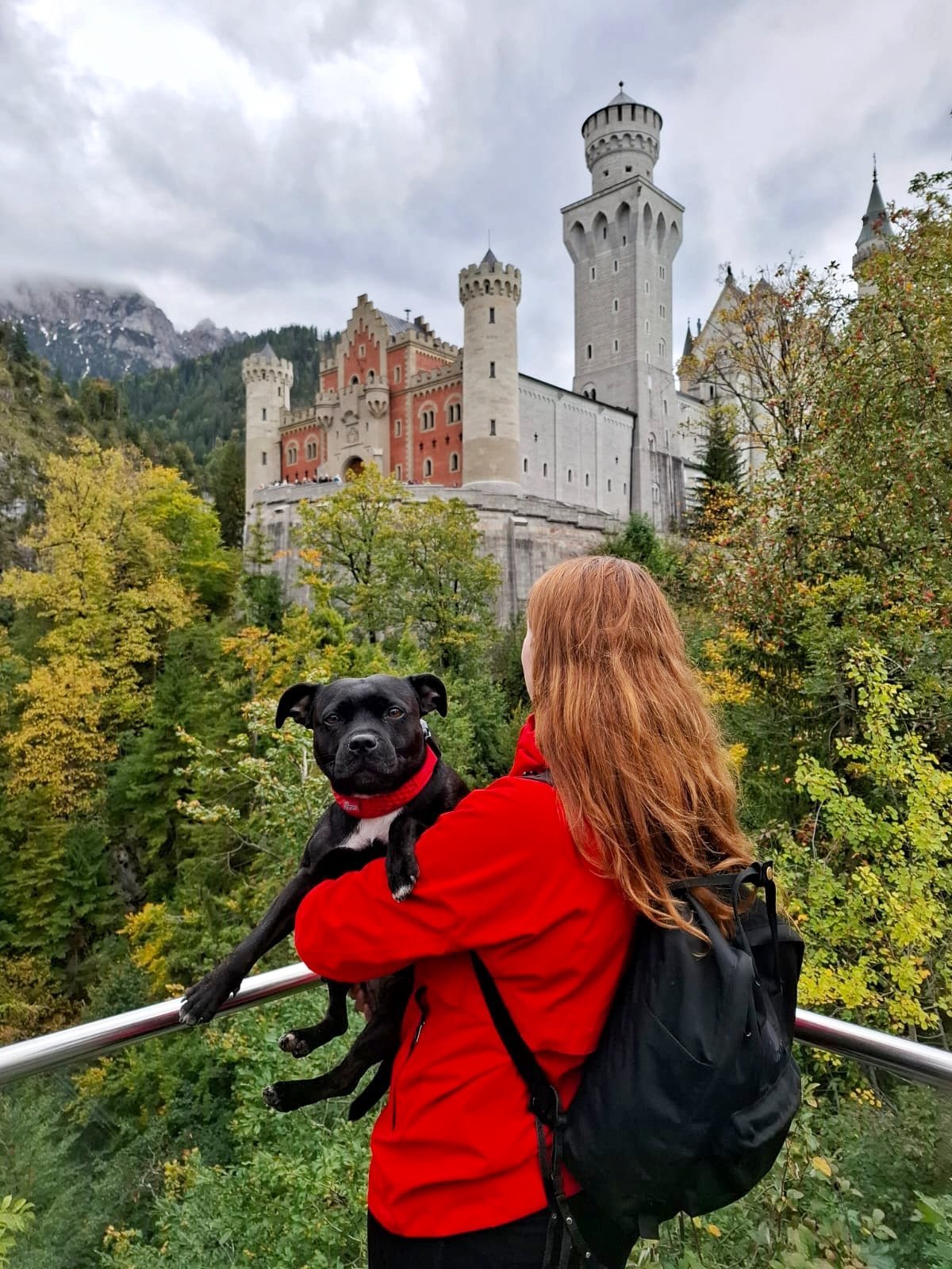 První vyhlídka je označená jako Aussichtspunkt Neuschwanstein, je z ní hezký výhled na zámek a photo point, pokud se proderete tím množstvím turistů, kterých je tady opravdu hodně i v časech a taky počasí, kdy byste to nečekali. Dovnitř jsme se nevydali, ale šli jsme dál okolo zámku přes vyhlídku Panoramablick Schwangau na Schloss Hohenschwangau a jezero Alpsee s podobně děsivým množstvím turistů, ze kterých měla radost jenom Ogginka (a oni překvapivě z ní).