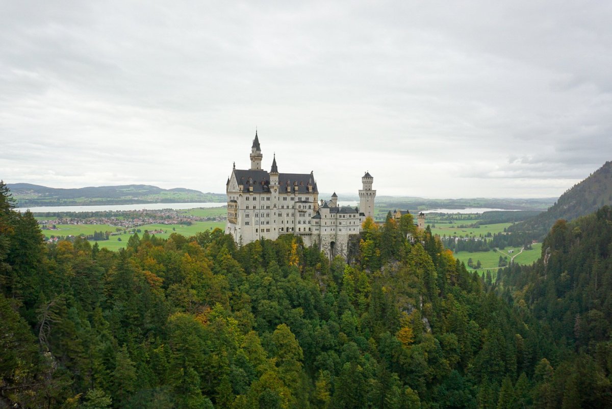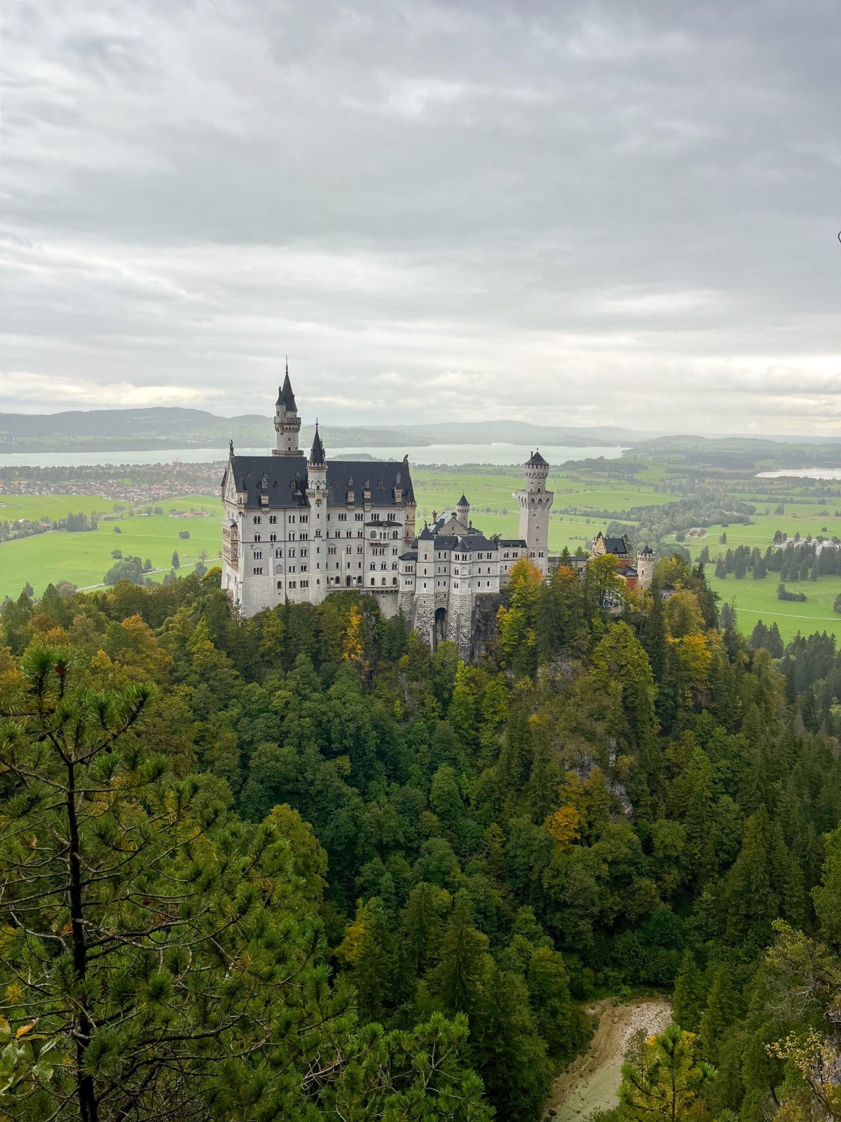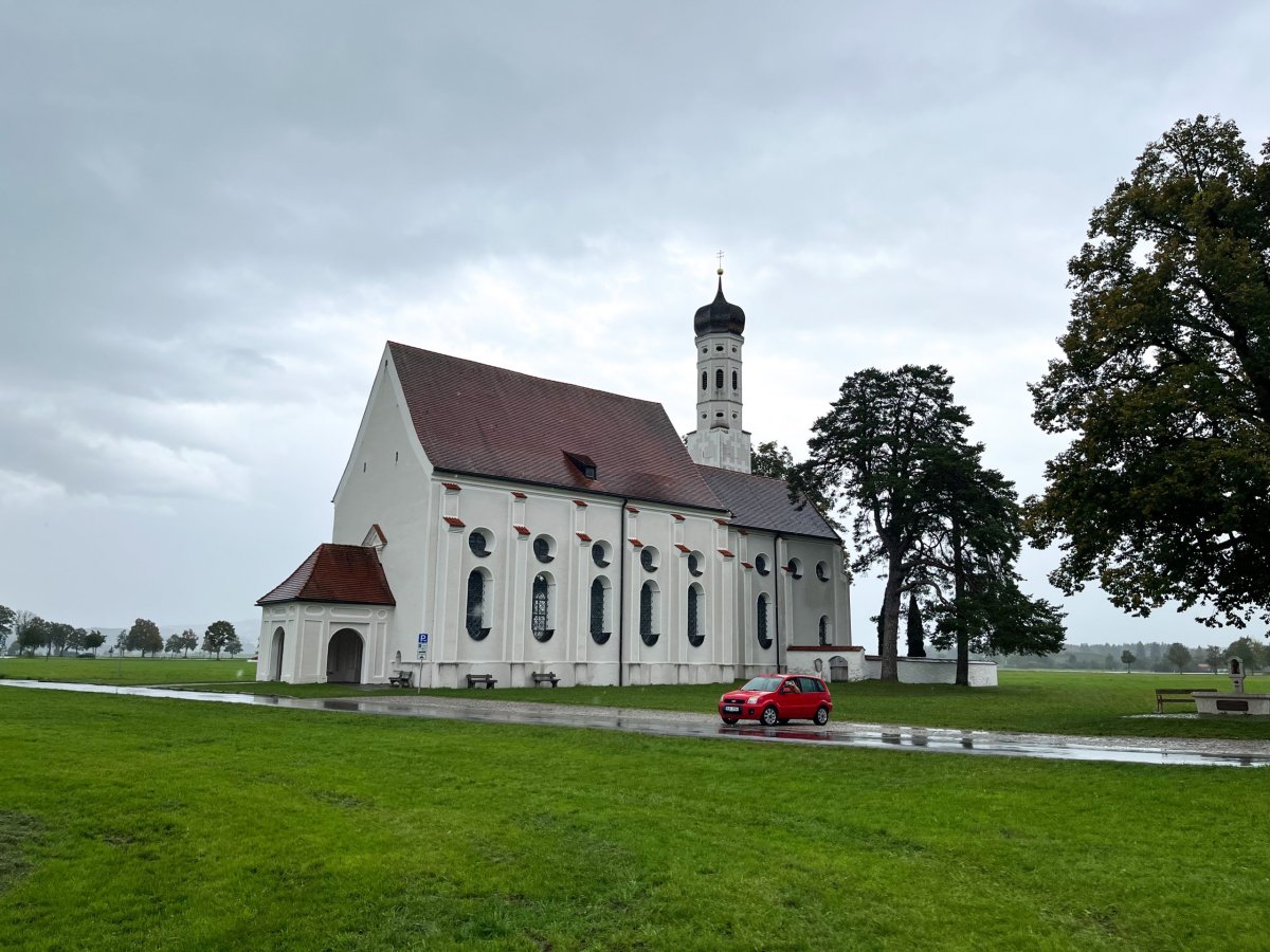 Další kroky vedly na most Marienbrücke, který byl postavený především jako vyhlídka na zámek a tomuhle účelu slouží báječně. Chce to trochu trpělivosti se prodrat davem turistů, ale většina se stejně zastaví jenom u začátku mostu. Já jsem pokračovala dál za most, kousek do lesa na vyhlídku Neuschwanstein Aussichtspunkt (HQ42+38, 87645 Schwangau, Německo), kde bylo turistů přesně nula, ne všichni asi umí lézt do kopce po kořenech stromů. I přes to, že šíleně pršelo a bylo tam asi o tisíc lidí víc než bych potřebovala potkat, tak musím uznat, že je to fakt hezké místo a minimálně jednou za život stojí za návštěvu. Cestou zpátky jsme se ještě zastavili u kostelu St. Coloman, který mi prostě jenom přišel hezký a viděla jsem ho z vyhlídky.