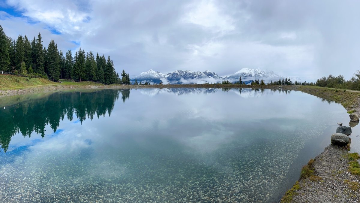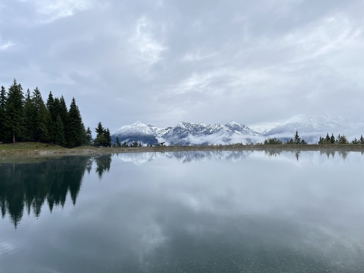 Asi minutu chůze od horní stanice se nachází mini jezero/vodní nádrž Speichersee Rangger Köpfl. Nepřekvapivě tam vůbec nikdo nebyl, ale ten výhled na okolní hory a lanovku byl boží, občas u jezera pořádají i hodiny jógy a to mi přijde super. Nádrž je plná žab, nesmí se v ní koupat, ale voda je krásně čistá a připadáte si spíš jak někde v Kanadě než v Rakousku. V létě si můžete odpočinout na dřevěných lehátkách nebo se vyřádit na houpačkách.