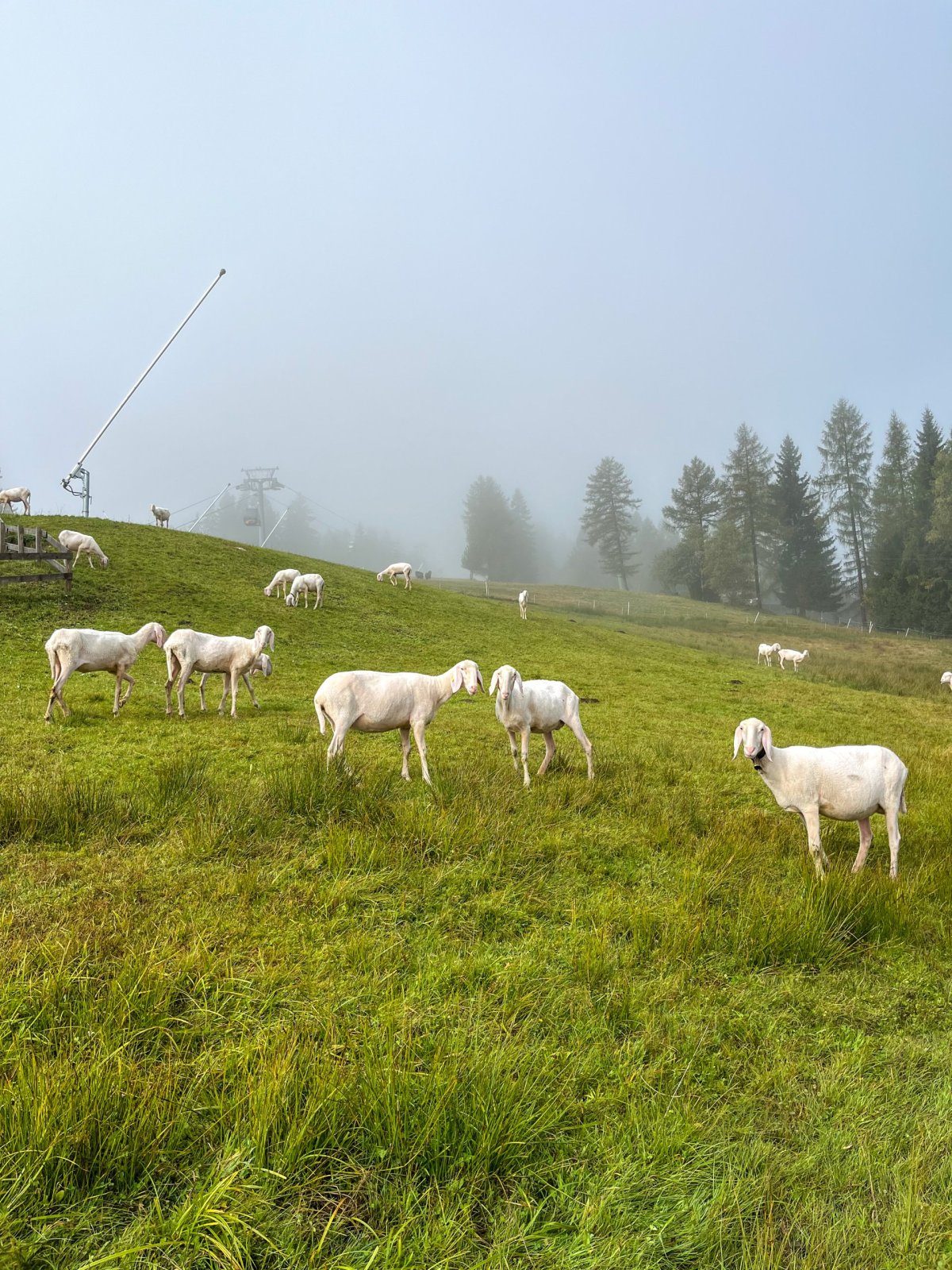 Když všechno schovala mlha, tak jsme se vrátili na prostřední stanici lanovky Bergstation Peter Anich I, kde bylo o poznání lepší počasí a hlavně ovce, které si tam vesele bečely a vůbec jim nevadilo, že jsou pitomě ostříhané na ovčího ježka a venku není úplně hezky. Navštívit tam můžete kromě ovcí taky restauraci s panoramatickým výhledem Panoramarestaurant Stiglreith OG, projít se po okolí nebo se vydat pěšky do horní nebo dolní stanice, ale nedělali jsme už ani jedno z toho.