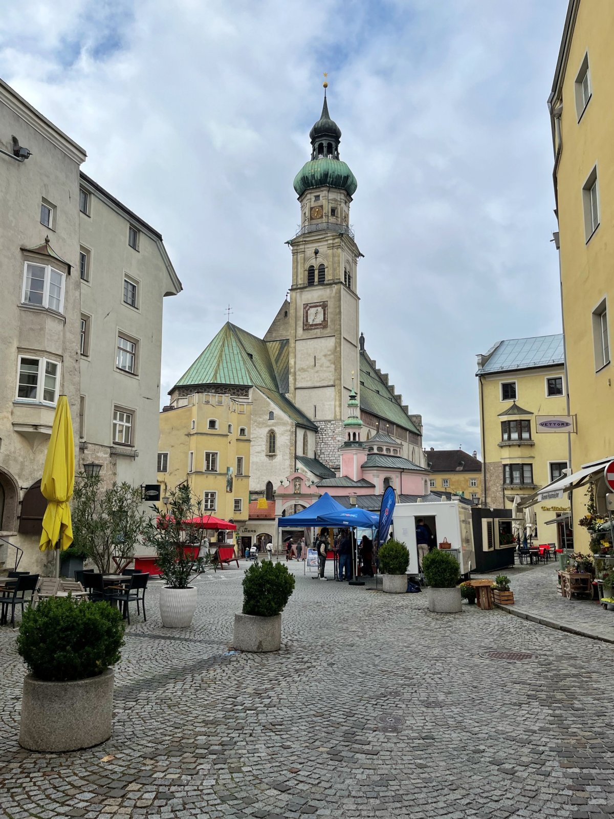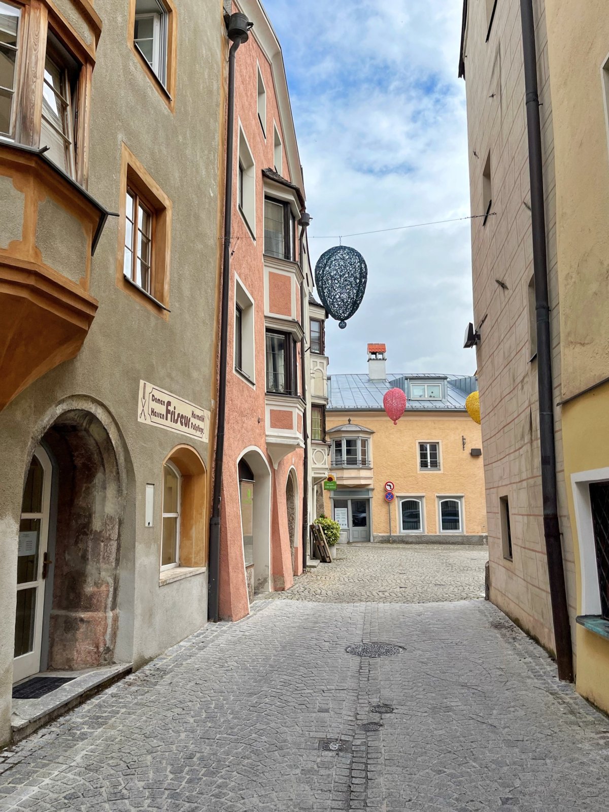 Počasí dole sice bylo o dost lepší než nahoře, ale i tak to vypadalo, že zbytek dne proprší. Zkusili jsme tak jet do bývalého okresního (asi okresního?) města Hall in Tirol, které je skoro tak hezké jako Innsbruck, jenom o trochu míň barevné a o dost menší. Rozhodně doporučuju na malou procházku po centru, ztratit se v uličkách a zajít si někam na kávu nebo wurst - turisté tam nebyli skoro žádní, natož místní obyvatelé.