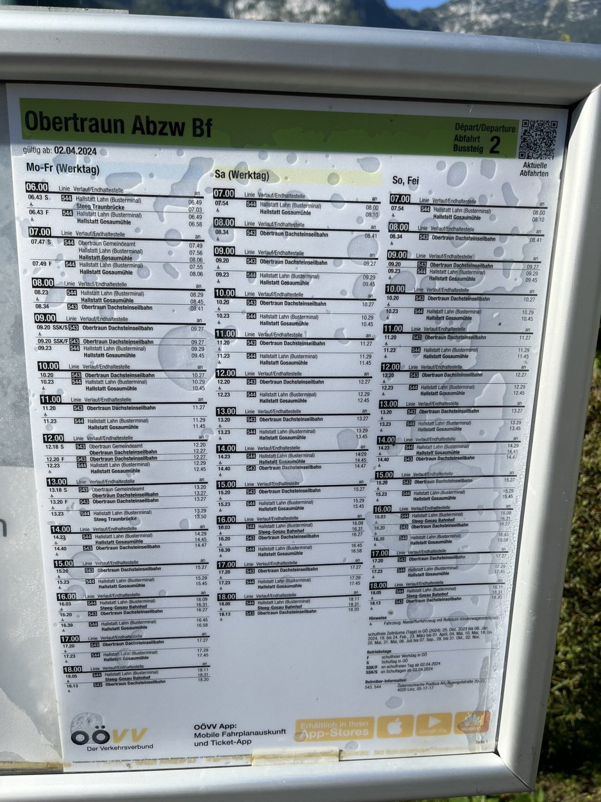 Nejdůležitější doporučení, které můžete dostat při cestování v sezóně v Rakousku je to, abyste na místě byli vždycky co nejdřív. To druhé je, že i na horách hodně svítí sluníčko a měli byste se namazat opalovacím krémem, ale o tom se moje spálené nohy nebudou teď bavit. Drželi jsme se toho prvního a vyrazili relativně brzo ráno směrem na Dachstein Krippenstein. Vlakem jsme odjížděli v 8:19 z Bad Ischlu a do cílové stanice Obretraun Dachsteinhöhlen Bahnhof to trvalo okolo 30 minut a lístek stál 6,50 EUR + 1,80 EUR za psa. Pokud se chcete dostat k lanovce relativně rychle, můžete využít autobusové dopravy - projdětě se asi 200 metrů od nádraží ke kostelíčku a tam jsou dvě autobusové zastávky, je úplně jedno, ze které pojedete, protože se autobus otáčí. Nasedněte tak do autobusu 543 a nechte se odvézt až na parkoviště k lanovce, lístek stojí 2,60 EUR na osobu, za psa jsme nic neplatili a cesta trvá cca 7 minut. Časy odjezdů nenajdete přes Google, tak aspoň přikládám fotku jízdního řádu níž.