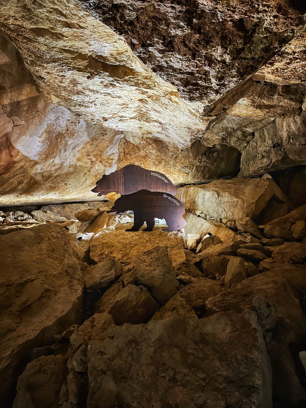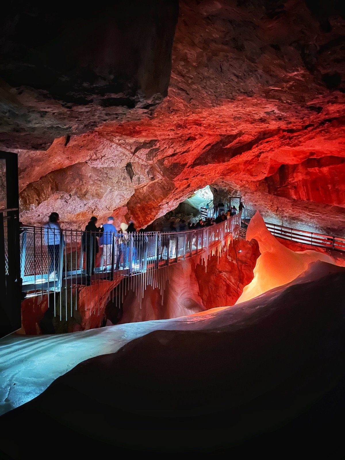 Záleží jenom na vás, jak fyzicky zdatní jste, kolik máte času a co všechno chcete vidět, protože možností je tady hodně. My jsme vybrali nejjednodušší cestu nahoru lanovkou (psi musí mít v lanovce vždycky košík), návštěvu ledové jeskyně Dachstein Giant Ice Cave a navštívení asi nejznámějších atrakcí ve 2. stanici. Lanovka jede do první stanice pár minut a potom si dáte docela strmý, cca 15 minut dlouhý výšlap k ledové jeskyni, kde si zarezervujete místo na určitý čas hned u kasy při výstupu z lanovky, kde si můžete i půjčit sluchátka a nainstalovat audioprůvodce za poplatek. Prohlídka jeskyně trvá okolo 50 minut a můžete tam jít i se psem (musí mít celou dobu košík), počítejte s tím, že v jeskyni je poměrně hodně schodů a dost zima (0-2 stupně, překvapivě...), takže se na to vhodně oblečte. V jeskyni na vás číhá medvěd, výklad v němčině a angličtině, trocha toho ledu a taky super most! Návštěvu mamutí jeskyně jsme vynechali.