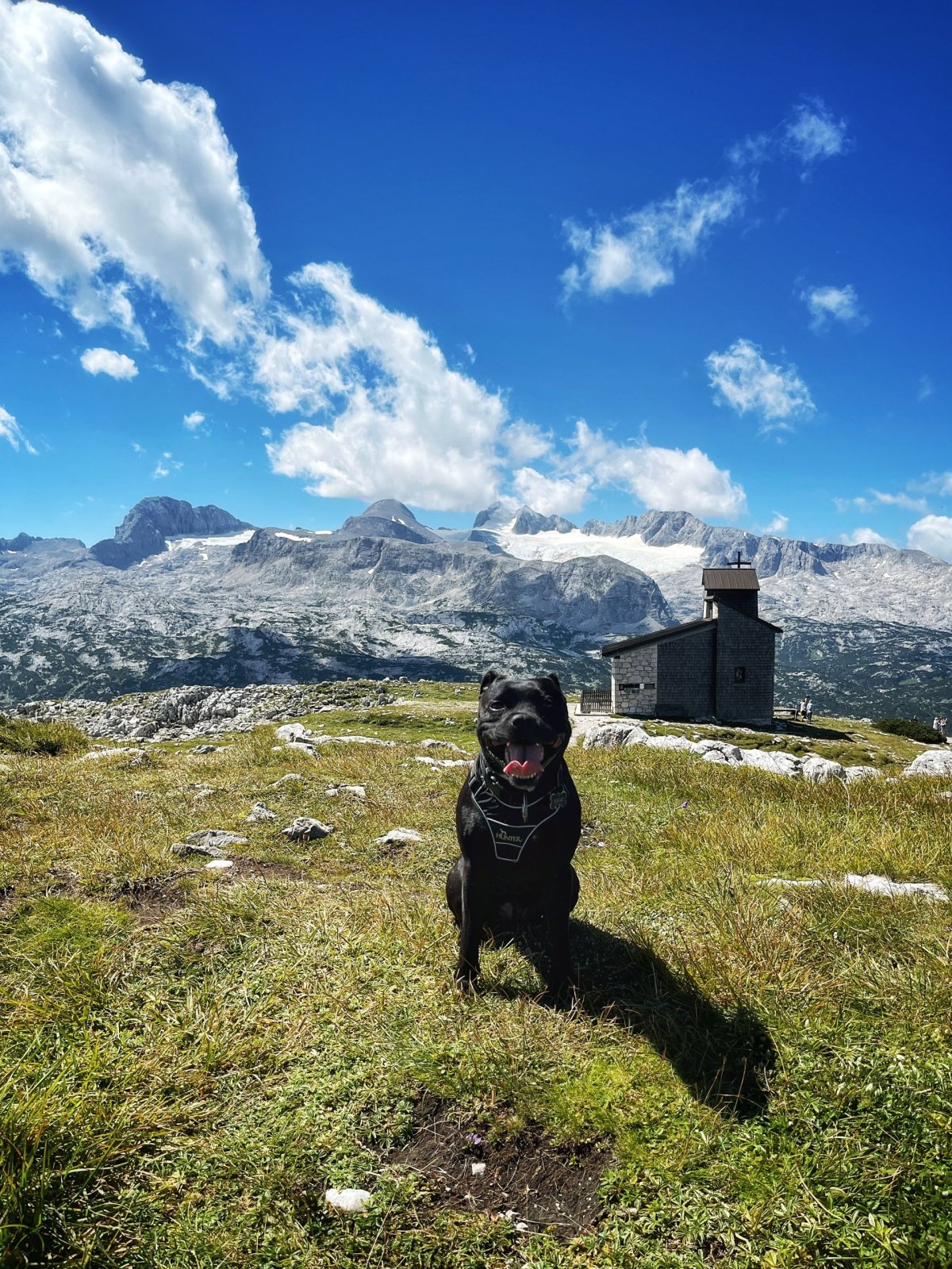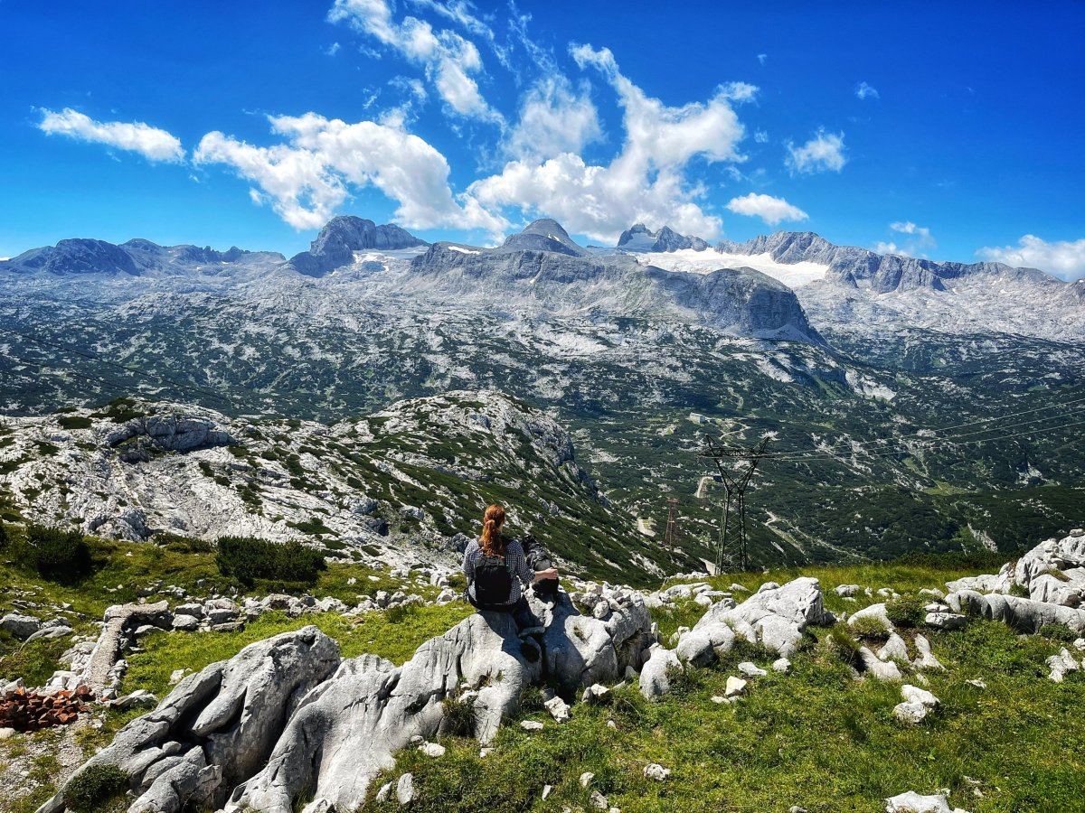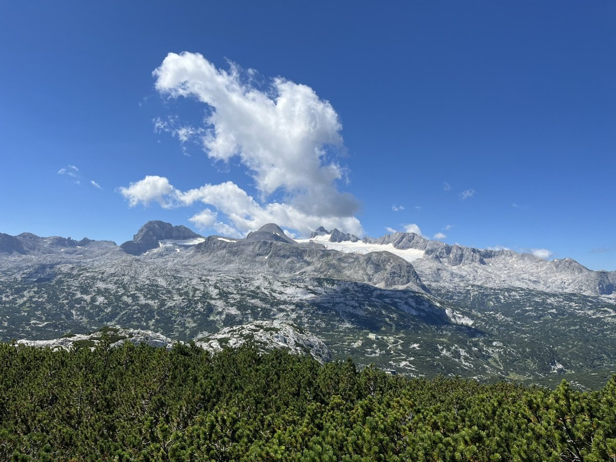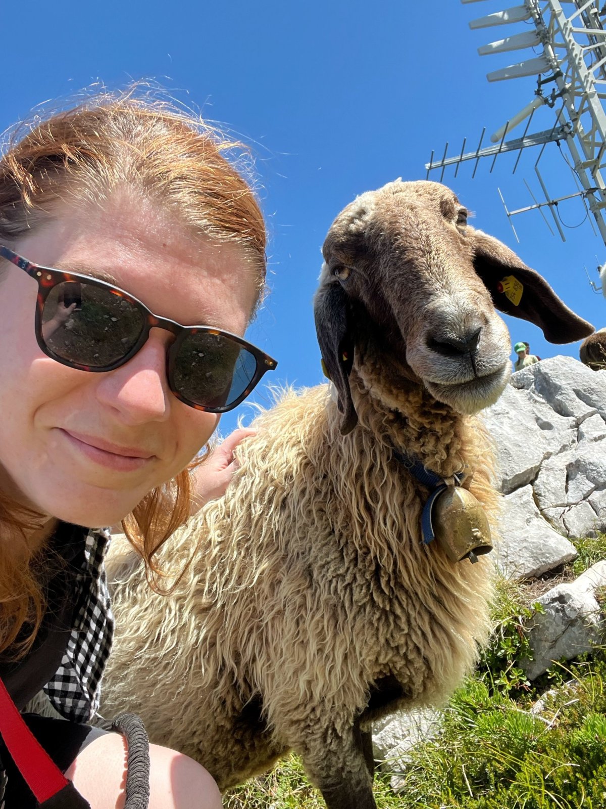 Do druhé stanice jsme se vyvezli lanovkou, pokud nemáte rádi dramata ve výškách jako já, tak pozor na zhoupnutí lanovky u sloupu, moc nepříjemná chvilka. Naštěstí cesta trvá jenom 7 minut, my jsme vyjížděli něco okolo 12:00, lanovky jezdí v přibližně patnáctiminutových intervalech. Jak byla nepříjemná cesta, tak o to je lepší výhled na Dachstein a okolí, který se vám naskytne při výstupu z lanovky. V okolí lanovky můžete navštívit panoramatické vyhlídky a populární místa jako 5 Fingers, World Heritage Spiral (Welterbespirale), Pionierkreuz, kapli Heilbronner Kapelle nebo se 30 minut projít a navštívit za mě asi nejzajímavější místo, žraloka Dachstein Hai, do kterého se dá vlézt a vyfotit si panoramata přes čelisti, za mě fakt dobrý. Na žraloka se už nechodí dívat tolik lidí, byli jsme tam skoro sami a po cestě zpátky jsme se zastavili u malého jezírka Däumelsee vykoupat psa. Cesta tam a zpátky je docela dobrodružství, ale zvládnete to v pohodě. Níž přikládám hodně fotek, včetne selfíčka s ovcí :D