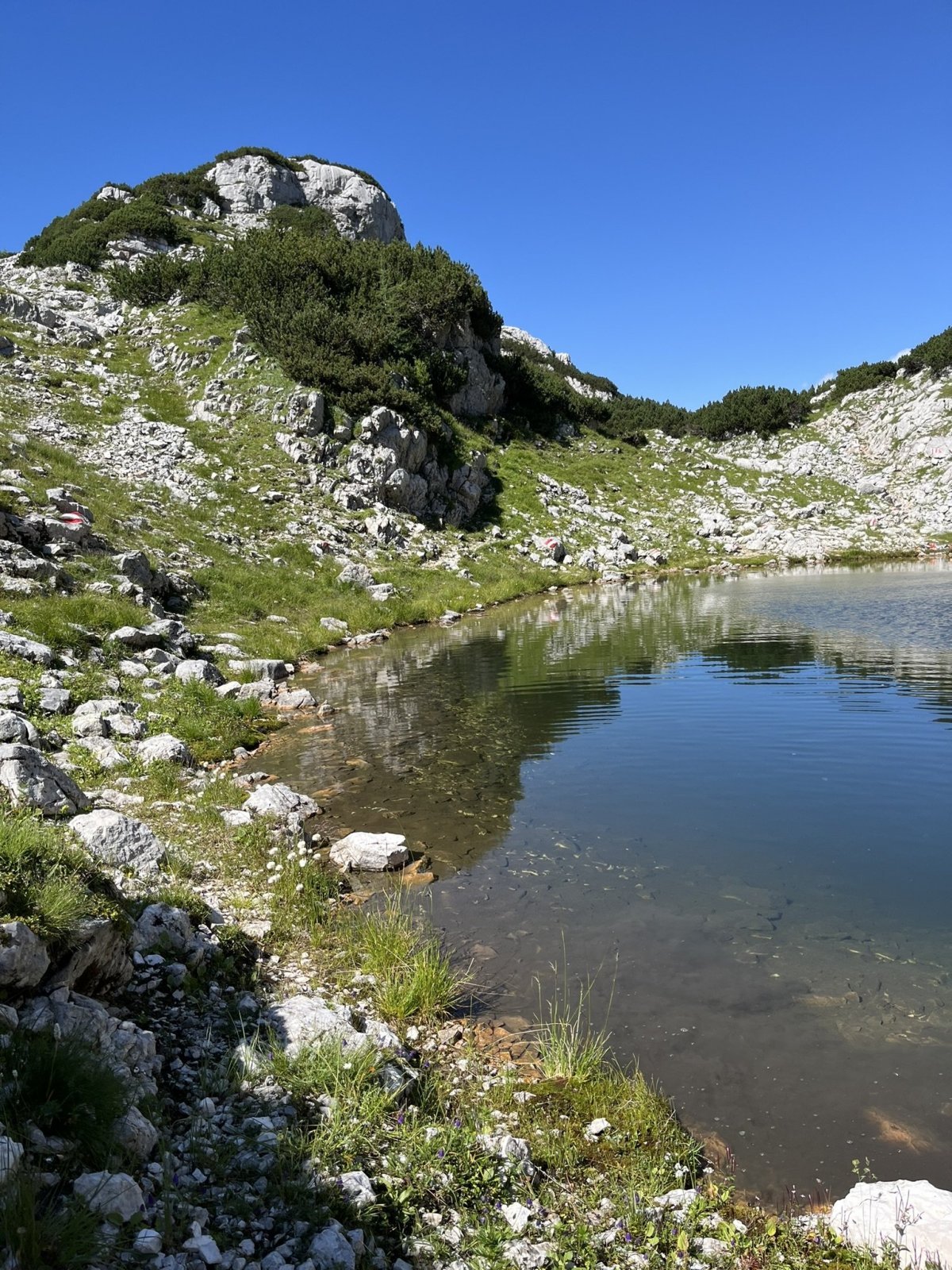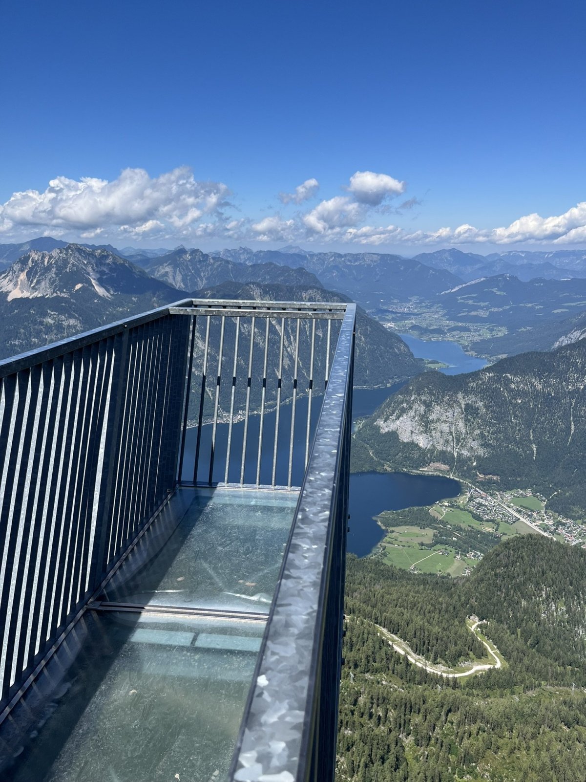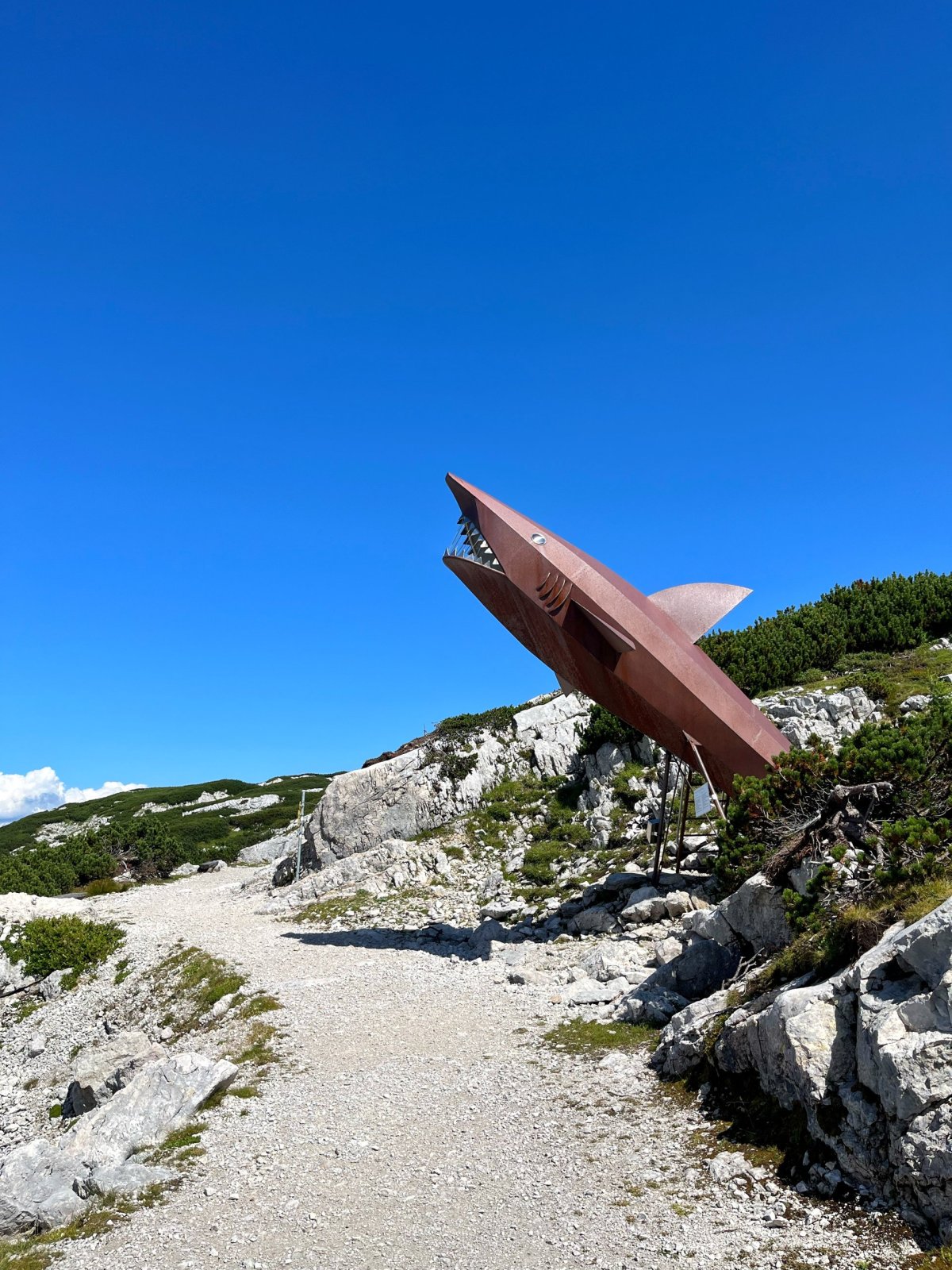 Do druhé stanice jsme se vyvezli lanovkou, pokud nemáte rádi dramata ve výškách jako já, tak pozor na zhoupnutí lanovky u sloupu, moc nepříjemná chvilka. Naštěstí cesta trvá jenom 7 minut, my jsme vyjížděli něco okolo 12:00, lanovky jezdí v přibližně patnáctiminutových intervalech. Jak byla nepříjemná cesta, tak o to je lepší výhled na Dachstein a okolí, který se vám naskytne při výstupu z lanovky. V okolí lanovky můžete navštívit panoramatické vyhlídky a populární místa jako 5 Fingers, World Heritage Spiral (Welterbespirale), Pionierkreuz, kapli Heilbronner Kapelle nebo se 30 minut projít a navštívit za mě asi nejzajímavější místo, žraloka Dachstein Hai, do kterého se dá vlézt a vyfotit si panoramata přes čelisti, za mě fakt dobrý. Na žraloka se už nechodí dívat tolik lidí, byli jsme tam skoro sami a po cestě zpátky jsme se zastavili u malého jezírka Däumelsee vykoupat psa. Cesta tam a zpátky je docela dobrodružství, ale zvládnete to v pohodě. Níž přikládám hodně fotek, včetne selfíčka s ovcí :D