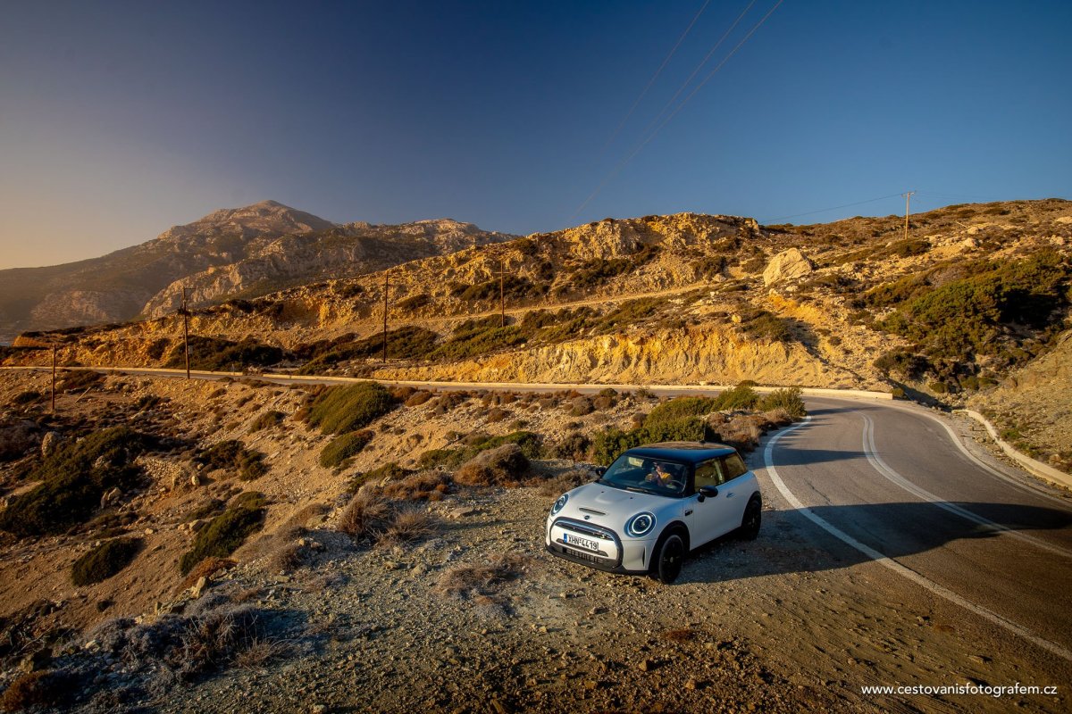 Pokud chcete poznat pravý charakter ostrova, neobejdete se tu bez auta, čtyřkolky, motorky nebo kola. Karpathos není velký ostrov, ale díky horským uličkám pojedete často pomalu, a kochat se budete za každou zatáčkou. Objet celý ostrov kolem dokola vám zabere 3–4 hodiny, ale vzhledem k tomu, že většina populárních míst se nachází na jižní polovině ostrova, nebudou vaše cesty trvat déle než hodinu. Půjčoven aut i motorek tu najdete spoustu, a ceny se pohybují od 20 eur za den. Moje ubytování zahrnovalo i půjčení elektrického Mini s možností dobíjení zdarma přímo v apartmánech. Autíčko jsem si opravdu užil, protože řídit sportovní verzi elektrického Mini S byl v místních zatáčkách opravdu zážitek.