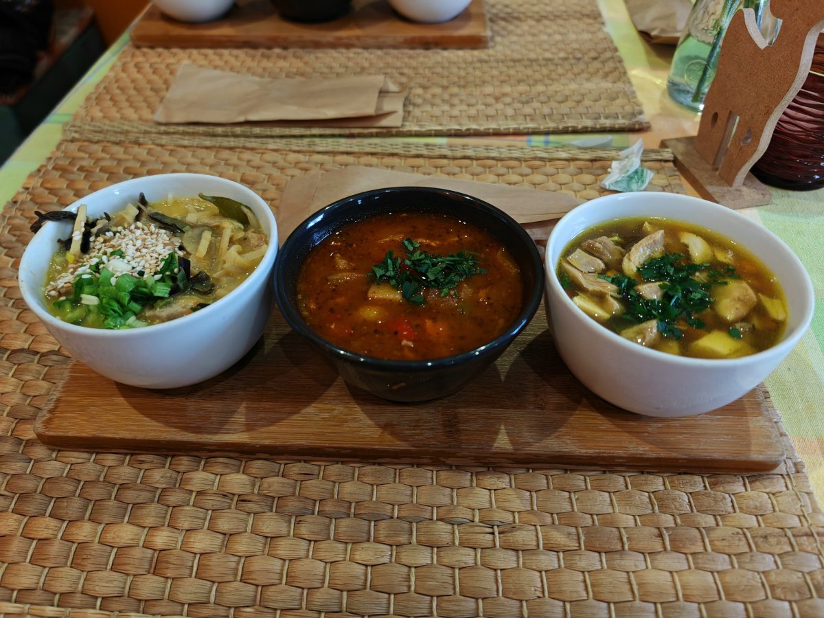 Jak jsme se začali blížit k místu příjezdu, začal jsem hledat na Google otevřené restaurace ve městě Katovice. Našel jsem restauraci, která má zdravý koncept. Byla to vlastně polévkárna "Okiem i Brzuchem" s velmi dobrým hodnocením, tak jsme řekli, že to zkusíme. V 10:50 jsme stáli před restaurací a zjistili jsme, že otvírá až v 11:00. Prošli jsme tedy parkem, abychom zabili čas, a v 11:00, hned po otevření, jsme vstoupili dovnitř. Byli jsme tam první hosté a víceméně jediný. Z nabídky jsme zjistili, že mají sestavy tří polévek, nebo jen samostatnou polévku tak jsme se rozhodli ochutnat sestavu třech polévek. Polévky byly dobré, ale po druhé bych tam už nemusel. Nebylo to na polský způsob, ale spíše nějaký thajský chuťově. Po zaplacení jsme pokračovaly v cestě na ubytování.