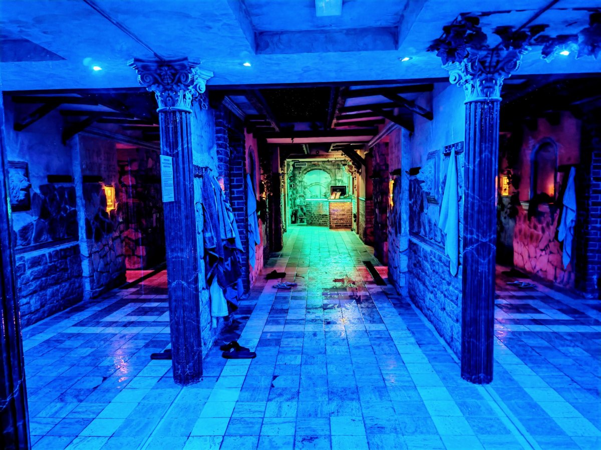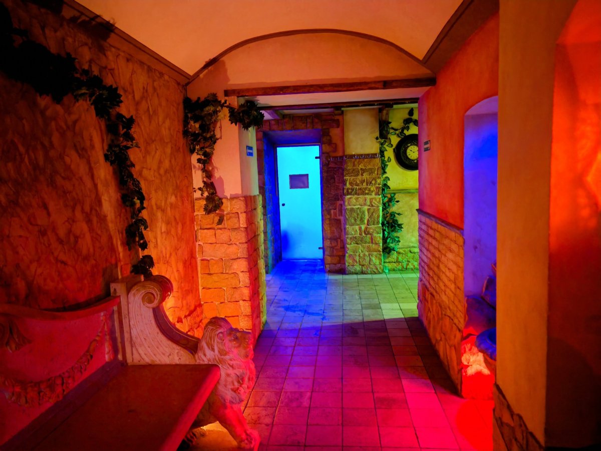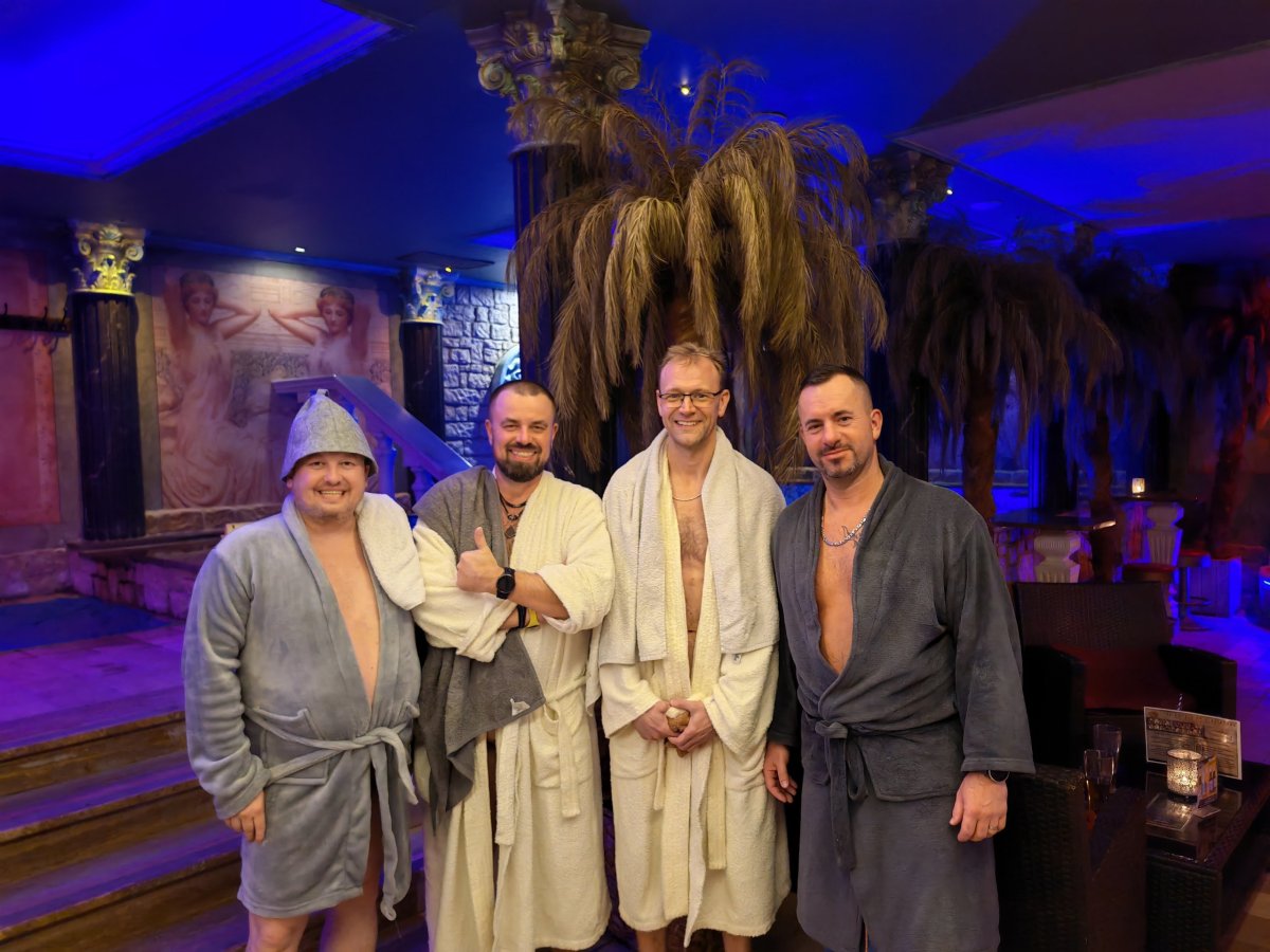 Ale přesto všechno to bylo fajn a doporučuji to navštívit. Probíhají tam rituály. Máte tam rozpis na cedulích, v jaké komoře a v kolik je jaký program. Více méně jsme chodili na programy s rituály. Občas jsme si došli do šatny na panáčka. K večeru jsme si dali v restauraci polévku a pivo. Samozřejmě jsme několikrát za ten den navštívili i vodní bar, kde jsme si také dali nějaké pivo. Ale na tvrdé jsme si chodili do šatny. A takhle nám uběhl celý den.