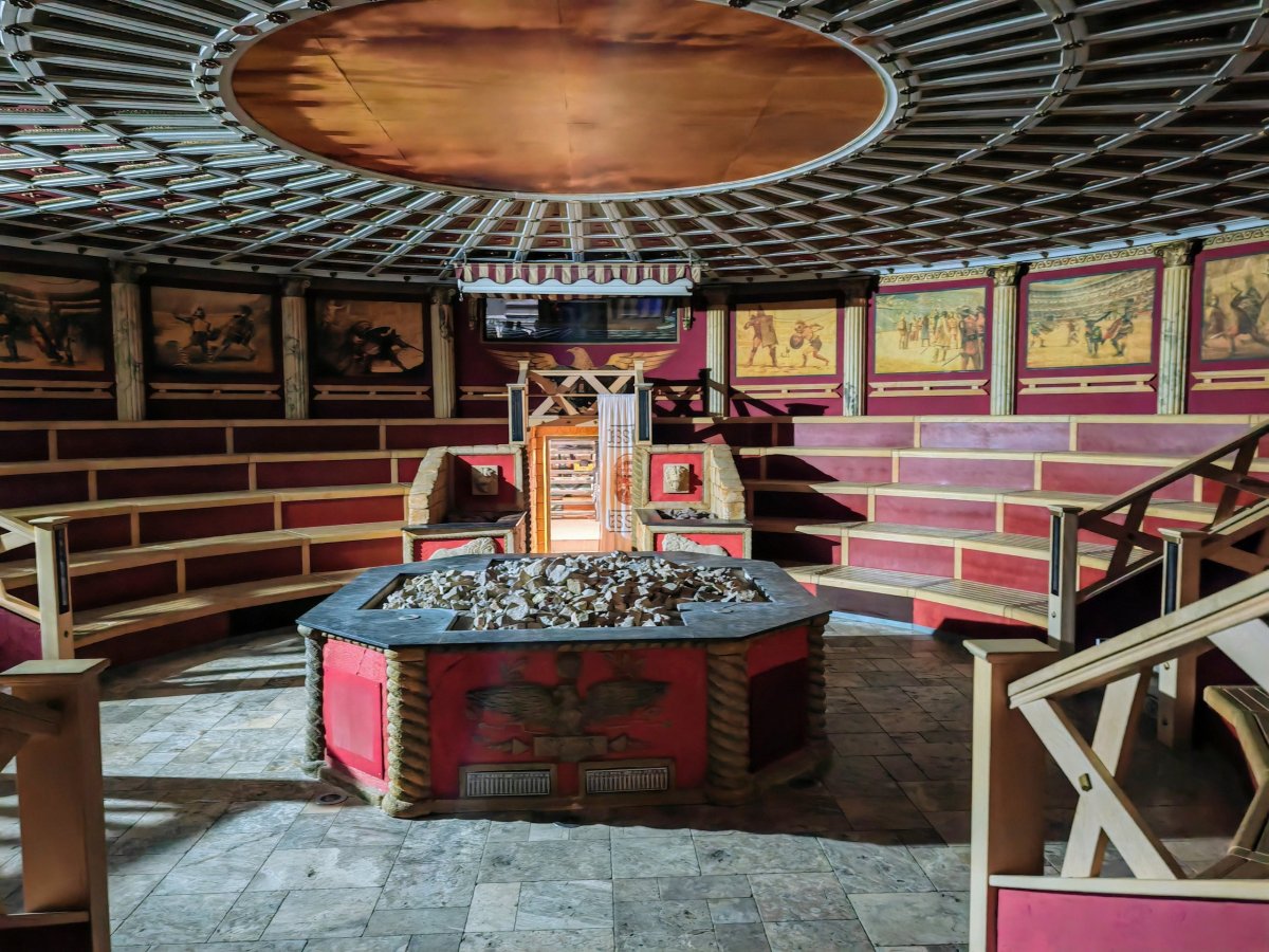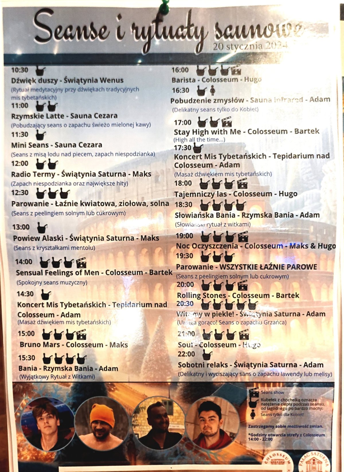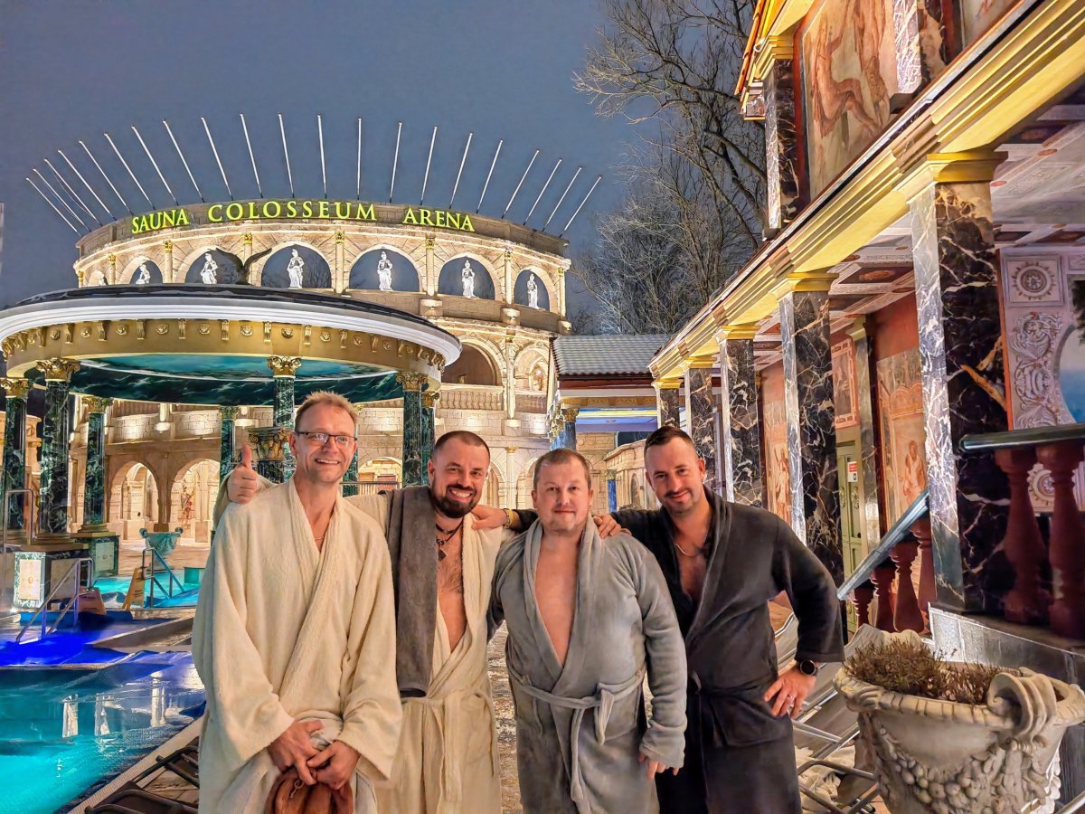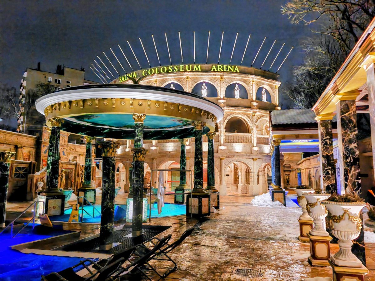 Jedná se o jedinečné saunové zařízení v Evropě, postavené na základě starověkých základech s největší saunou na světě. Největší sauna na se nachází v Polsku, konkrétně nedaleko světě Katovic, v městečku Czeladź. Tato sauna je součástí wellness komplexu nazývaného Termy Rzymskie. Sauna pojme až 300 osob a nazývá se Colosseum Sauna Arena. Po příjezdu do lázní jsme vešli dovnitř a zakoupili si vstupné. Stačilo základní, to dražší jen získáte půjčení županu a šatnu o pár metrů blíže, ale nevyplatí se to. Funguje to tak, že u vstupu dostanete na ruku čip, kterým uvnitř na barech platíte. Při výstupu z lázní vás ven nepustí dokud nevrátíte hodinky a neuhradíte útratu. Šli jsme do šaten se převléknout. Každý si nesl batoh, kde měl župan a tři ručníky a flašku. Protože za celý den promočíte ručník, tak jeden je málo a pokud nechcete chodit s mokrým, je lepší jich mít více. Tři jsou ideální, pokud tam jste celý den. Lázně otvírají v 11 hodin a my jsme dorazili ve 12:15 a byli jsme tam až do konce, cca do 21:40.