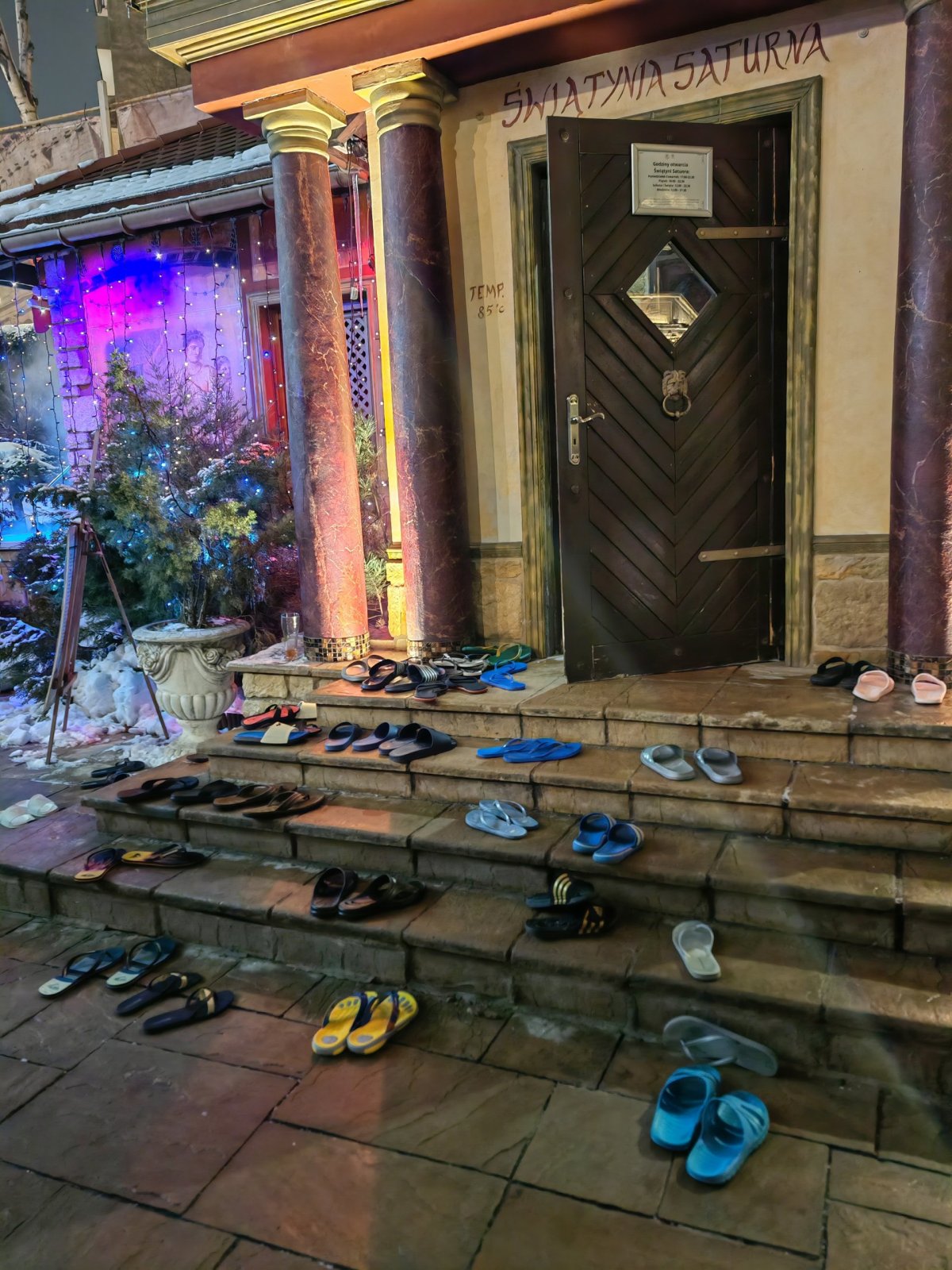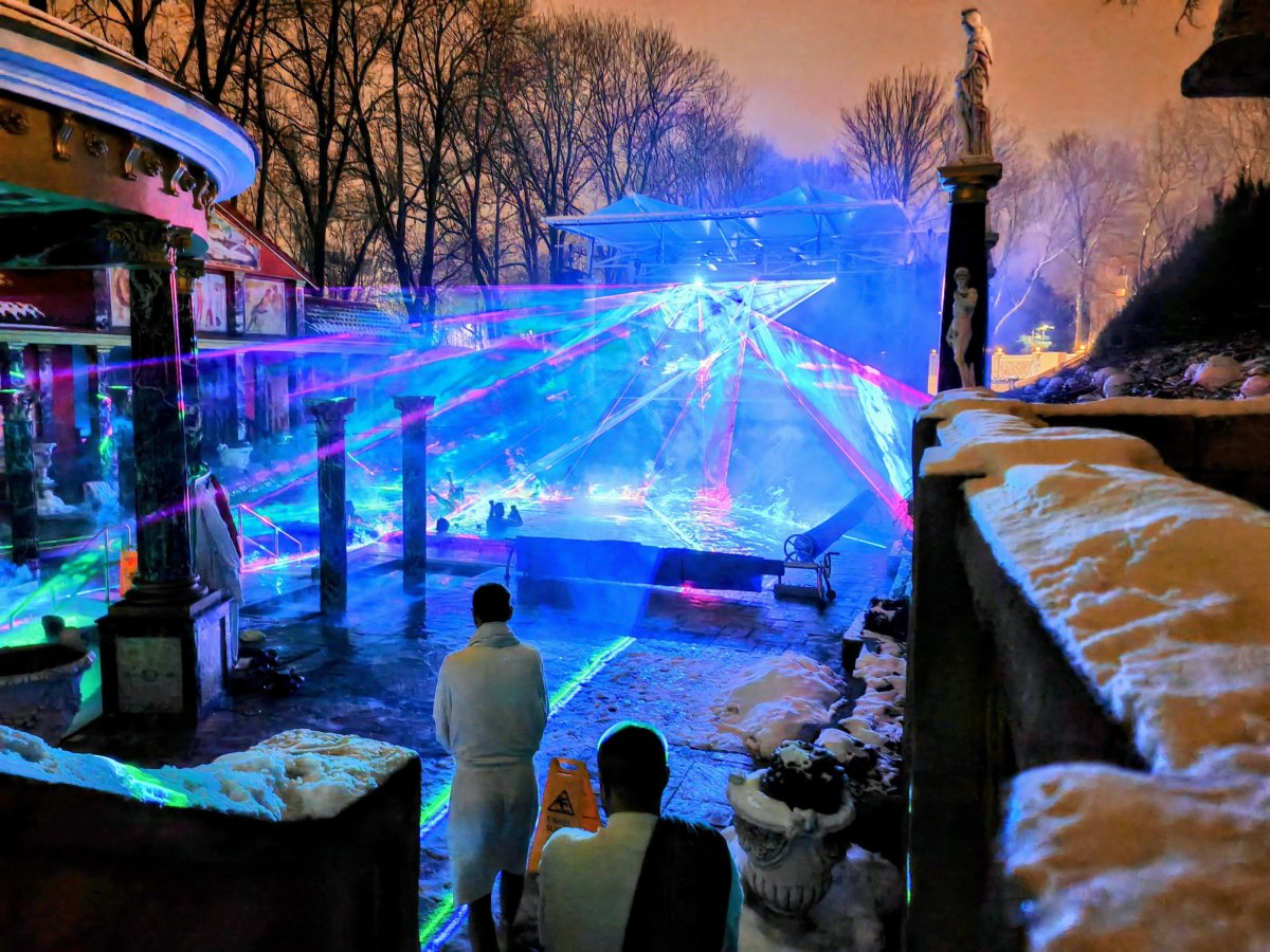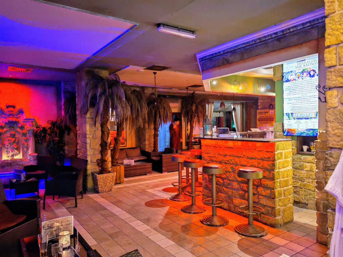 Na polévku jsme šli kolem 20:00 večer a když jsme vylezli opět ven do venkovní části, už se setmělo. Běžela tam světla, nějaké laserové efekty co blikaly. Tak jsme řekli, že se jenom naložíme do sauny, která měla 130 stupňů. Bylo asi za 10 minut 21:00 a mělo to být otevřeno do 22:00. Asi ve čtvrt na 10 nám vlezl do sauny někdo z personálu a se nás ptal, co tam děláme, že již od 21:00 je zavřeno. Vysvětlil nám, že venkovní část zavírá v 21:00. Ale vnitřní část byla až do 22:00. Byl to pro nás šok. Když jsme vylezli ze sauny, nikde nebyla ani noha. Všude bylo mrtvo, všechno uklizené, sbalené, bazén přikrytý velký. Ale díky tomu, že tam bylo prázdno, nám dovolili udělat aspoň nějakou fotku. Protože tam je přísný zákaz focení, což se dá pochopit, protože tam je samý naháč všude, tak jsme si aspoň udělali nějaké fotky. Další paradox je že to stojí mezi paneláky a když stojíte venku tak na vás krásně vidí.