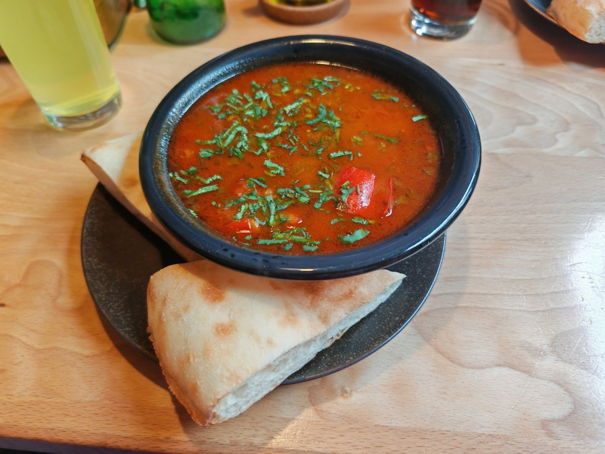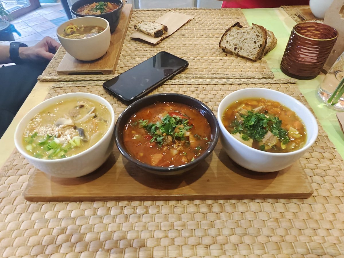 Okiem i Brzuchem, Tadeusza Kościuszki 18, 40-049 Katowice, Poland. Sestava tří polévek s chlebem a nápojem stála 172kč.
