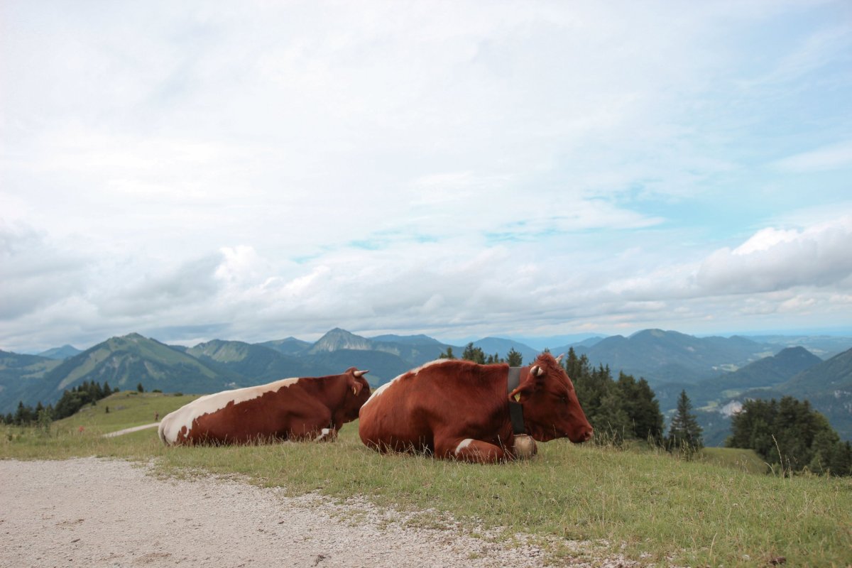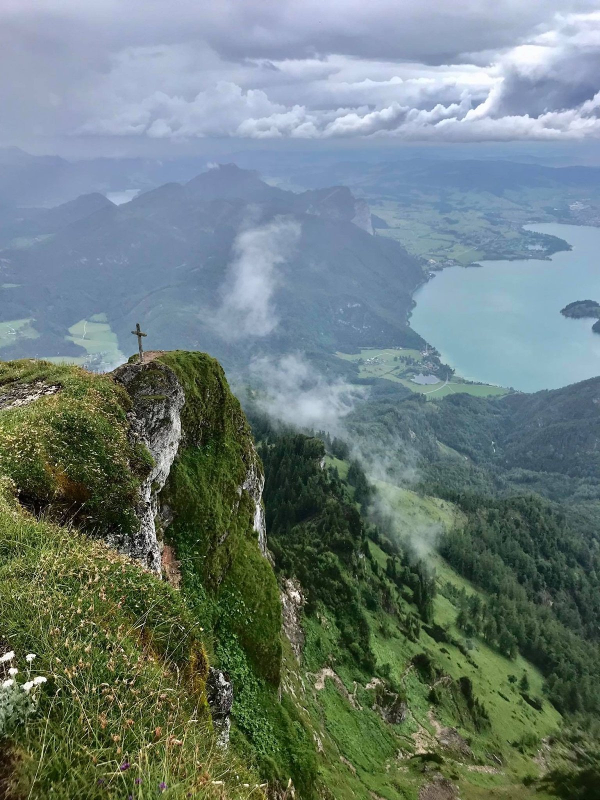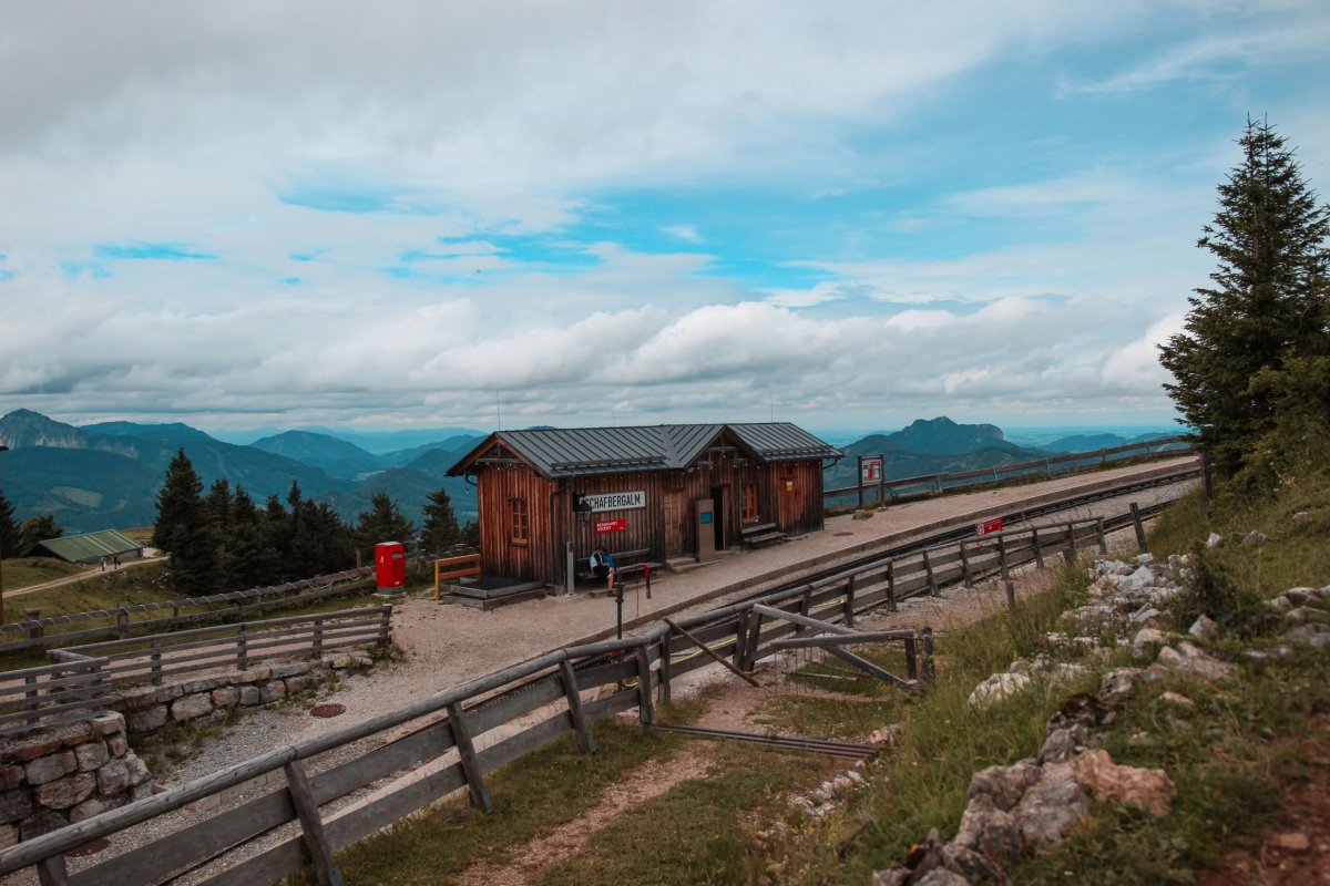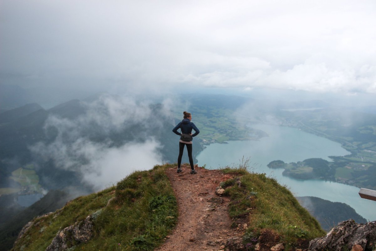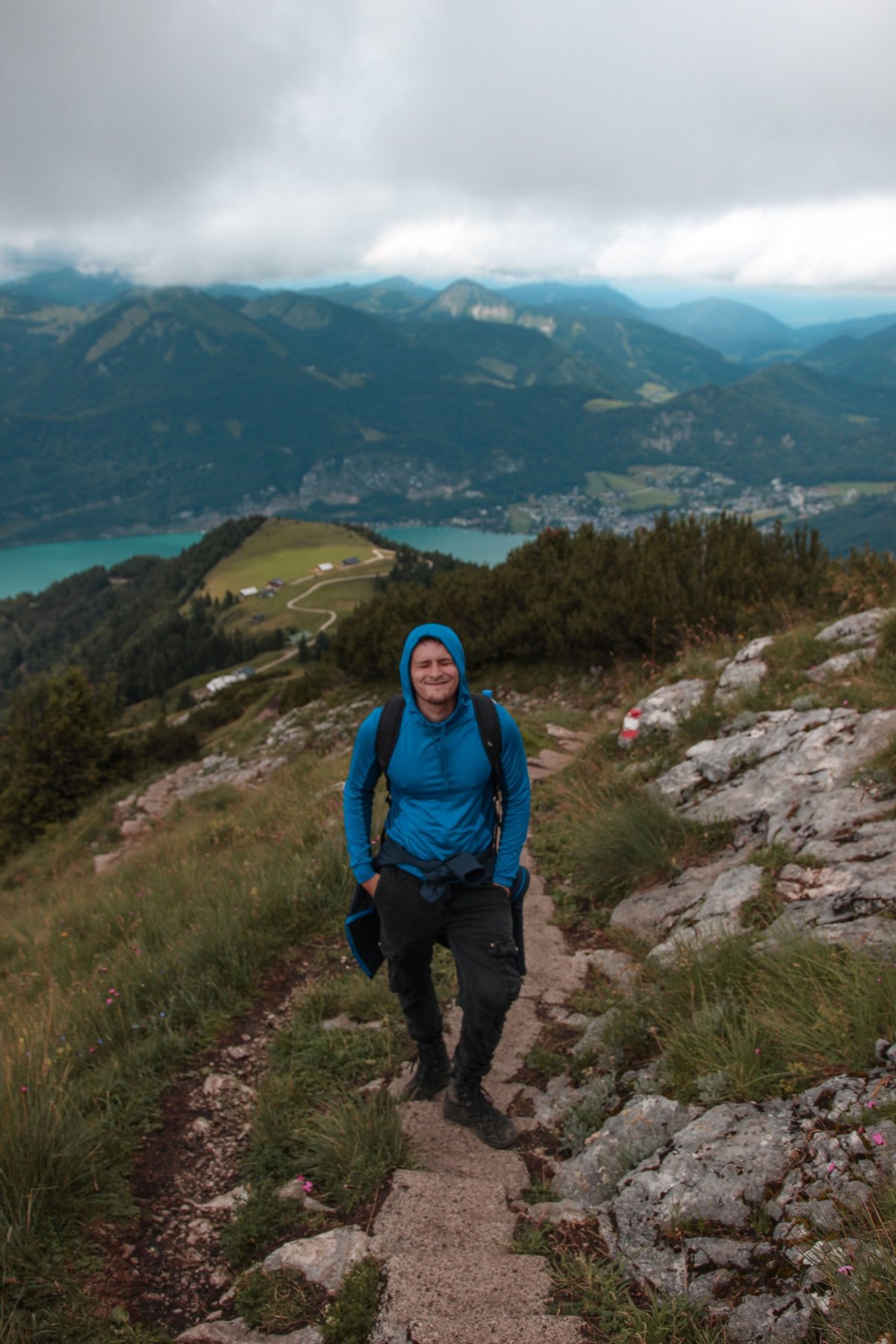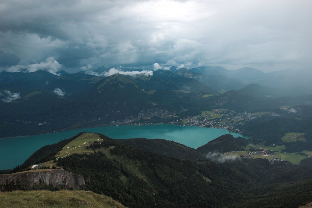 Auto necháváme zaparkované na veřejném neplaceném parkovišti ve vesničce Winkl, odkud i vycházíme na celodenní trek na Schafberg. Schafberg měří 1782 m.n.m a leží mezi třemi jezery. Mapy.cz se nám už několikrát osvědčily, takže vřele všem doporučuji si je stáhnout a jít podle nich, protože nikdy zatím nezklamaly! Ukázaly nám, že cesta nahoru by měla být cca 7 km dlouhá, což se nám ze začátku zdála být celkem "pohodajahoda."Ale realita byla trošku jinde, už po prvním kilometru jsme byli celí spocení, zadýchaní a unavení a cesta byla doslova nekonečná. Vylézt nahoru bylo opravdu vyčerpávající a to si nepřipadáme jako nějaké bačkory. Nahoře nás kromě velkého deště a krav ( na ovčí hoře krávy, hmm) čekal i dechberoucí výhled, který za to utrpení určitě stál! Kdo nechce být škrt a chce si vyhodit z kopítka doporučuji dojít k zubačce do mezipatra a vyjet si nahoru, to musí být žůžo a člověk si ušetří nohy na další dny. Nahoře jsme si vytáhli vařič a ohřáli si obídek, pak se zašli zahřát do restaurace, kde jsme si pochutnali na štrúdlu, který zchramstnul všechny naše peníze určené na tento den a tak jsme se s prázdnými kapsami vydali směrem k vyhlídkám nafotit nějaké fotky a vydali jsme se na zpáteční cestu.