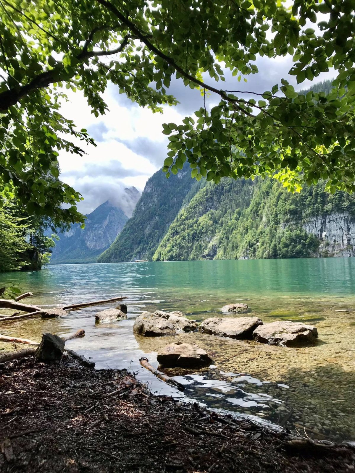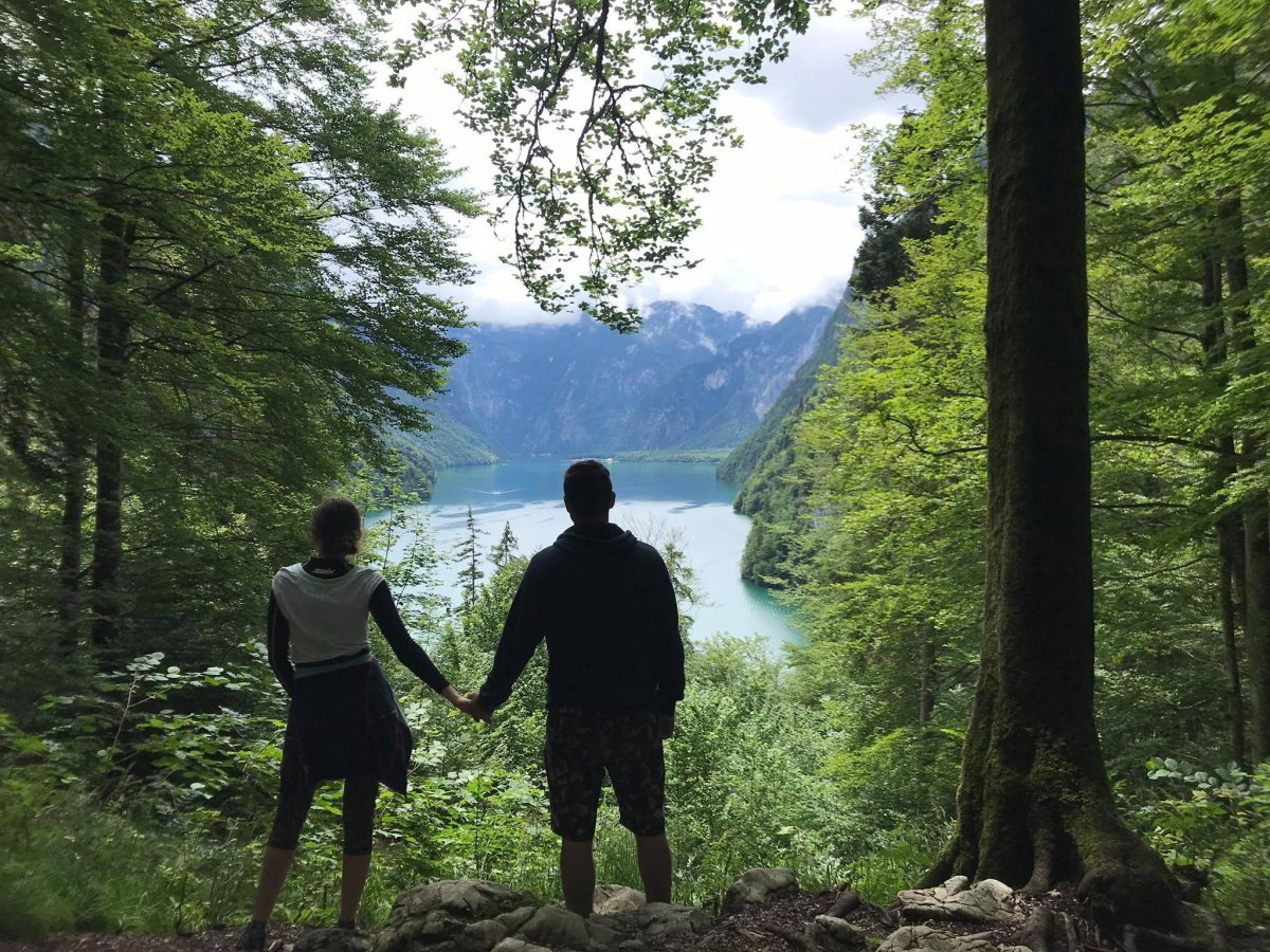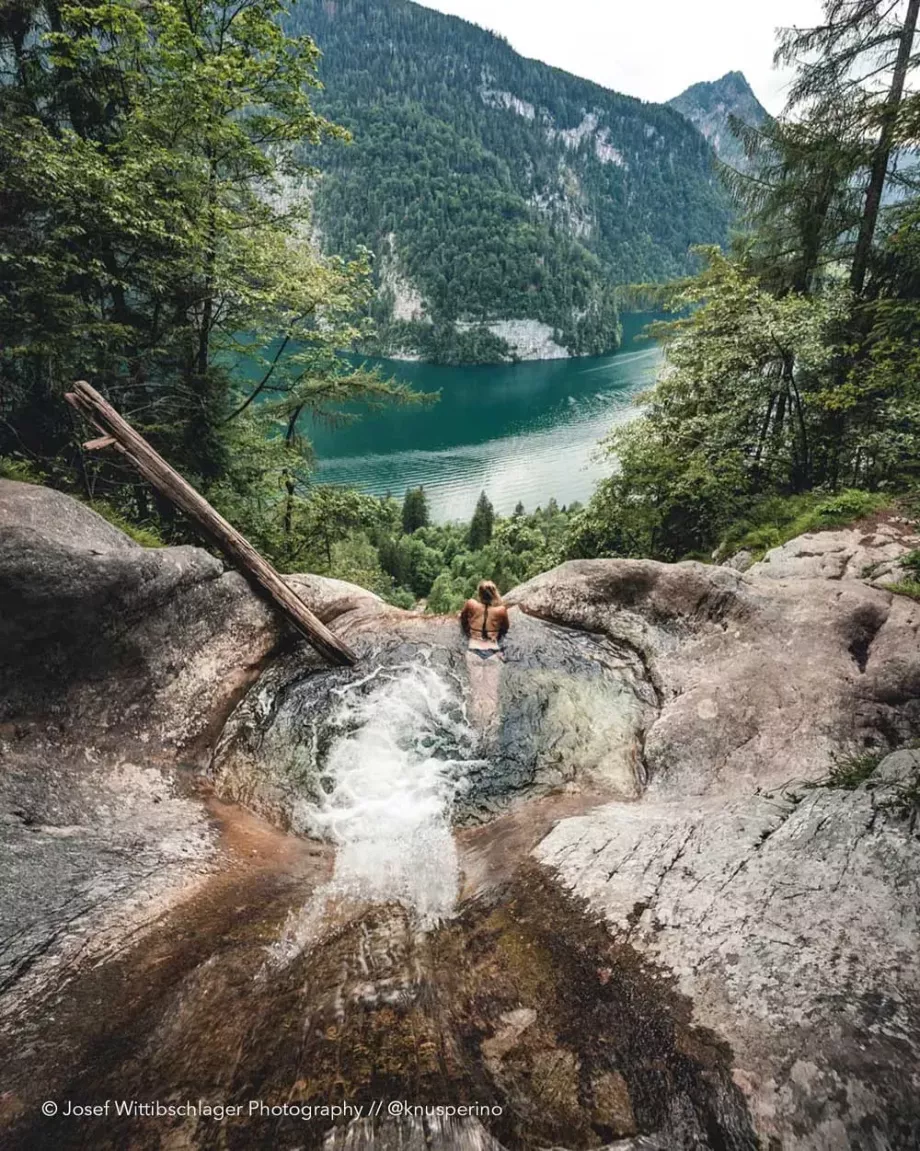 Třetí den jsme nocovali na odpočívadle v Salzburgu pod záštitou ASFINAGU, což je firma, která zařizuje na odpočívadlech pro lidi pitnou vodu a záchody zadarmo. Sprcha, která byla ve slušném stavu nás stála každého 1€ a voda tekla přibližně 10 minut. Po výšlapu Schafbergu se nám opravdu šikla a přišla nám vhod! Sice je přenocování na odpočívadlech tohoto tipu údajně zakázané ale my jsme rebelové a riskli jsme to. Osvětlení nám však svítilo přímo do okínek, takže kdo nemá vyřešené jakési závěsy, není to moc příjemné, neboť se na místě vystřídá mnoho čumilů, jejichž pozornost zaručeně získáte tím, když lezete z auta v pyžamu s kartáčkem v puse :D Ikdyž jsme se nevyspali úplně do růžova, přesunuli jsme se ráno do Německa, kde jsme navštívili jezero Königsee. Další tip na parkování zadarmo u Königsee je Mc Donald, kde jsme se s místním sympaťákem v Mekáči domluvili, že nám bude krýt záda a můžeme u nich na zaměstnaneckém parkovisku zaparkovat zadarmo. Díky dobří lidé :-) A tak se vydáváme podívat na jezírko, které nás ve výsledku docela zklamalo. Davy turistů šinoucí se po stejné cestě byly otravné. My jsme chtěli vidět "instagramový" ďolíček pod vodopádem, kde by se mělo dát koupat a být hezký výhled (foto1.) K našemu překvapení se po vylezení serpentíny objevila cedule, že je zde zákaz vstupu k vodopádu a blízké oblasti pod pokutou 25.000€. Takže jsme se otočili a šli zkusit spodní cestu podél jezera, co objevíme. Byl to sice trošku punk ale po cca 200m chůzí po kamenech ponořených ve vodě jsme došli k vodopádu zespoda. V té ledárně jsme jen smočili nohy a vrátili se pokochat se křišťálově modrým jezerem.