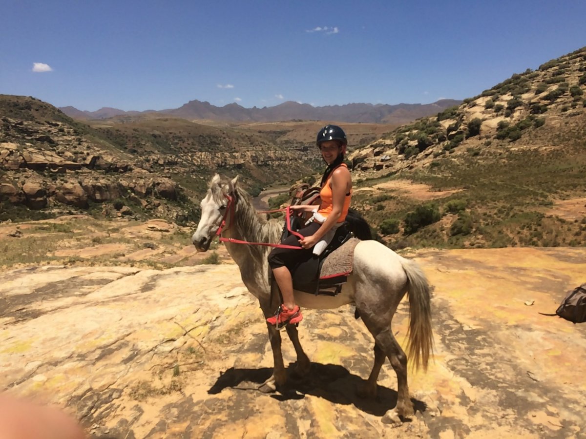 V Lesothu nás zaujala možnost objevovat okolí na koni, což je stále běžný způsob dopravy ve vesnicích. Na dopoledne jsme si proto domluvili půl denní výlet, který stál přímo v ubytování 375 RA/osoba. Na koni jsme předtím ani jeden sám nejeli, a tak proběhlo školení - Když chceš jet odprava, zatáhni za uzdu doprava. Když chceš jet doleva, zatáhl doleva. Když chceš zatavit, zatáhni za oba konce najednou a jeli jsme. No měla jsem z toho opravdu respekt a když jsme scházeli a vycházeli kamenité svahy po uzoučkých cestičkách na kterých se drolilo kamení, tak spíš až strach. Zastavili jsme u vodopádu, který ale kvůli suchu moc "nevodopádil". Od vodopádu jsme jeli ke skalám, ve kterých byly zachované křovácké malby. Bez průvodce bychom tohle místo jen těžko našli. Žádní další turisté tu nebyli, jen kupa místních dětí, které se mohly přetrhnout v předvádění. Objevovat krajinu na koni byl opravdu zážitek. Odpoledne jsme si ještě prošli okolí ubytování a nakoupili krémy s Aloe Vera, které tu roste, kam jen se podíváte. Večer jsme trávili poslechem kapely, která hrála na vlastnoručně vyrobené nástroje (kytara z kanystru na olej, buben ze sudu atd.), a pitím místního piva Maluti s dalšími baťůžkáři. Zaujal nás příběh Kanaďana, který až do ubytování na konci světa dojel stopem. Stopl si totiž dodavatele piva.