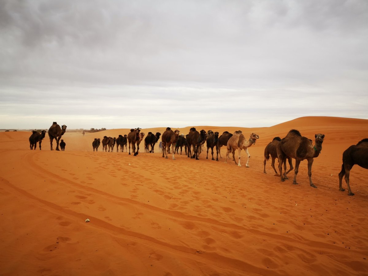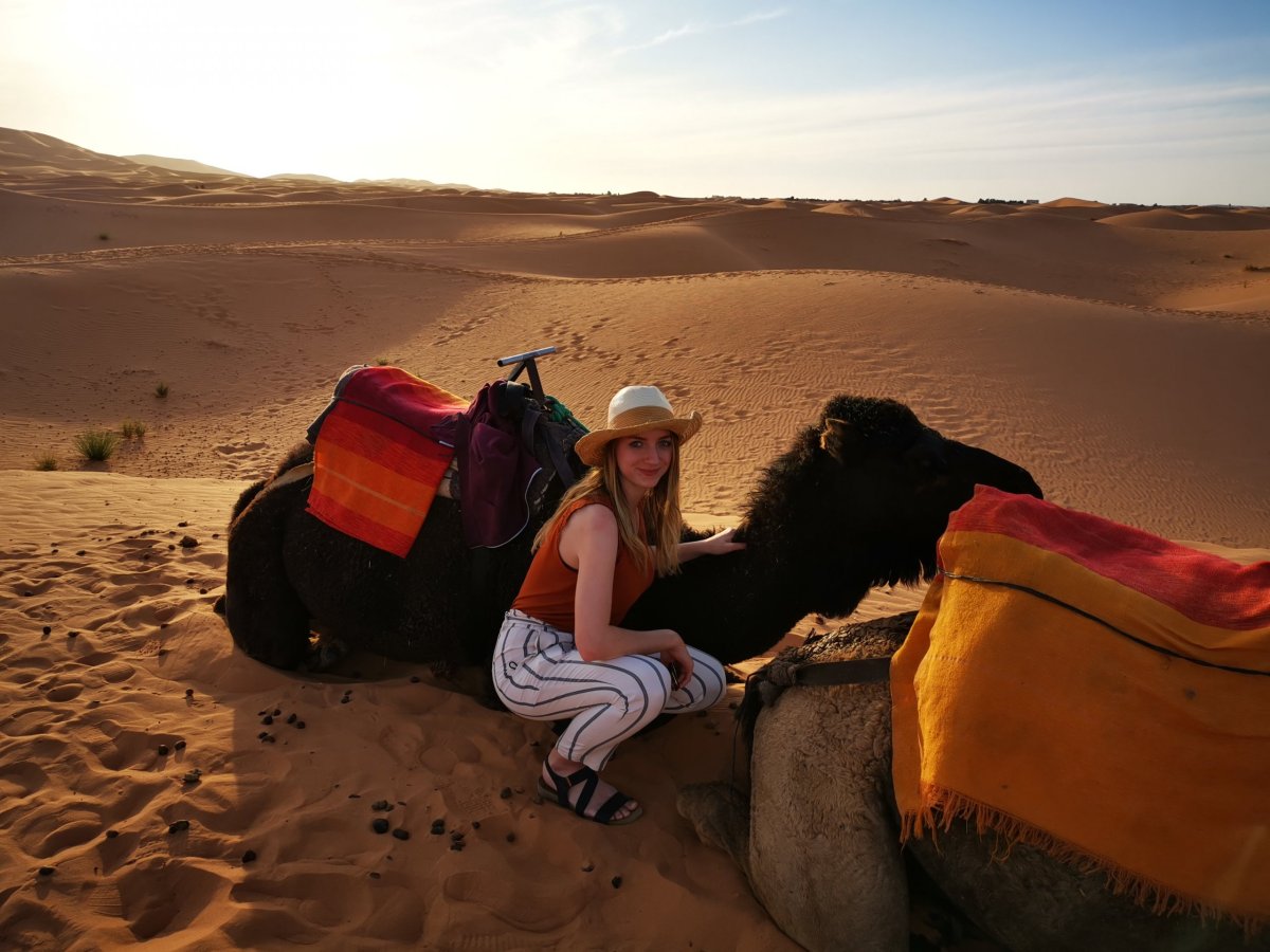 Ráno po snídani jsme vyrazili směrem do Merzougy na meeting point odkud jsme měli v 16 hodin vyrazit do pouště. Cestu jsme zajeli za 5 hodin. Výlet jsme neměli přes žádnou agenturu, pouze jsme si rezervovali ubytování v Berber Campu na Bookingu. Navzdory tomu, že cesta byla dlouhá, užívali jsme si jí nevšedními výhledy. Samozřejmě jsme párkrát zastavili na rychlofocení. Pokud jste fotomaniaci, cesta se vám může o dost protáhnout. Na místo setkání jsme dojeli s předstihem a už tam jsme se mohli kochat pohledy na písečné duny a na velbloudy. Majitel ubytování nás vyzvedl a zavezl k velbloudům. Věci jsme si nechali odvést do kempu abychom je nemuseli tahat na velbloudovi. Než jsme dorazili do kempu měli jsme asi 2 hodiny přestávku na sjíždění písečných dun, focení a procházení po poušti. Bylo to naprosto úžasné. Po západu slunce jsme jeli do tábora. Po příjezdu jsme dostali čaj, ubytovali jsme se v luxusním stanu s vlastním sociálním zařízením a pak jsme šli posedět a pobavit se s ostatními u ohně. Ve 20 hodin se podávala večeře. Připravili si pro nás pořádnou hostinu. Měli jsme plný stůl jídla. Všechno jsme ani neměli šanci sníst. Mě osobně marocká kuchyně příliš neoslovila, přišla mi moc nedochucená, ale každý má jiné chutě. Po večeři nás zaměstnanci kempu bavili tancem, zpěvem a bubnováním. Bylo to moc fajn. Ve stanech jsou teplé peřiny, a ještě navíc deky, protože v noci je dost zima.