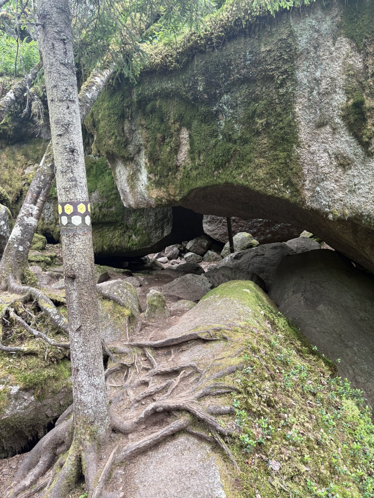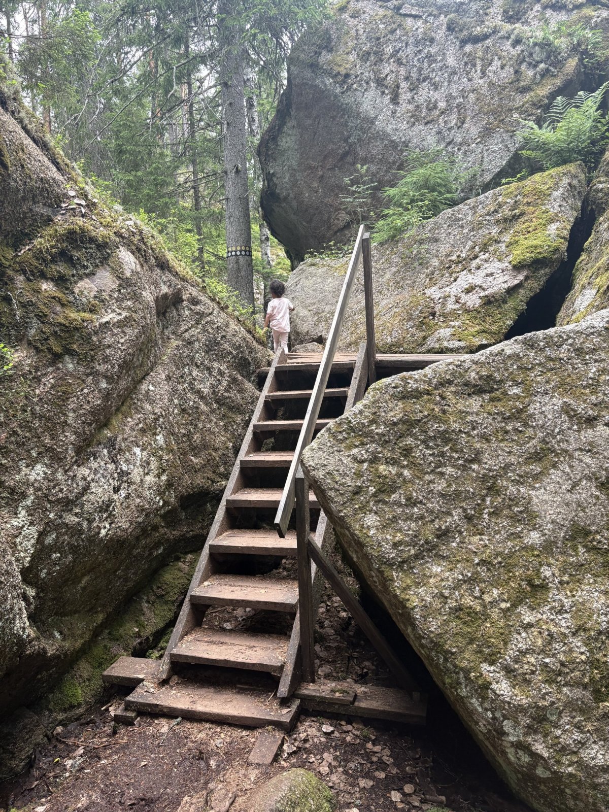 Po obede sa presúvame na hlavné parkovisko v národnom parku. Pani z informačného centra parku nám poradí krátky okruh na 1,5-2 hodiny, ale s mierne náročným terénom. Polite sa rozhodne radšej prechádzať s kočíkom po chodníkoch pri parkovisku, takže na túru vyrážame len ja a Kristínka. Cesta vedie pomedzi balvany, po rebríkoch a drevených chodníčkoch, kde Kristínku baví držať rovnováhu. Neviem, kto odhadoval ten čas, ale moja malá zvládne okruh za hodinu aj so zachádzkou na vyhliadku a niekoľkými zastávkami na čučoriedky.