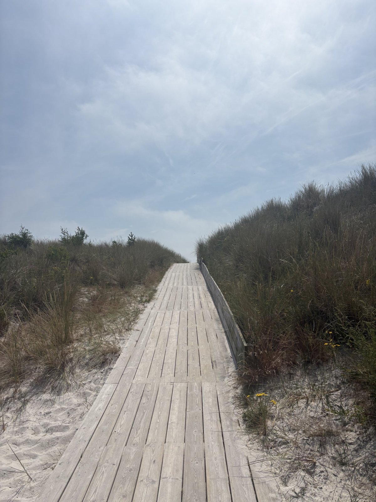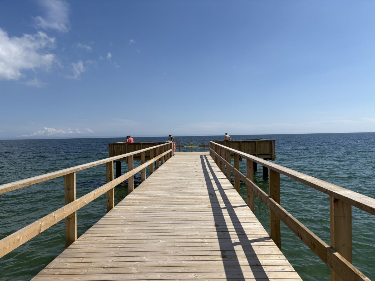 Presúvame sa na hlavnú mestskú pláž - dlhú, s bielym pieskom a priezračnou plytkou vodou, ktorú slnko stihlo trochu zohriať. Pri príchode zisťujeme, že zmizla Kristínkina šiltovka a topánky. Ďalšie obete tohtoročnej dovolenky. Ostávame chvíľu na pláži a hráme sa vo vode. No Polite sa necíti dobre, a tak sa rozhodneme ísť domov pomerne skoro. Na parkovisku nás zaujme turistický vláčik, ktorý zadarmo vozí ľudí po meste. Ja s Kristínkou nastúpime a Polite naloží Nathiho a veci do auta. Stretneme sa o 15 minút na jednej zo zastávok.