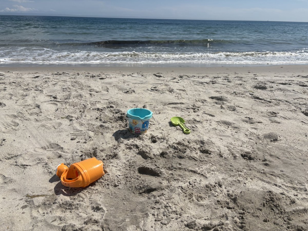 Keď dorazíme, je už úplne jasno, bezvetrie a more je pokojné. Vyberáme povinnú výbavu - krhličku, vedierko, lopatku - a ideme na pláž. Nathi leží na deke a sleduje okolie, Kristínka sa hrá v piesku a občas vbehne po kolená do vody. Ja si skúsim zaplávať, ale po pár sekundách vychádzam von. Voda je ľadová a mrznú mi aj časti tela, o ktorých som netušila, že ich mám. Po pár hodinách sa zbalíme a rozdelíme - Polite s Kristínkou ostanú na ihrisku pri pláži a ja beriem Nathiho na prechádzku v kočíku po pobreží až do centra, kam oni prídu autom.