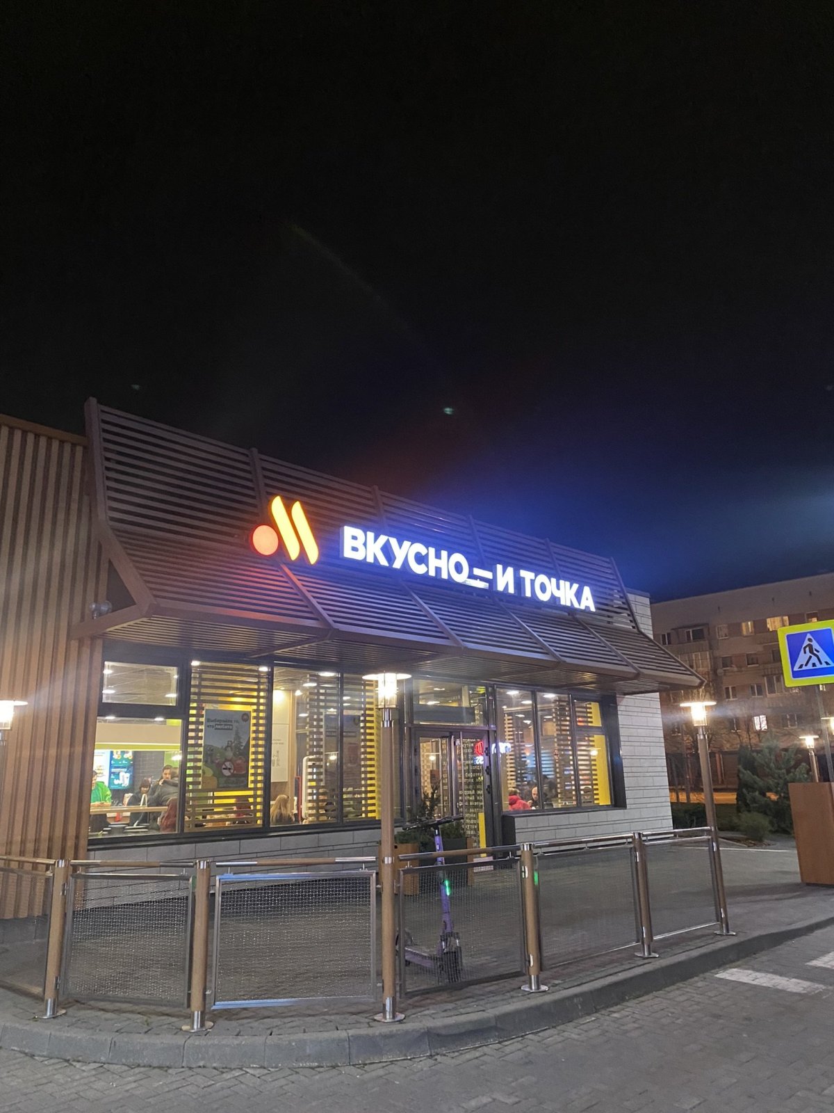 Po hodinovém zpoždění poblíž autobusového nádraží je otevřená jen jediná věc, ruský McDonalds, který je přejmenovaný na "Chutně a tečka", ačkoliv fastfood, který je i u nás při cestování nevyhledávám, nebyla jiná možnost a zkusit napodobeninu bylo nakonec zajímavé, jen pro info, hranolky a nuggetky chutnaly hodně jinak, co si pamatuji z našeho Mekáče a ceny byly opravdu lidové. Tak jsme si přisedli s Matějem k Michalovi a ještě pokecali.