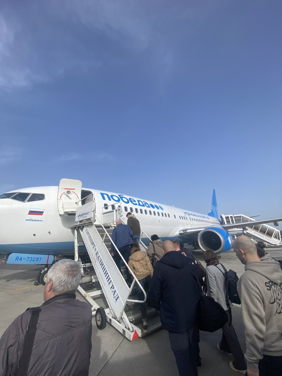 Ráno čekáme na taxi, které bylo levnější, než autobus, když cenu rozdělíme na osobu. Letenku jsme si koupili každý sám a různě, já jsem použil aplikaci Aviasales, kde berou západní karty, přes aplikaci mě to vzalo na stránku ubfly link - https://www.ubfly.com/. Kde jsem si letenku Kaliningrad-Moskva za cenu 2700 Kč koupil, vše přišlo v pořádku, takže mohu doporučit. Opět jen upozorňuji, letenka se nedá koupit přes oficiální stránky kvůli sankcím, nelze platit kartou jinou, než MIR, kterou nemáme. Let byl jinak pohodový, trval tři hodiny, déle, než normálně, letadla ruských společností mají totiž zakázáno létat nad vzdušným prostorem EU.