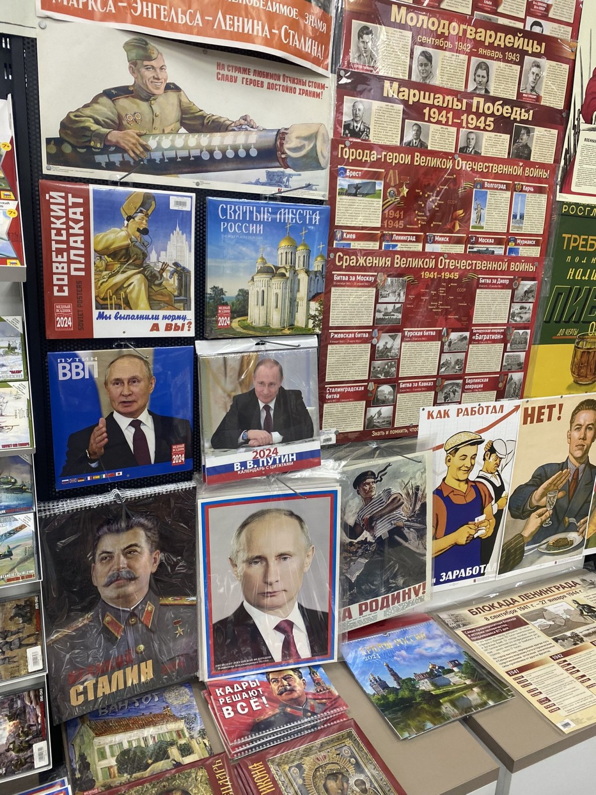 "různé suvenýry, včetně Putina/Stalina, zde se na historii nahlíží jinak, představte si, že, v Berlíně koupíte kalendář s Hitlerem "