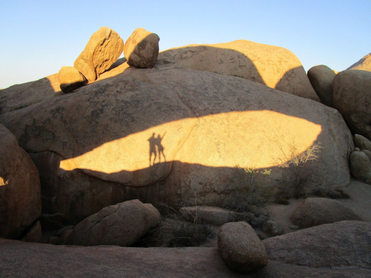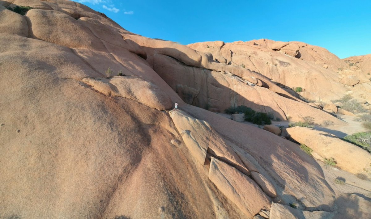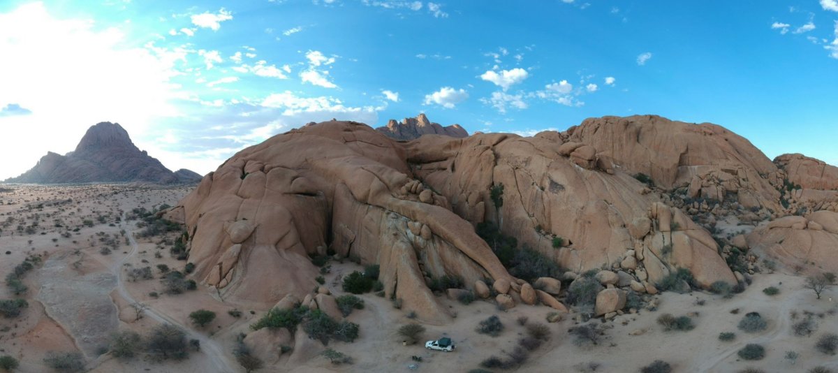 Vyrážíme směr Spitzkoppe, čeká nás asi dvouhodinová cesta. Přijíždíme tak, jak jsme si přáli, za světla. Po zaplacení vstupního poplatku na recepci dostáváme zevrubný plán oblasti s vyznačenými kempovacími místy. Oproti ostatním kempům se tento liší tím, že je velice rozlehlý, kempovací místa jsou od sebe daleko a každý si může to svoje vybrat. Kdo dřív přijde, ten dřív bere. Po vybrání vašeho místa si tam můžete umístit židle, čímž dáváte najevo, že je zabráno. Trochu mi to připomnělo ranní rozmisťování ručníků na lehátka v all inclusive hotelech v Řecku. Jediný rozdíl je ten, že ve Spitzkoppe je přímo psáno, že tento přístup je správný. Po pročtení recenzí na Tripadvisoru se vydáváme směr kempovací místo jménem Swakop 2 a jsme spokojeni. Suchý záchod a koš je jediné vybavení kempovacího místa. Rozkládáme stan. Trošku si zalezu po skalách a proletím s dronem, ale nejsem si jistý, jestli neporušuji zákon. Jelikož ale nikde nikdo není, tak mě to ani moc netrápí. Po 15 minutách přistávám s vyšťavenou baterkou a vyrážíme pěšky na recepci, kde si dáme večeři. Během přípravy večeře se osprchujeme, poté rychle povečeříme podprůměrné boloňské špagety a sledujeme západ slunce. Ten by byl mnohem zajímavější snad odkudkoliv jinde, jen ne od recepce. Bohužel. Zase jsme ho nestihli na lepším místě. Ve Spitzkoppe je přes noc opravdu příjemné teplo. Po ulehnutí vidíme nějakého šakala v klidu se procházejícího kolem našeho stanu. Sice měly být ve Spitzkoppe fakt super hvězdy, ale už jsem za tu dovolenou viděl lepší.