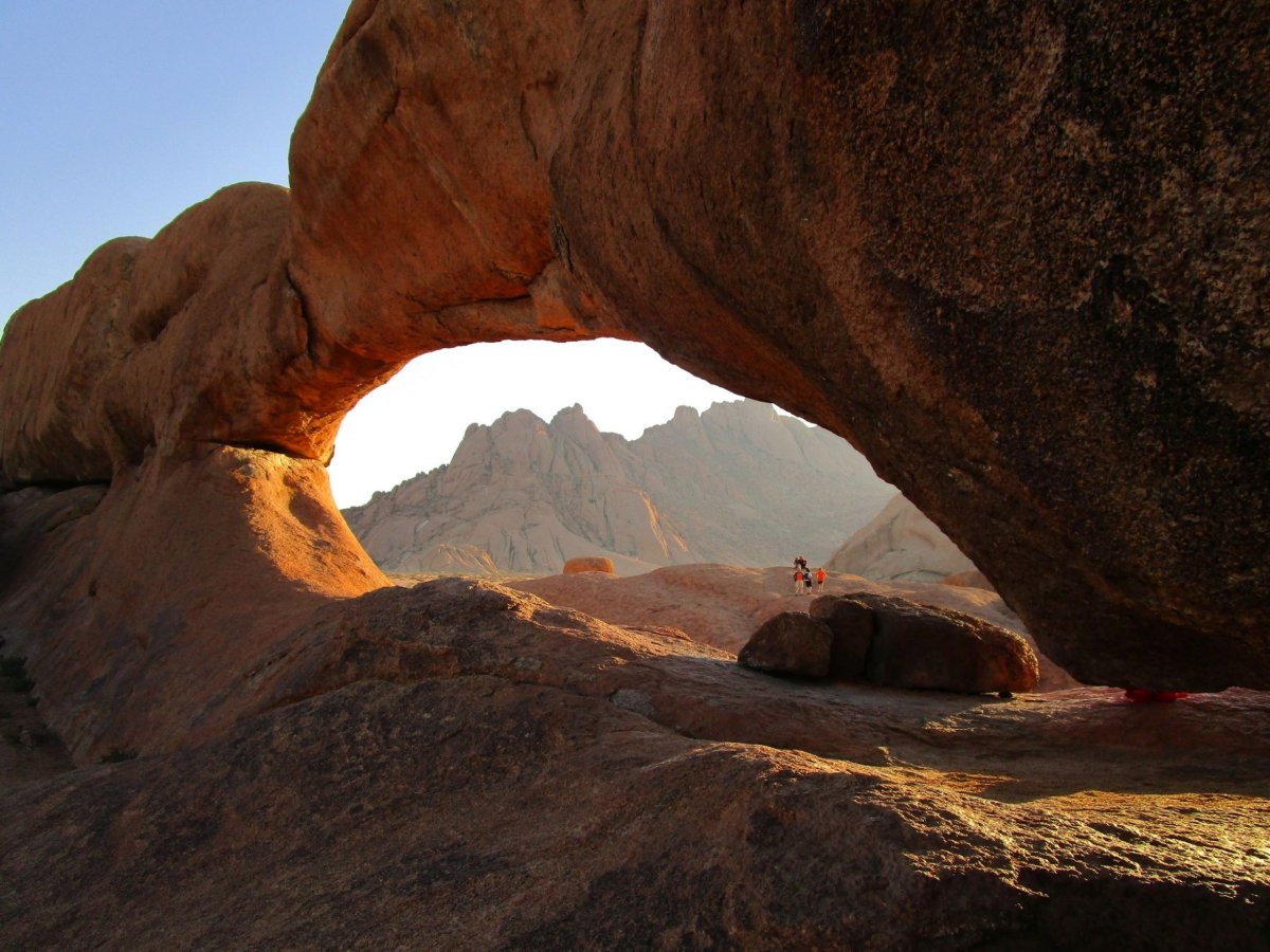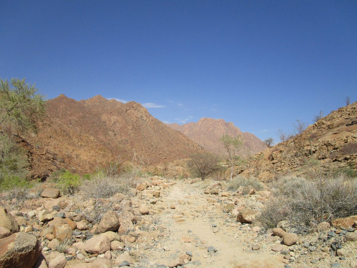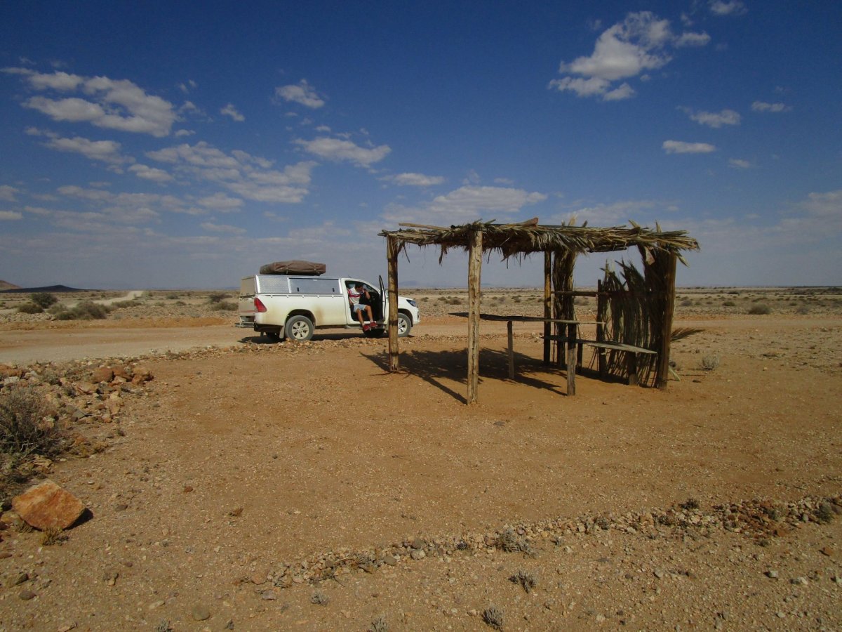 Další den vyrážíme z kempu v Henties Bay do Spitzkoppe, zažili jsme další chladnou noc a probouzíme se do velmi husté mlhy. Daří se nám vyrážet poměrně brzy s plánem, že do kempu ve Spitzkoppe chceme opět přijet za světla. Chvíli jedeme podél pobřeží, poté uhýbáme z asfaltové cesty doprava směr vesnička Uis, kde plánujeme něco nakoupit a z vesničky trochu odbočit z cesty směr hora Königstein (rezervace Branderberg). Po krátkém stoupání mlha mizí a objevuje se sluníčko, konečně přestáváme v autě topit a po chvíli stisknu tlačítko A/C. Ta změna byla poměrně rychlá, ale promrzlí z noci jsme za ni rádi. Aspoň nám rychle uschnou boty, které nám v noci navlhly. Během dovolené v Namibii nejsme schopni se poučit a boty necháváme vždy pod žebříkem do stanu. Jak se ukázalo v NP Etosha, hrozba vlhkých bot není to nejhorší, co se s nimi přes noc může stát. Přijíždíme do vesničky Uis, kde je pár restaurací a obchod. Vidíme dost lidí před obchodem a nějak vůbec nemám náladu si koupit drahé kameny a ořechy, takže se rozhodujeme, že nejdřív zajedeme k hoře Königstein a nakoupíme až poté. Po cestě se ještě zastavujeme na zkratce, která nám ušetřila cestu asi o jeden kilometr, ale prodloužila tak o půl hodiny. Nicméně byla to zajímavá cesta plná ostrých kamenů, takže o zábavu bylo postaráno. Po příjezdu k hoře jsme uvítáni pánem, kterého jediná starost je jeho vlastní prospěch, ostatně jako většiny lidí v Namibii. Tohle mě na Africe štve. V Ghaně ale bylo tolik lidí, že byli na odmítání ze strany turistů zvyklí, protože jste v jednu chvíli najednou odmítali 10 lidí. Jelikož ale v Namibii je lidí málo, tak je to odmítání mnohem těžší. Jeho požadavek však je jiný. Potřebuje, abychom po cestě zpět do vesničky Uis odvezli jeho dvě děti, zítra prý začíná škola. Trochu mě to udivuje, protože zrovna byla sobota, ale po krátké poradě se rozhodujeme, že do toho půjdeme. Všichni by byli asi nejšťastnější, kdybychom si návštěvu hor rozmysleli a vyrazili rovnou zpět, ale my se vydáváme vstříc horám. Je tam pár stánků s klasickými suvenýry, kupodivu nám nikdo nic nenutí. Jedna skupinka turistů sedí v přístřešku. Občerstvení se zakoupit nikde nedá. Od jiného pána se dozvídáme, že do hor se dá jít pěšky a že je to na dlouho. Jelikož náš opalovací krém zůstal v Praze na letišti a moc času nemáme, uděláme pár fotek a jedeme zase zpět. Nabíráme dva teenagery. Ve vesničce Uis vybíráme restauraci, dáváme si chutný oběd a máme v plánu jít nakoupit. Z restaurace je na daný obchod výhled a já jsem potěšen tím, že už před obchodem není tolik lidí, jako před tím. Potěšení brzy ustupuje, protože zjišťuji, že v sobotu zavírají ve 13:00 a již je zavřeno.