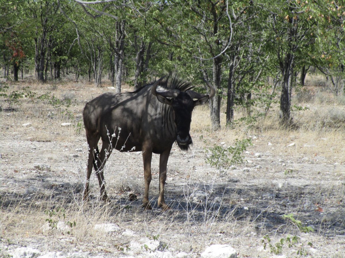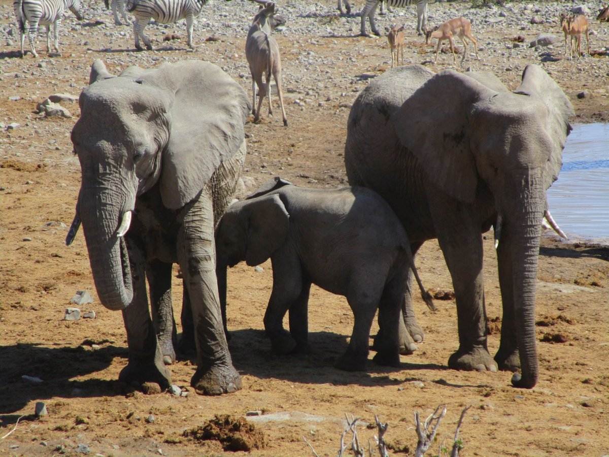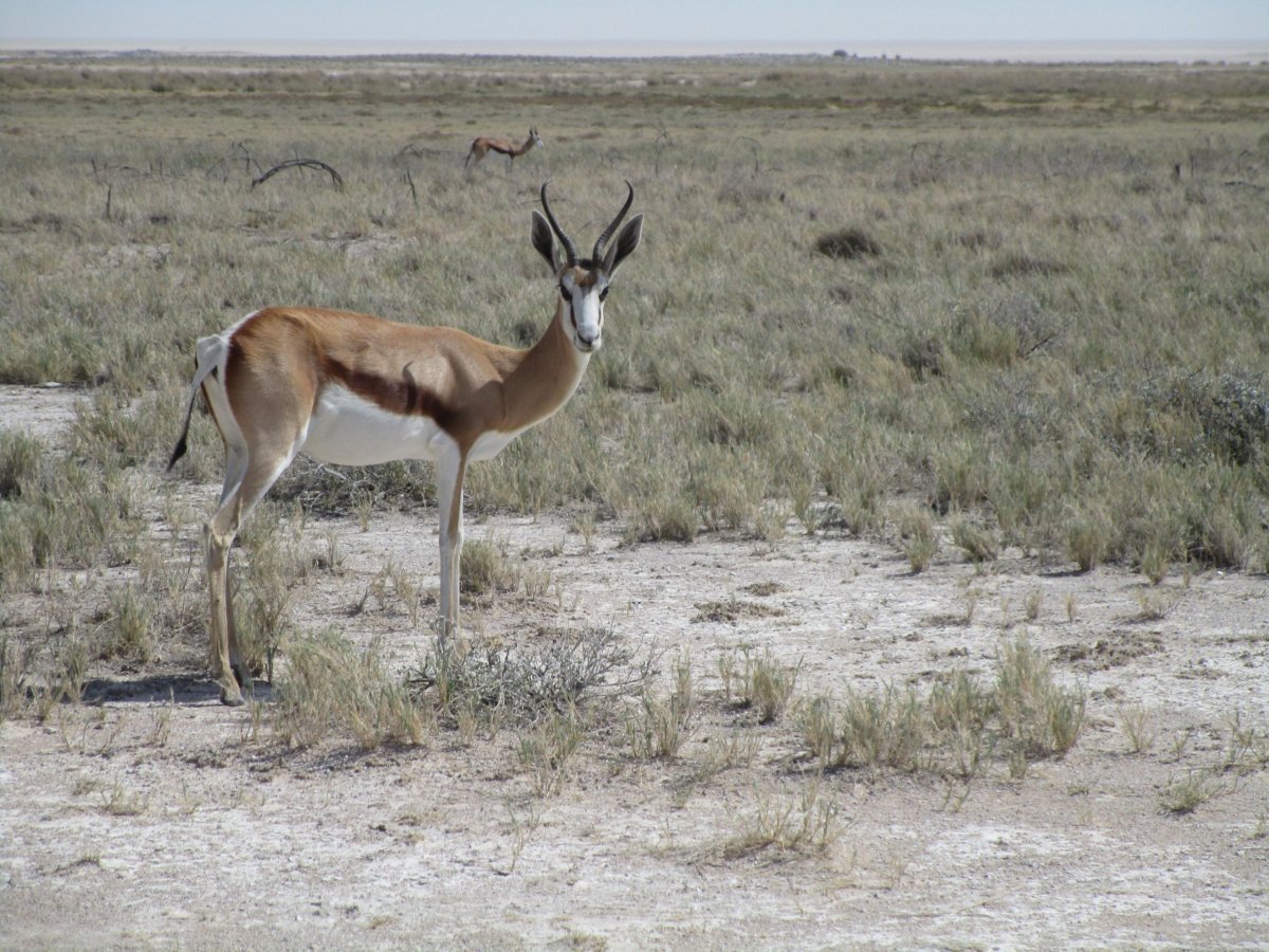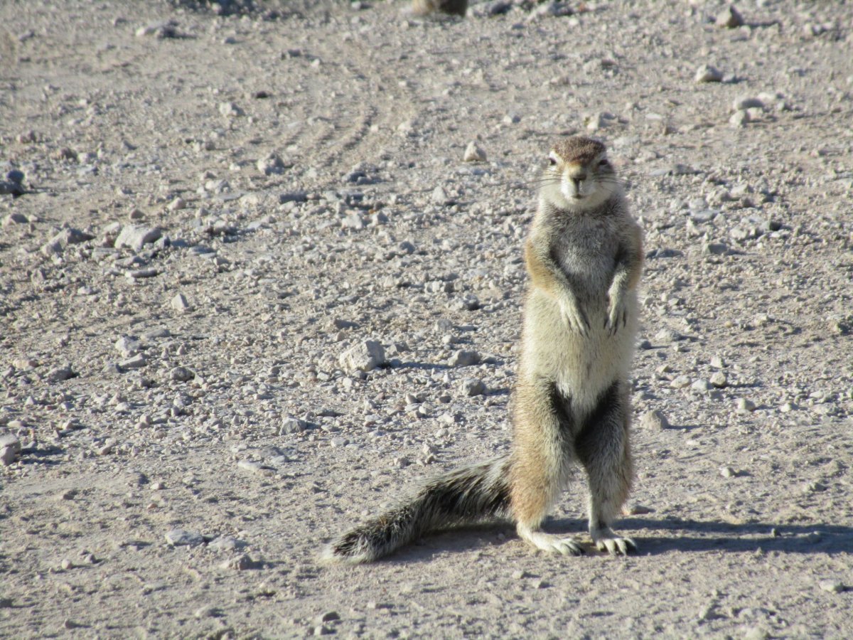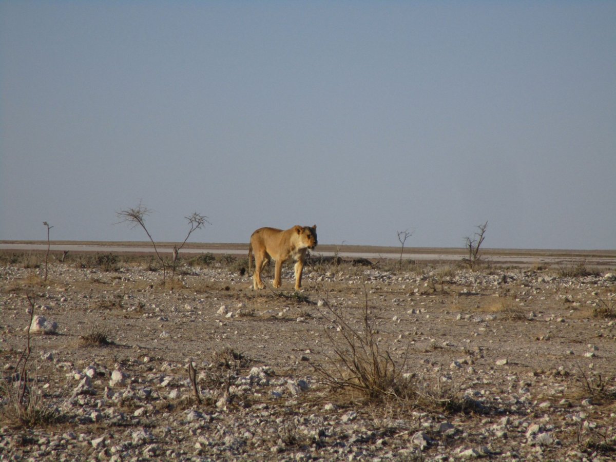 A jedem do toho nejočekávanějšího, národního parku Etosha. Cesta je celkem dlouhá, ale většina asfaltová, což jsem fakt ocenil. Po cestě se stavujeme na obědě ve městečku Outjo v restauraci FARMhouse Restaurant B&B, kterou musím doporučit. Krásné prostředí, normální ceny a steak ze zebry mi chutnal. Jediné, co mě trochu překvapilo, byly placené toalety. Asi hodinu před Etoshou nám přes silnici přebíhají nějaké opice, poté si je můžeme prohlídnout z poměrně velké blízkosti. Ale jsou plaché, úplně příblížit se k nim nedalo. Do kempu Okaukuejo jsme přijeli celkem včas, a tak po zaplacení vstupních poplatků a registraci v kepmu jsme ještě stihli vyrazit na projížďku. Zvířat je všude vidět dostatek, bohužel vůbec nevíme jména těch méně známých. Pamatuji si kudu, pak nějaké asi antilopy, dostatek zeber. K těm vzácnějším patří žirafy, sloni a především lvi. Lvy jsme viděli jen jednou, a to ten první den. Jednou jsme taky viděli gepardy. V kempu se přes noc proháněly nějaké psovité šelmy, trochu vypadali jak šakali, ale vůbec netuším, jak se jmenovali. Budu rád, když mi v komentářích někdo poradí, o koho se jednalo.