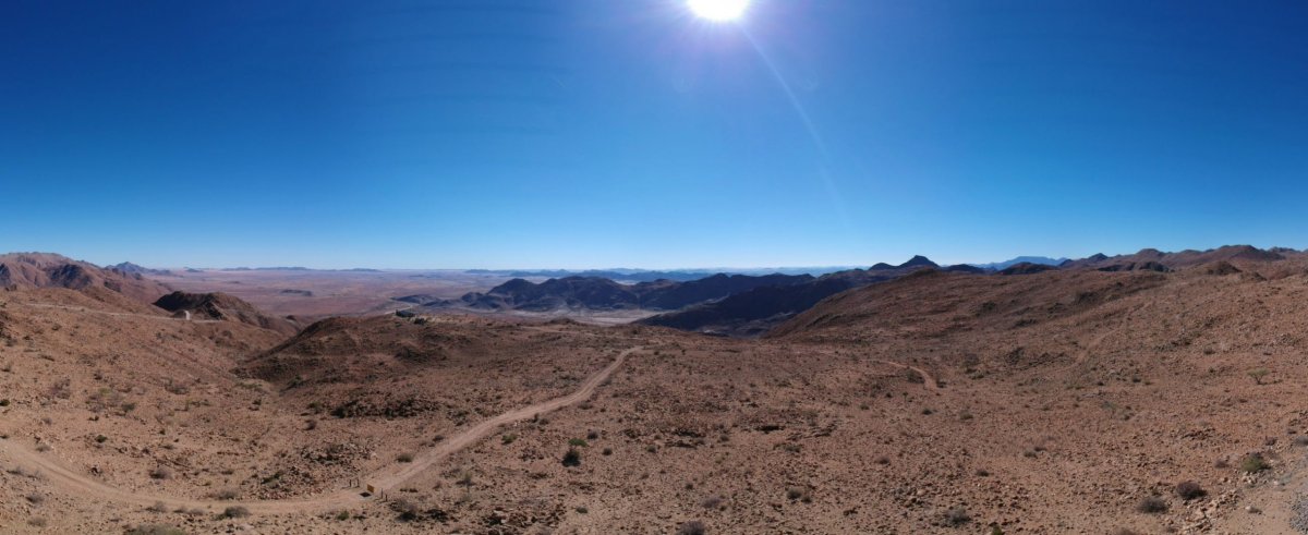 Po příletu na nás kromě nepříjemného překvapení v podobě ztraceného zavazadla čekal i pracovník z autopůjčovny, který nás odvezl do kanceláře, která leží asi dvacet minut jízdy z letiště směrem do hlavního města, Windhoeku. Vybrali jsme si hotovost z bankomatu na letišti (7000 NAD). Mimochodem, tento obnos nám krásně stačil na celých osm dní (samozřejmě někde jsme platili i kartou). Po cca dvouhodinové přebírce auta jsme se vydali do hlavního města. Tam jsme zavítali do supermarketu (prvního ze strany od letiště). Hlídač auta byl poměrně otravný (proti ostatním) a přidalo se k němu i několik dalších žebráků, kteří nás doprovodili až do supermarketu. Nakonec ze mě dostali 50 NAD, což je nejvyšší částka, kterou jsem za celý pobyt v Namibii někomu dal. Jelikož mě to natolik otrávilo, vrátili jsme se k autu bez nákupu, hlídačovi dali 20 NAD a jeli pryč. Hlídač auta se velice rozčiloval, že je to opravdu málo. Místní paní nám však řekla, že oni takovýmto dávají maximálně 2 NAD. Ideální částka od cizince je 10 - 20 NAD. Popojeli jsme o kus dál do pobočky největšího namibského operátora, MTC. Tam jsme si pořídili SIM kartu s mnoha volnými minutami, smskami a 3 GB dat za cca 200 NAD. Toto vystačilo úplně bohatě na celý pobyt. Poté jsme v jiném supermarketu koupili tekutiny a něco k jídlu (na večer) a vyrazili směr Solitaire. Po cestě jsme se zastavili na hezkém místě s výhledem, nebyli jsme sami.