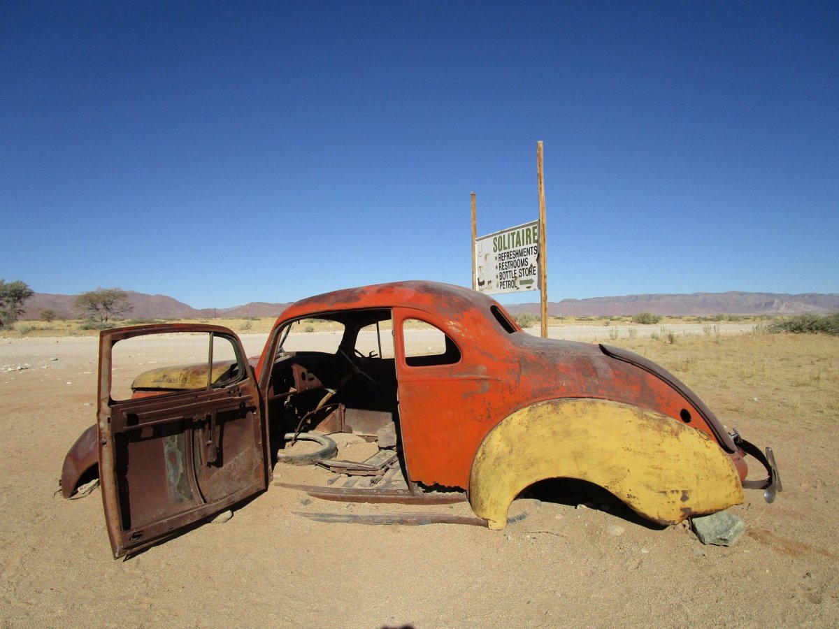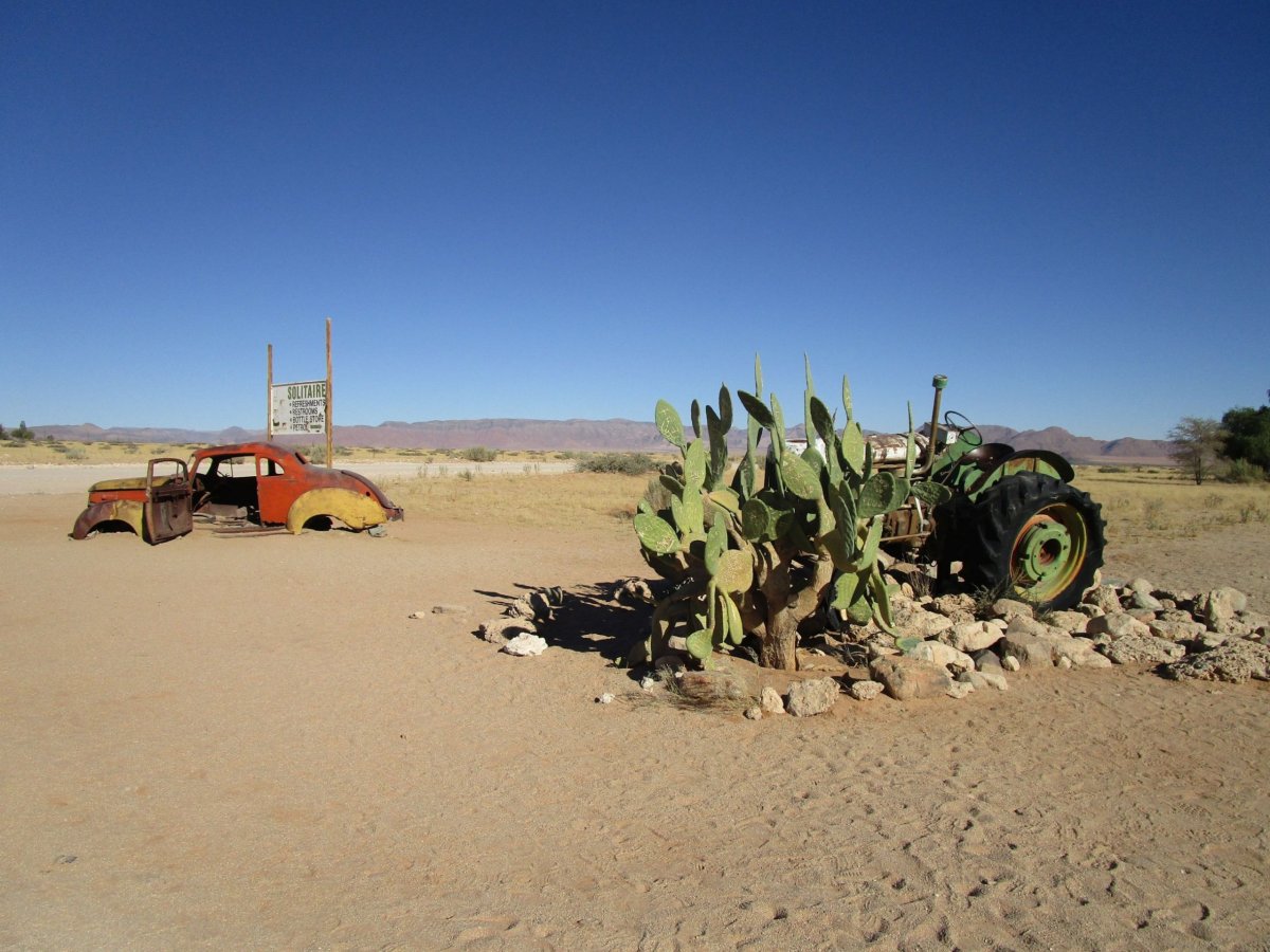 Po dalších x hodinách cesty jsme dorazili do zajímavé vesnice Solitaire. Kromě benzínové stanice a vyhlášené pekárny s ještě vyhlášenějším Apple Pie (rozhodně doporučuji) tam je plno fotogenických vraků aut. Obchod je spíše malý, s malým výběrem. To samé i v následujících vesnicích v okolí Sossusvlei, takže důrazně doporučují nákup dostatku surovin již ve Windhoeku.