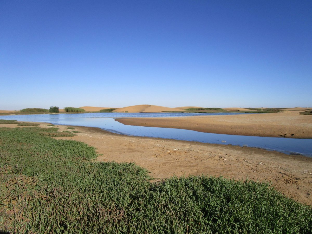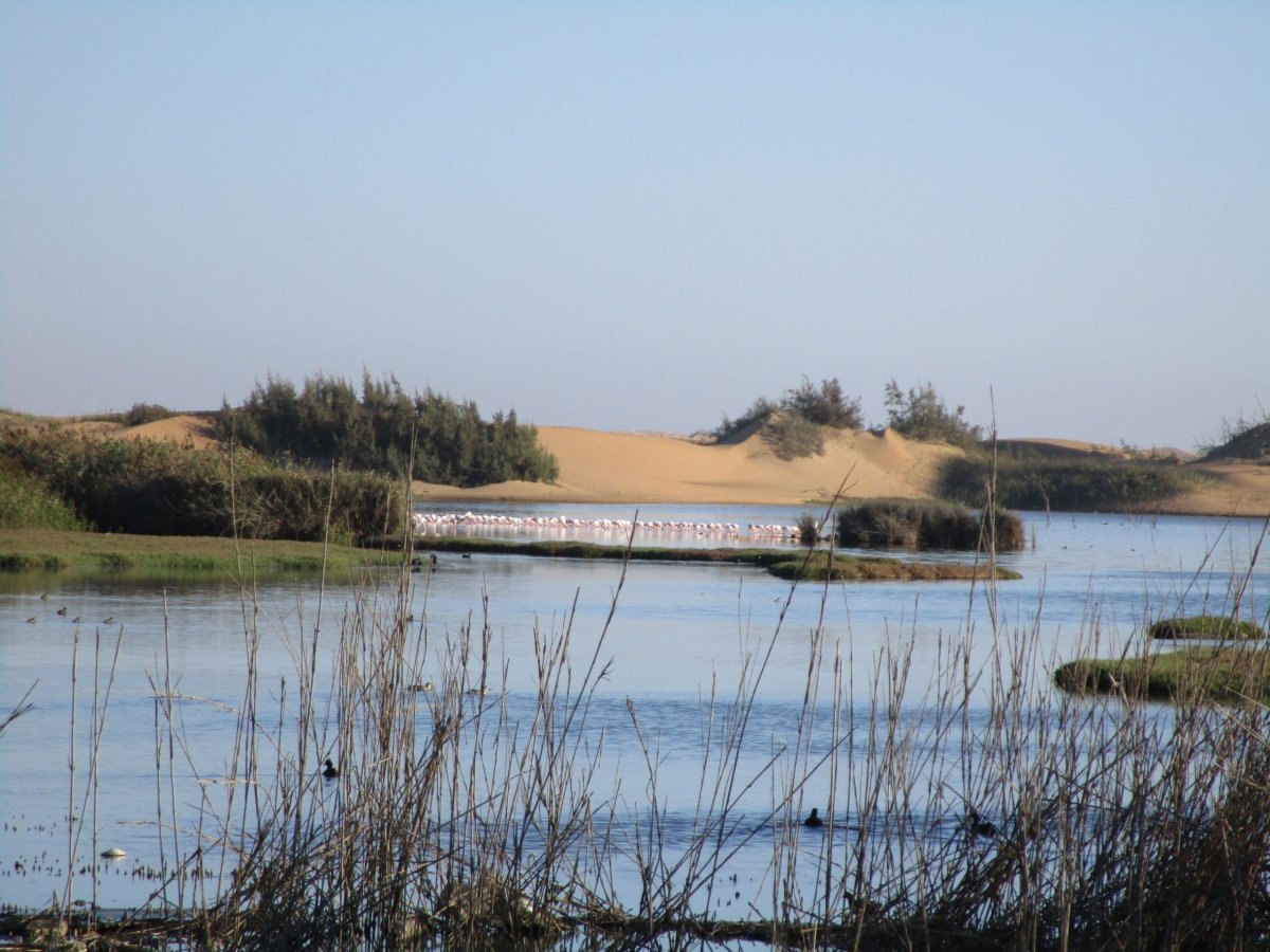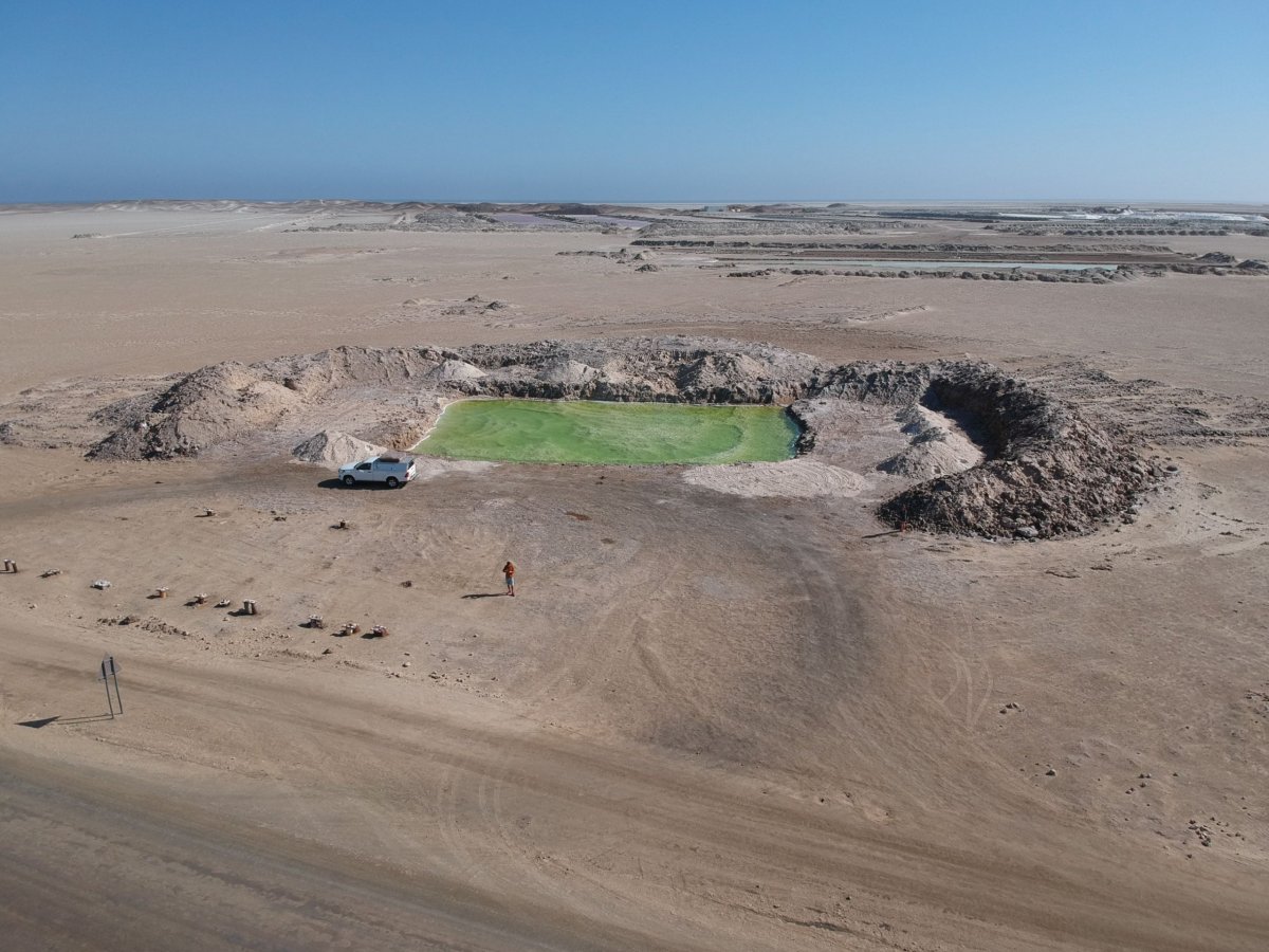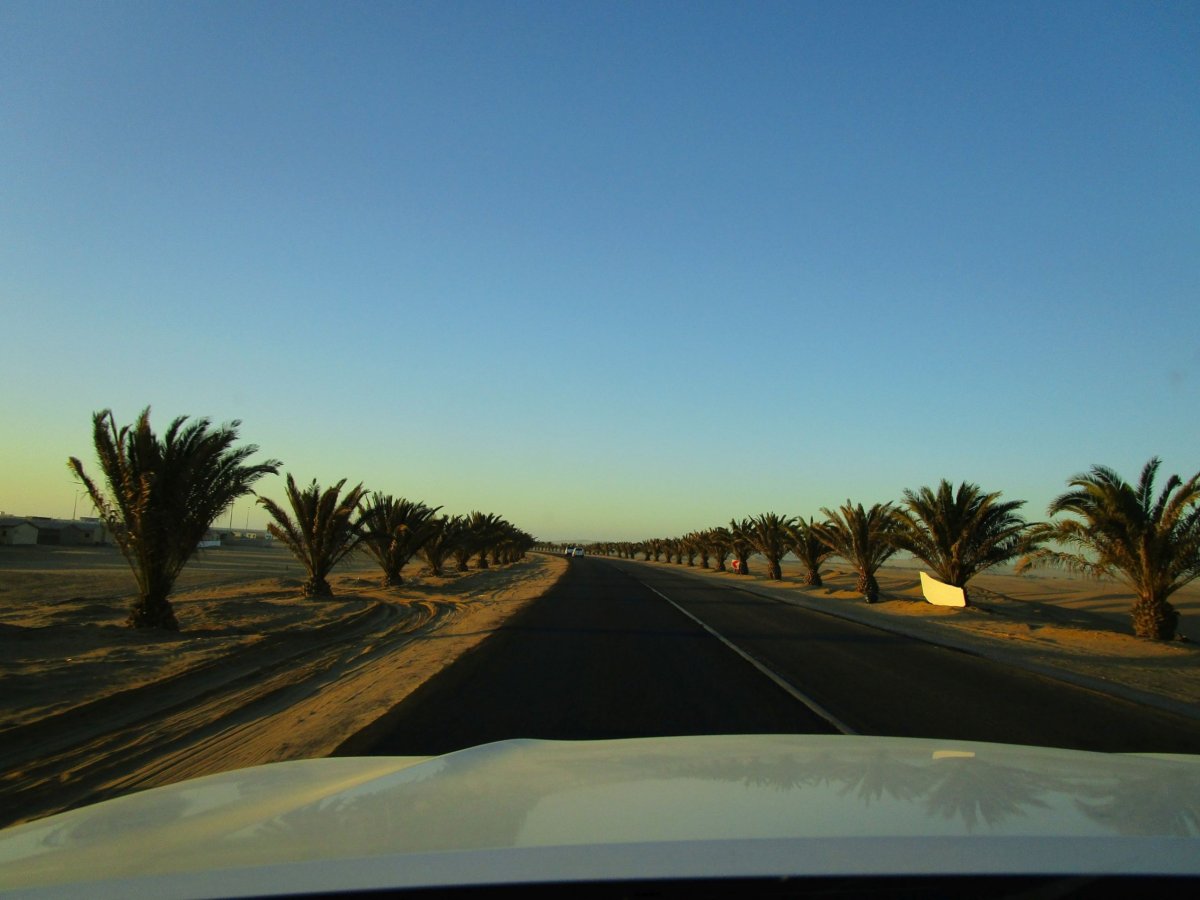 Po poměrně dlouhé cestě zvuk příchozí zprávy z Messengeru dává najevo, že se již blížíme k civilizaci, konkrétně ke městu Walvis Bay. Po levé straně vidíme nějaké rybníčky a hlouček lidí kolem jednoho auta. Rozhodujeme se zajet k rybníčku a obhlédnout situaci. Zapadlé auto, které na první pohled vypadá stejně, jako naše, ale není to 4x4. Hlouček asiatů okolo se snaží pomoci, později zjišťujeme, že jsou v okolí jen náhodou, ve skutečnosti se jedná o dva španělské turisty. Po chvíli přemýšlení se nám i včetně přihlížejících asijských turistů daří je vytáhnout ven. Poté si uděláme krátkou procházku okolo zajímavých rybníčků, v dálce jsou vidět plameňáci. Kdybychom měli víc času a energie, určitě by stálo za to se jít podívat k nim blíže. Dalekohled by se zde určitě také hodil.