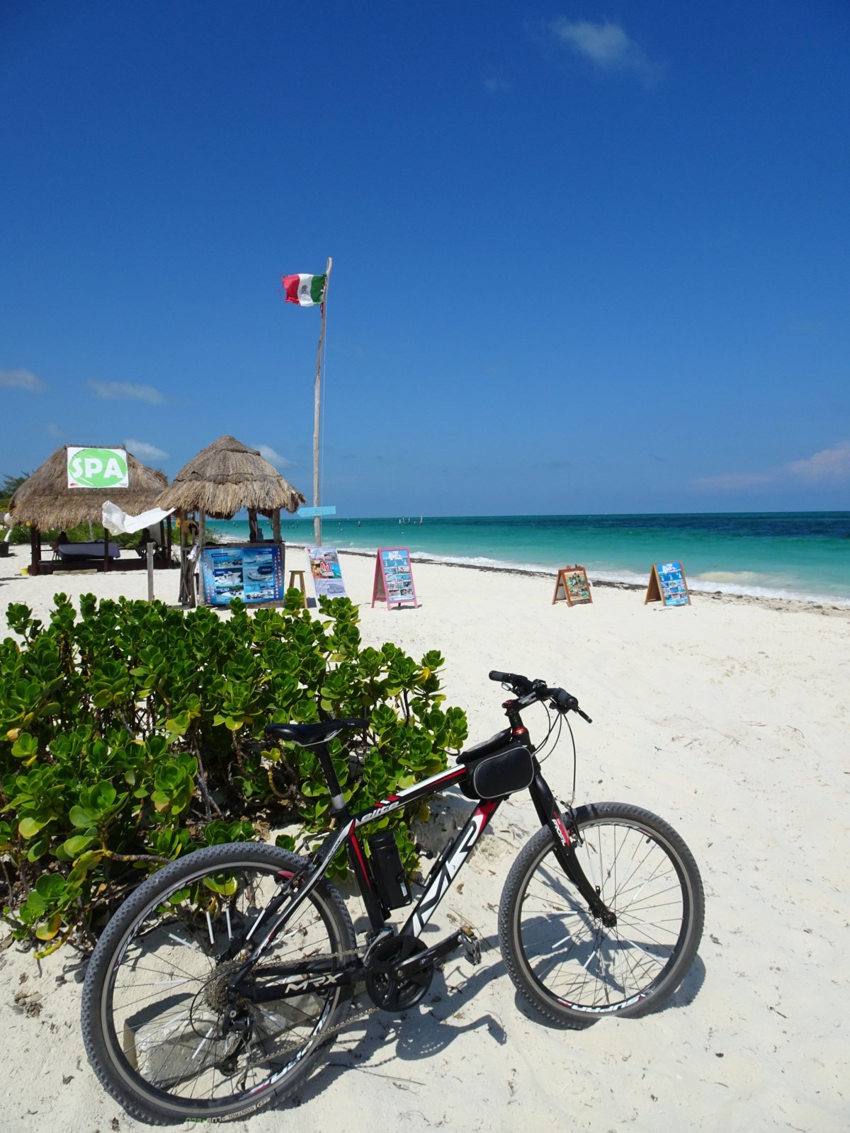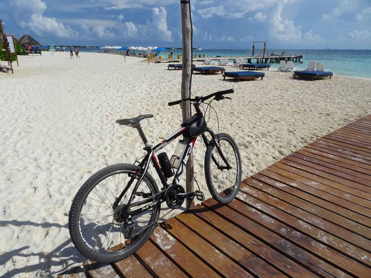 To snad ty supermarkety dělají naschvál. Opět akce na Svijanskej máz za 8,90 a následkem toho následující ráno, čerstvá zpáteční letenka Praha-Cancůn s odbaveným zavazadlem 23 kg za příjemných 8,5 tisíc. Je to sice jen na týden, ale co bych tam dýl dělal. Trochu to tam prošmejdím na kole, podívám se na pyramidy Mayů v Chichen Itza, zajedu na ostrov Mujeres, vykoupu se v canote Ik Kil a udělám výlet na kole na Playa del Carmen. Prostě takovej malej výletík do Mexika za desítku. V životě jsou někdy chvíle, kdy si člověk něco vymyslí, pak to realizuje a ono to nakonec dopadne mnohem lépe, než čekal. Přesně to je případ mého týdenního Mexického cyklovýletu. Na letišti v Cancůnu jsem opět, už rutinně předvedl taxikářům svoji show se sestavením bicyklu a odjezdu nezávislého člověka. Ubytování předčilo mé očekávání. Pěkné prostředí, klimatizace na pokoji, bazén a polopenze. To vše za 250,- Kč na den. Někdo by mohl namítnout, že to až taková láce není, ale já jsem s tím byl naprosto spokojen. Hned po snídani jsem se vydal na kole do oblasti Zona Hotelera. Je to taková úzká dlouhá šíje, kde jsou umístěny hotely a resorty s plážemi a golfovými hřištěmi na jedné straně, obrovské jezero na straně druhé. Je to úplný turistický průmysl, který splňuje i ty nejvyšší požadavky pro rekreaci. Počasí bylo nádherné, občas nějaký mráček, který byl spíše vítanou příležitostí pro osvěžení v jeho stínu. Projel jsem v pohodovém tempu celou oblast Zona Hotelera a skončil na nádherné městské pláži Playa Delfines. Večer už mě čekala na ubytování v restauraci výborná večeře. Následující den jsem si to po snídani namířil do 70 km vzdáleného městečka Playa del Carmen. Je to po rovině a tak to nebylo zase tak obtížné a pokud bych měl silničku, tak by stačilo v pohodě 2,5 hod, místo 3,5 na MTB. Playa del Carmen určitě každého zaujme svojí lázeňskou atmosférou, uličkami s obchůdky a restauracemi a různými atrakcemi. Projel jsem křížem krážem celou oblast a po třech hodinách jsem se vydal na zpáteční cestu do Cancůnu. S ohledem na krátkou dobu mého pobytu v Cancůnu, jsem musel výlet do Chichen Itza a koupel v Ik Kil canote absolvovat, jako jednodenní výlet autobusem, jelikož na kole by mi to zabralo minimálně 3 dny. Počasí bylo opět nádherné a tento třetí den se onen výlet zdařil na výbornou. Cestou jsme se ještě stačili stavit na prohlídku města Vallanolid a také jsme navštívili mayské muzeum. Plavání v canote je úžasný, ale pozor, ta voda obsahuje místo soli vápník a tudíž nadnáší méně, jak voda v rybníku. Z toho důvodu má většina plavců půjčený plavací vesty. Byl jsem bez vesty a ještě k tomu jsem natáčel při plavání video. Byl to opravdu rozdíl. Čtvrtý den jsem opět sednul na kolo a jel na průzkum severní části až k Isla Blanca.Cesta se pomalu měnila z asfaltové silnice na prašnou vápencovou polní cestu. Dojel jsem až k poslední pláži, která byla před ostrovem Isla Blanca. Nádherné opuštěné pláže a teplé Karibské moře jsem okusil na více místech. Počasí opět super, tedy výlet opět na jedničku. Zpátky jsem přijel pozdě večer, rovnou na večeři. Pátý den jsem zase navštívil Zonu Hotelere a prozkoumal ještě zbylé pláže a parky. Šestý den jsem zase hned po snídani vyrazil na trajekt na ostrov Isla Mujeres. Bylo to na celý den, kdy jsem projel celý ostrov a navštívil na něm všechna zajímavá místa. A že jich bylo, to je vidět částečně na fotodokumentaci. Pěknej výlet, hlavně jižní část ostrova mě přímo nadchla. Odjel jsem až posledním trajektem a sotva jsem stihnul večeři. Sedmý den jsem v klidu posnídal, naložil oba batohy a pomalu odjel na letiště. Cestou jsem se ještě stavil nakoupit Tequilu, jako suvenýr z cesty. Bylo to sice krátký, ale dost výživný a myslím, že jsem ten čas využil na sto procent.