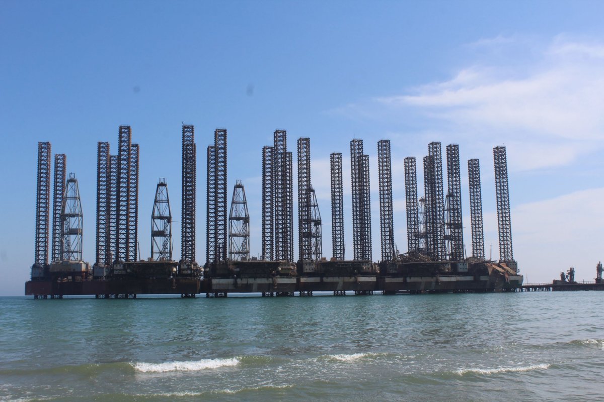 Cestou zpět jsme se zastavili na pobřeží Kaspického moře, ze kterého vystupovala monumentální těžební plošina. To je v našich končinách něco zcela nevídaného, tak jsem si hned udělal pár fotek a rovnou i smočil nohy v Kaspickém moři.