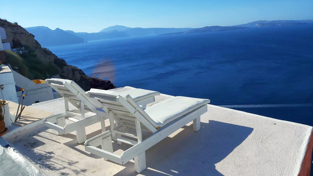 Letadlo je nařezané k prasknutí, což mě mile překvapilo a za dvě a kousek hodiny od startu přistáváme na Santorini. Časový posun plus 1 hodina. Let v rouškách, to a ano, ale jinak nic, na co by měl člověk v době Covidu myslet.