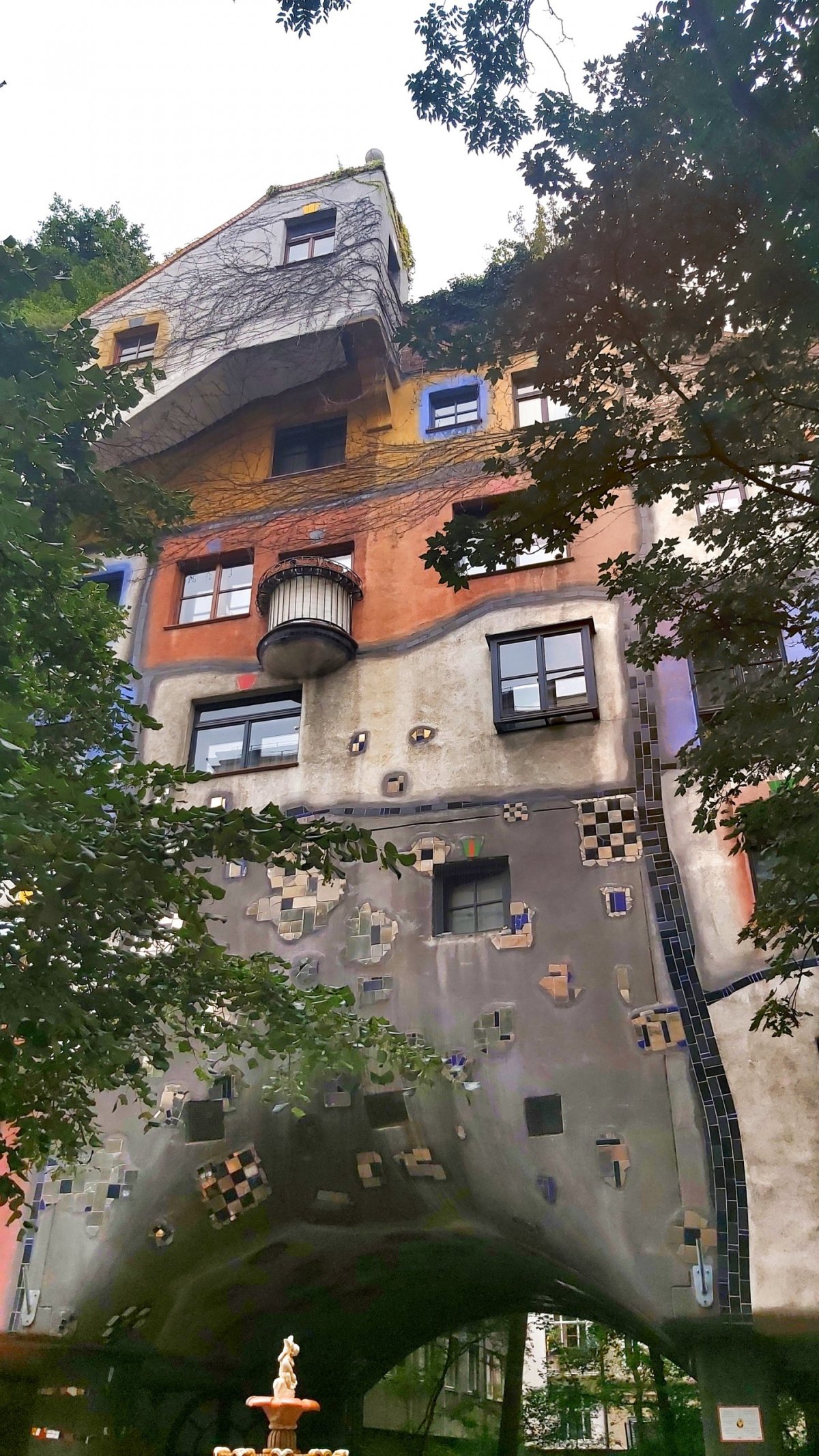 Autorem tohoto dílka byl Friedrichsreich Hundertwasser, jehož dědeček byl mimochodem pan Stovoda z Moravy. Jednalo se o dost svérázného architekta, malíře a grafika, který prohlašoval, že v přírodě rovná čára neexistuje. No a tak vznikl pohádkový domeček Hundertwassehaus, kde neexistuje rovná linie. Aby jeho dům splynul s přírodou, nechal architekt do všech možných jeho skulinek vysázet zeleň. Celkově se dům opravdu vymyká z okolní zástavby!