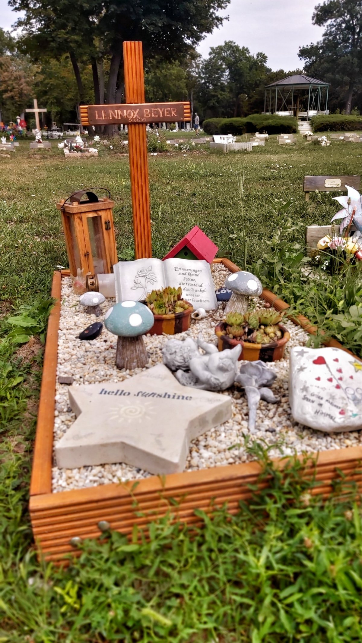 Co mě nejvíc dostalo, to byla parcela určená pro hroby narozených mrtvých dětí. Nikdy jsem nic podobného neviděla. Travnatá plocha plná barev - větrníků, hraček aj. Na cedulkách mnohdy jen křestní jméno a když datum, tak jen jedno jediné. Datum narození a současně úmrtí. Musím říct, že NIC strašnějšího a současně citlivějšího jsem dlouho neviděla! Soška novorozeného dítěte v kamenné dlani mě definitivně dorazila. Zvláštní místo, zvláštní myšlenky...
