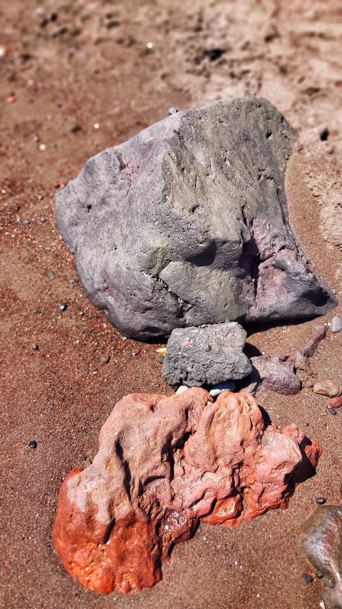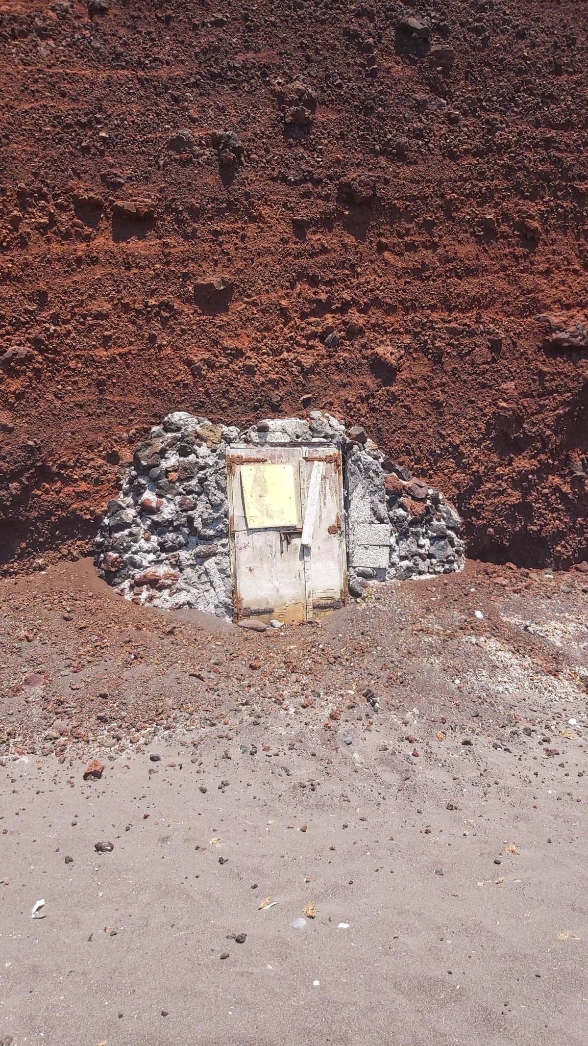 Red Beach, horký černorudý písek u bílých dveří ve skále…