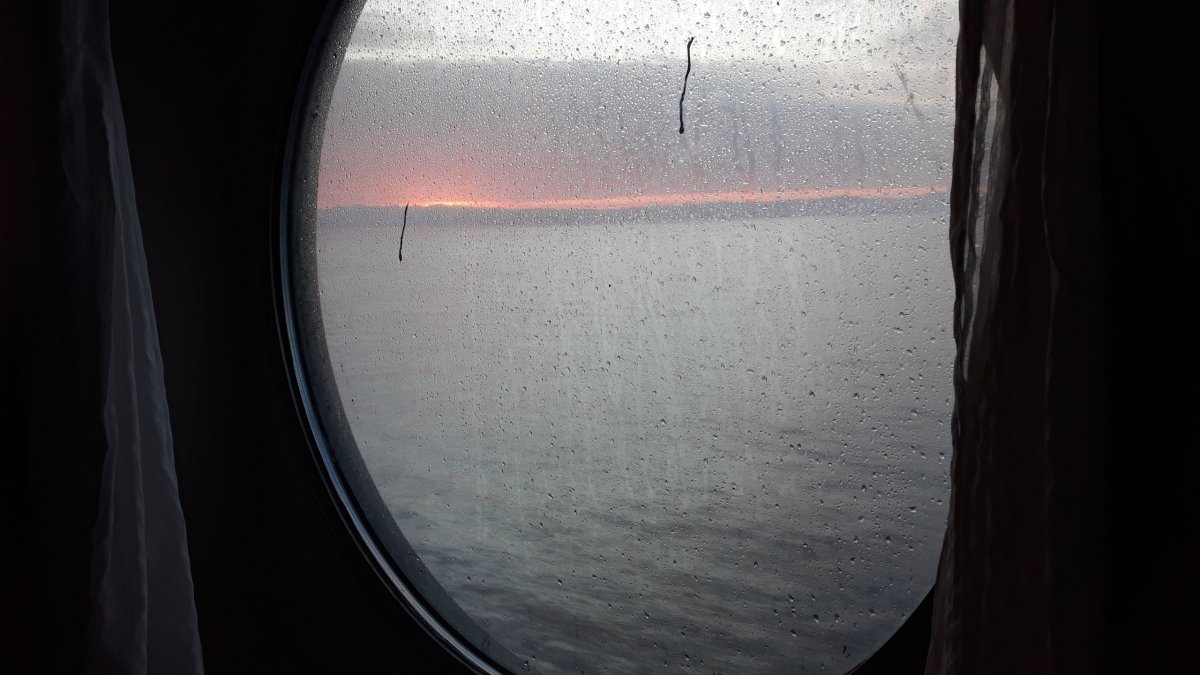 Když připlul trajekt, tak všechna auta obešel pikolík, který kontroloval palubní lístky a pasy. Na auto nám nalepil lísteček, který tam musí být dokud trajekt neopustíme. Měli jsme štěstí, že začalo pršet, lísteček se odlupoval a měl tendenci odletět. Po přečtení lístečku nám došlo, že to je číslo kajuty, kde budeme spát. Pravděpodobně to dávají na auta z důvodu větších vln, bouřky atd., jelikož ze zkušeností jedné z spolucestovatelek dochází k tomu, že se spustí v autě alarm, který může vybít baterii a s autem potom neodjedete. Díky lístečku rychleji ví, kde se nachází majitel auta. Pokud tam cedulka není, tak nikdo posádku vozu nevyhledává.