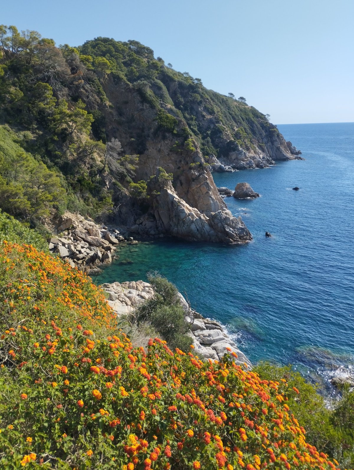 Miluju tyhle lety z okolních blízkých letišť okolo 8 až 9 hodiny ráno. Člověk se stihne docela slušně vyspat a před polednem už je v cílové destinaci, kterou byla v tomto případě Girona. Na letišti jsme převzali auto a už těsně po poledni jsme byli u moře. Sever země je oproti jihu velmi čistý, organizovaný, upravený – to bylo něco, co se mi moc líbilo. Taková kombinace Rakouska a jihu Španělka, příp. Řecka. Zaparkujeme na boku městečka Platja d'Aro asi 300 metrů od pláže. Hezké letovisko, přitom nebyl s parkováním žádný problém a bylo neplacené, což beru jako velkou výhodu. Toto letovisko, ve kterém jsme ubytovaní se ukázalo jako fajn volba – velká písečná pláž (i když písek je spíše hrubší a poměrně brzo se dostanete do hloubky, takže nečekejte druhou Sardninii), pěkné pobřeží a hlavně na jedné i druhé straně krásné cestičky podél útesů, ze kterých se dá po schodech sejít na jednotlivé pláže. Cestičky jsou krásně upravené, rovné a schůdné i v nazouvákách.