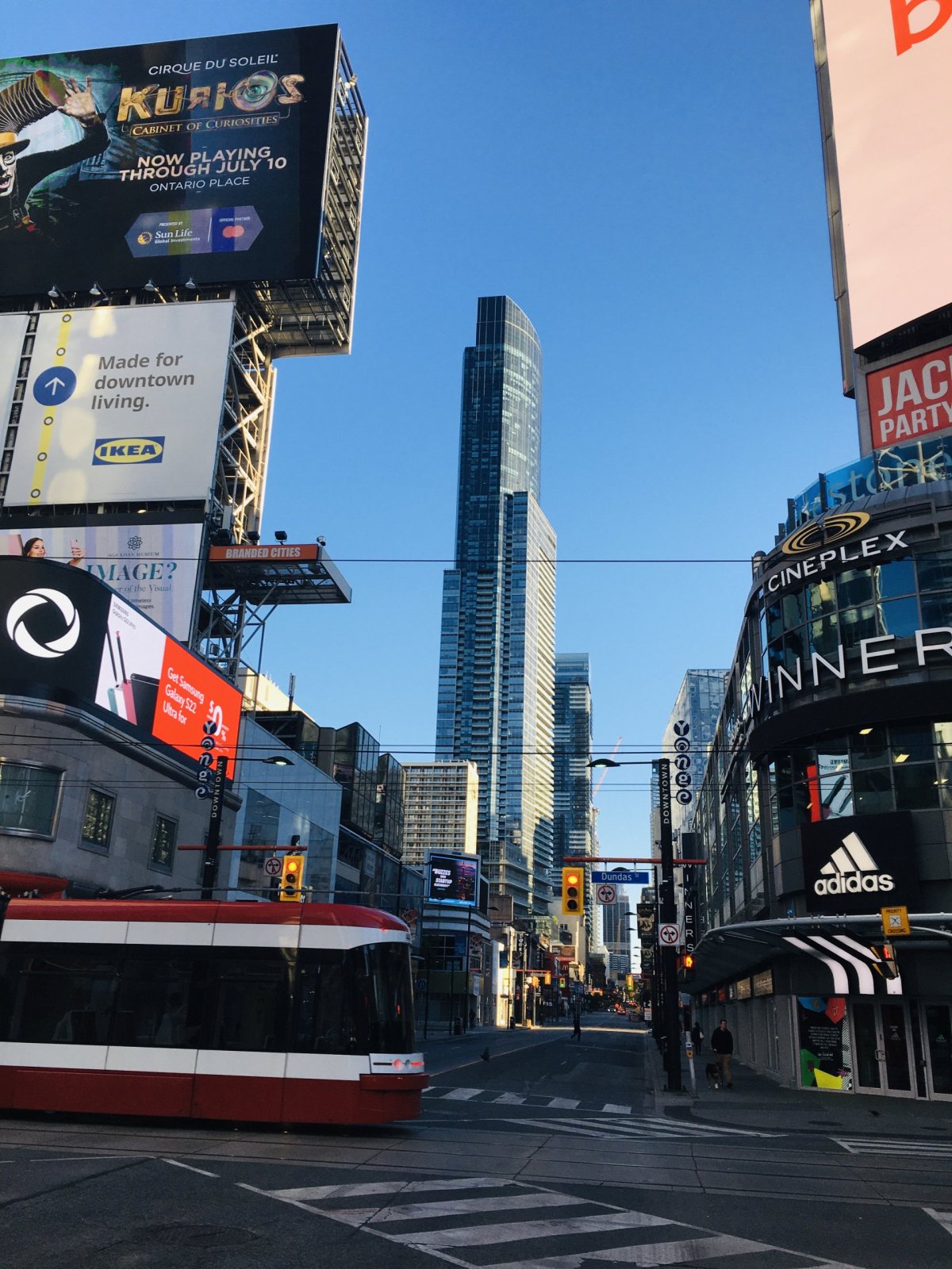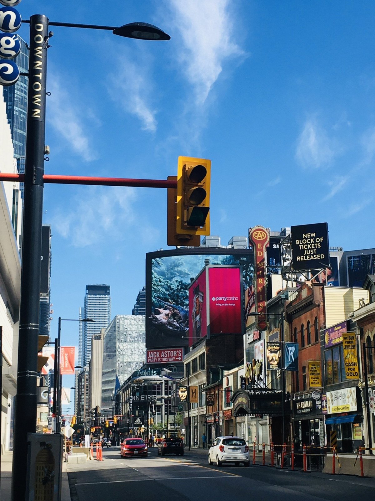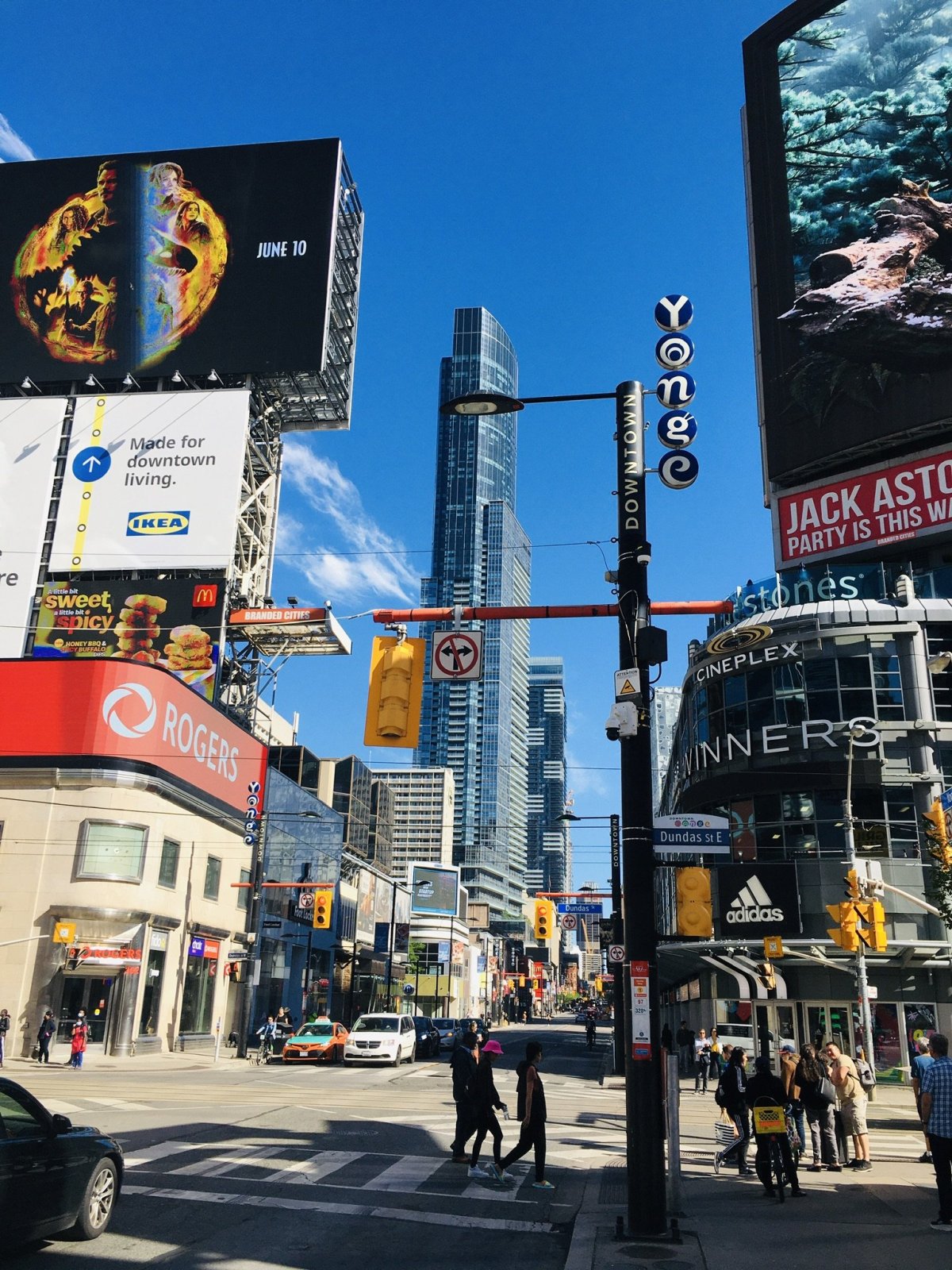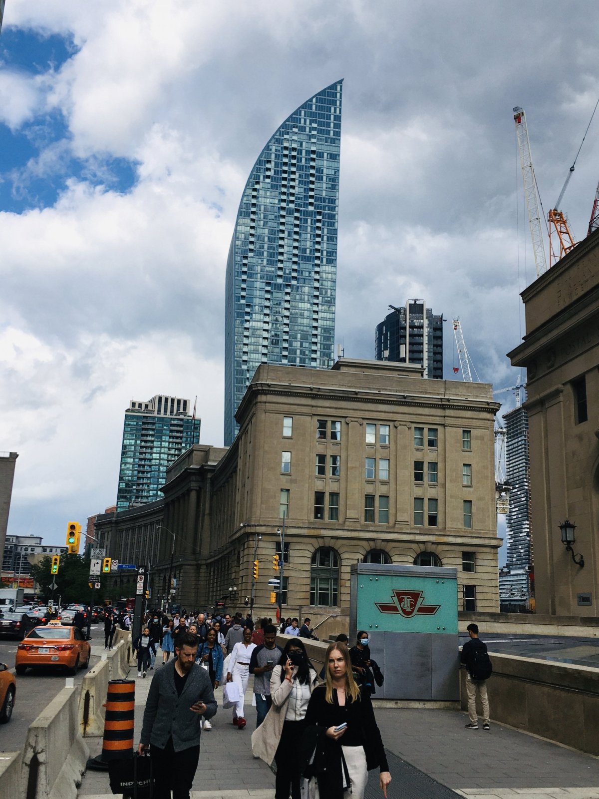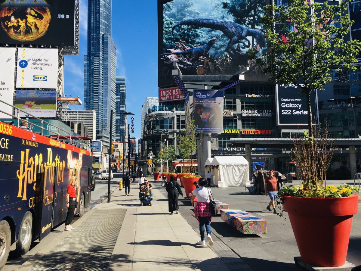 V jižní části downtownu je i nespočet mrakodrapů a výškových budov. Celé to působí impozantně a můj dojem z této části města je velmi příjemný a velice rád se tady procházím. Centrální tepnou města je Yonge street táhnoucí se od jezera, z jihu směrem na sever. Protíná již jednou zmiňovanou Dundas Square, místo ikonické a živé. Působí zde mnoho lidí, kteří něco umí. Nejvíce hudebníků a malířů. Působí tu, ale možná ještě víc lidí, kteří neumí nic. Různí exhibicionisté, pseudoumělci, zoufalci a podivíni. Tohle místo přitahuje i feťáky, psychicky narušené osoby nebo jen lidi bez domova. Opravdu pestrá paleta. I tak mě hrozně baví si tady jen tak sednout a pozorovat ten cvrkot kolem.