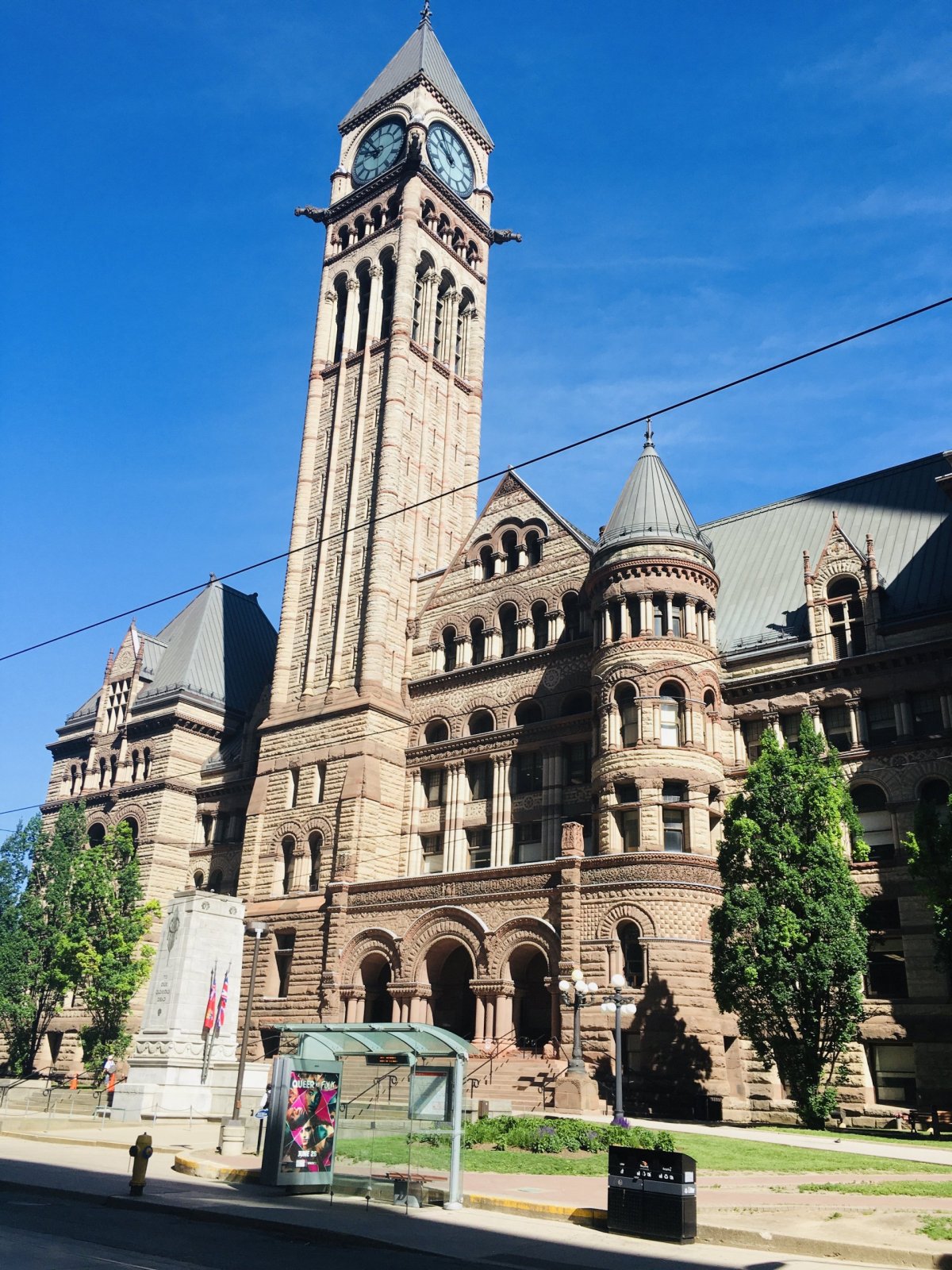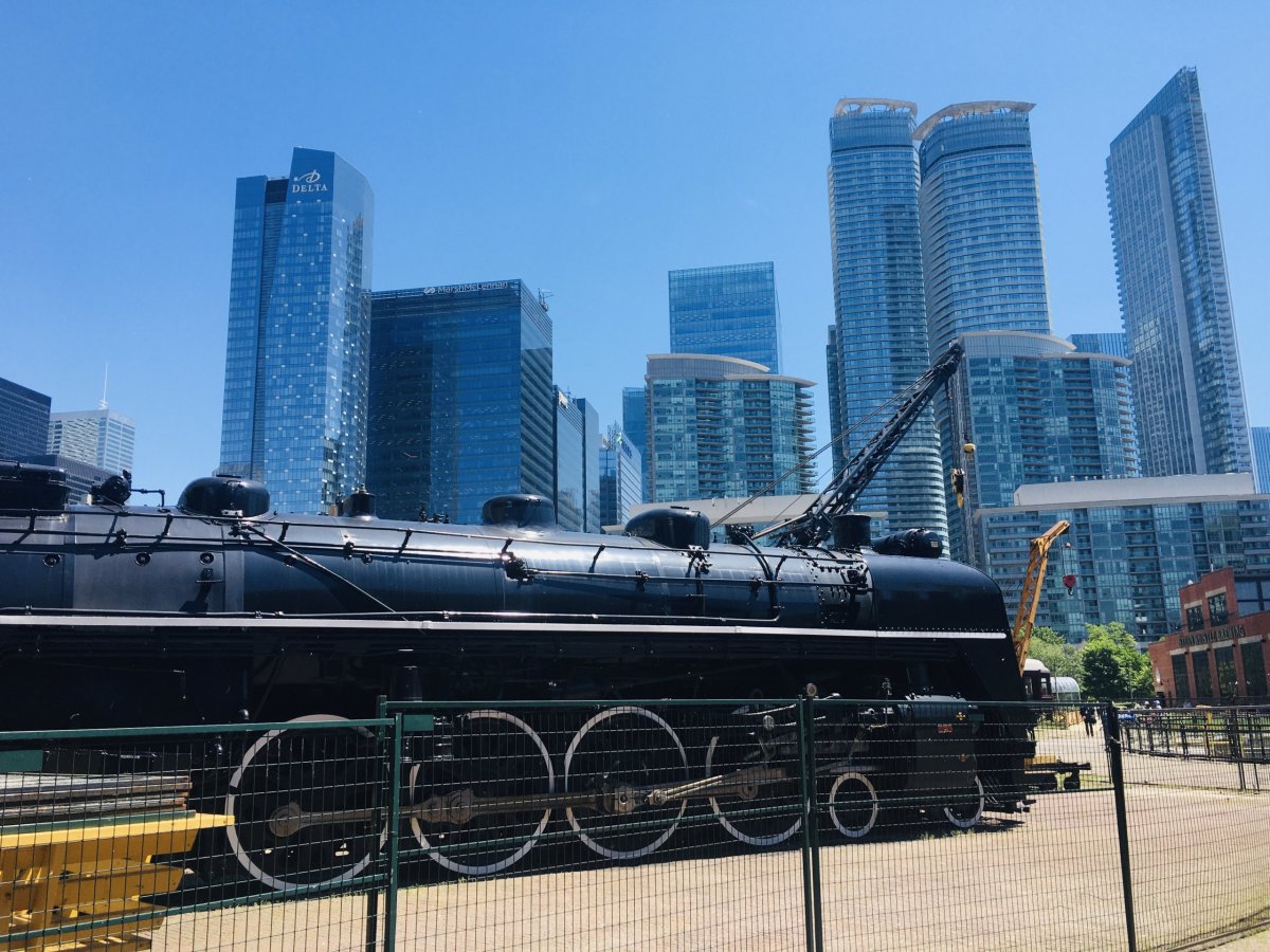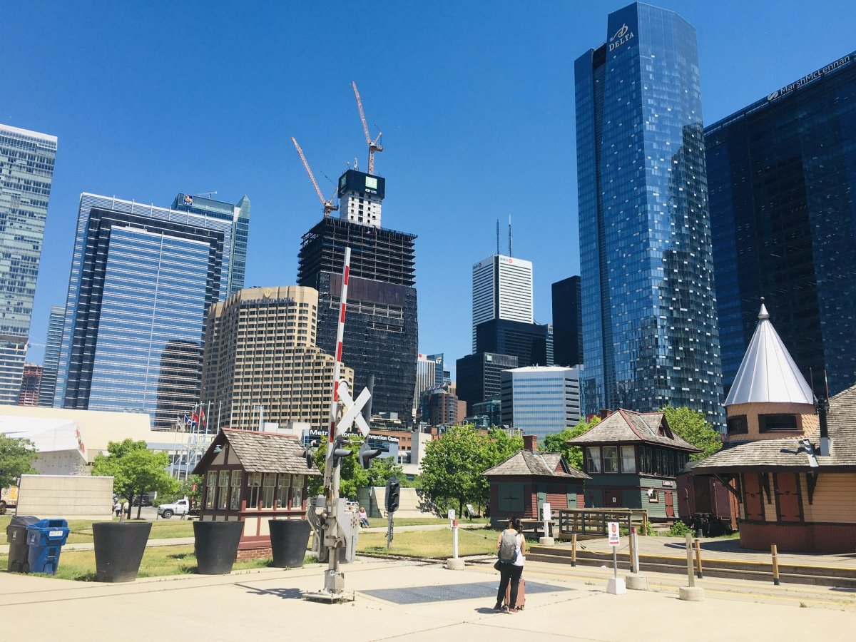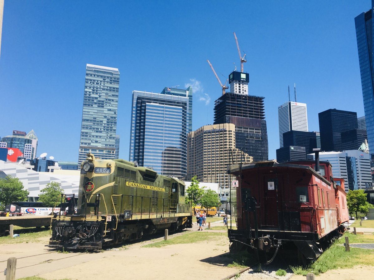 Proč downtown? Kanaďané totiž neznají výraz centrum, ale downtown. Ten se táhne z jihu od jezera asi 3 km k severu a končí u budovy parlamentu. Ta je spolu s nedalekou Old City Hall ležící na Nathan Phillips Square jednou z mála historických budov ve městě. Těch je kromě desítek různých chrámů a kostelů opravdu málo a jsou roztroušeny tu a tam a netvoří žádný celek. Věhlasnou dominantou je CN Tower, bývalá nejvyšší budova světa měřící 553,33 metrů než jí překonala dubajská Burdž Khalifa. Přímo vedle ní je baseballová hala Rogers centrum, Ripleyho mořské akvárium a naprosto fantastické venkovní muzeum železnice, které v pozadí s mrakodrapy vytváří nesmírně fotogenickou scenérií.