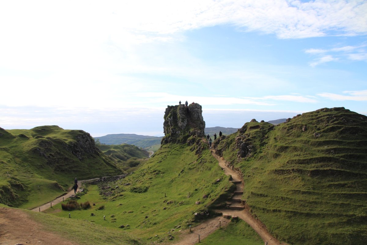 Už předchozího dne mě zaujala nejstarší pekárna na ostrově Dunvegan Bakery & Coffee Shop. Už na začátku otvírací doby v 10.00 se zde tvoří fronta zákazníků čekajících na skvělé pečivo. Také jsme si pár kousků koupili a vzali s sebou k obědu. Dnešní túra – Old Man of Storr, což je jedna z nejpopulárnějších tras na ostrově. Legenda vypráví o obrovi, který zde žil, a po jeho smrti zbyl palec, což je tento 55 metrů vysoký skalní útvar. Kousek odsud leží „hlavní“ město ostrova Skye Portree. Nicméně žije zde necelých 2500 obyvatel. Jedná se o malebné městečko s hlavní třídou, náměstím a skvělou kavárnou Birch Cafe. Další zastávkou byl Kilt Rock Waterfall, což je 90 metrů vysoký vodopád. Fairy Glen je pohádkové místo, které vzniklo důsledkem sesuvů půdy po ledovci a erozi.