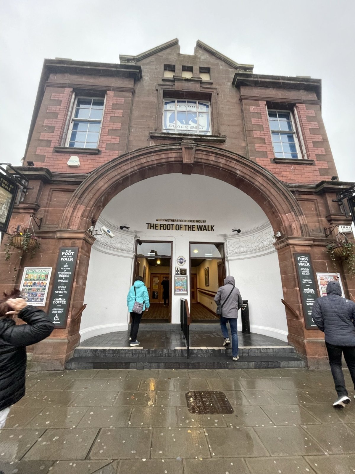 Ve čtvrtek po probuzení jsme si chtěli dát skotskou snídani. Zjistili jsme, že v Anglii je řetězec restaurací, který má svou aplikaci, která se jmenuje Wetherspoon, stáhnete si aplikaci, zjistíte jak daleko od vás je nějaká restaurace, dojdete tam, zadáte v aplikaci číslo stolu, objednáte si jídlo a zaplatíte mobilem a oni vám to donesou ke stolu. Naše restaurace blízko našeho ubytování se jmenovala The foot of the walk. Většina z nás si dala skotskou snídani nebo britskou. Jako levnější variantu jídla můžeme toto také doporučit.