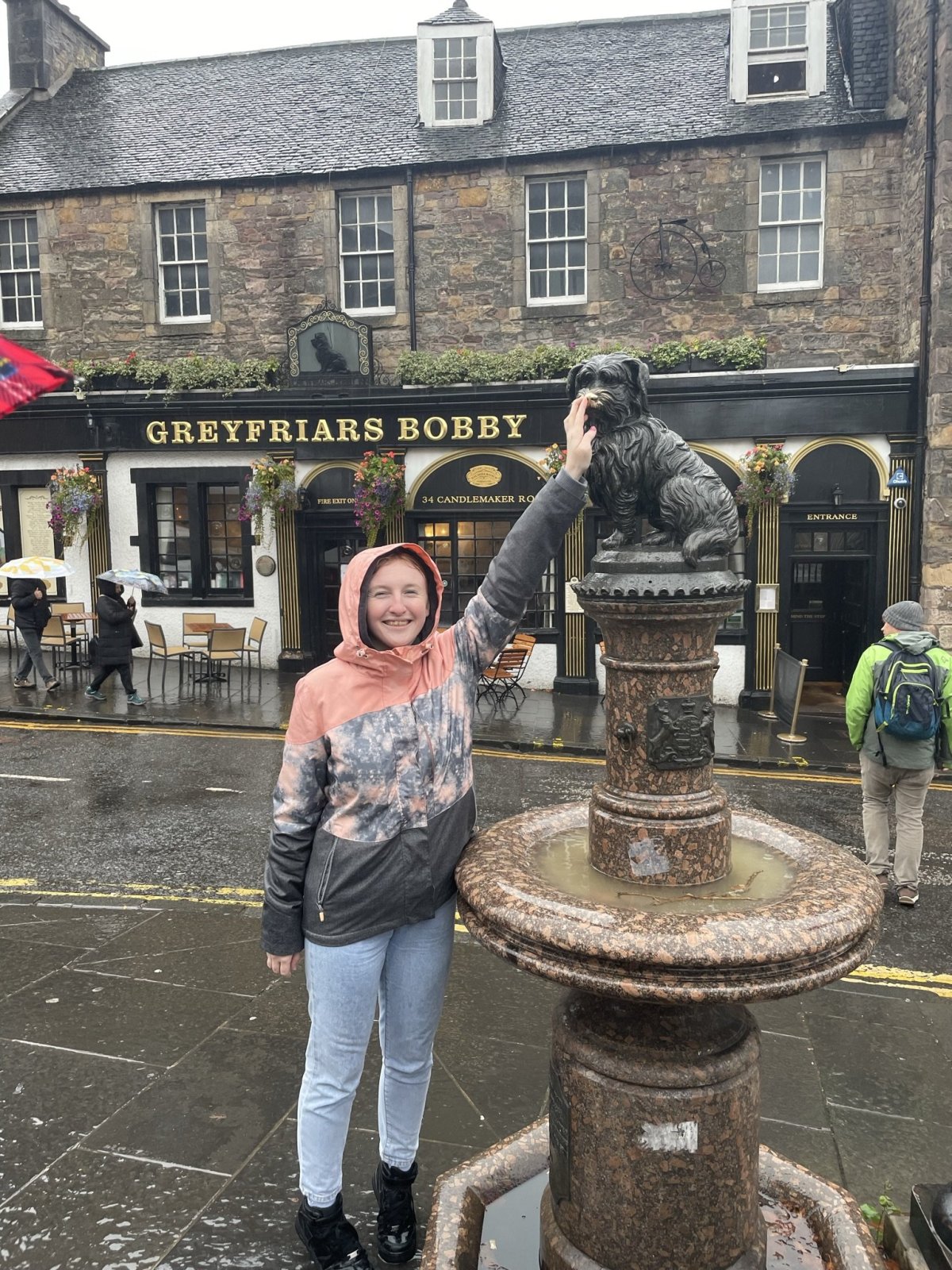 Kousek od hradu je bar, který se jmenuje Greyfriars Bobby’s bar a před ním je soška pejska. Pejsek se stal známým v 19. století, kdy hlídal hrob svého pána. Blízko baru je i hřbitov kde je pochovaný. Tak jsme nešli, stavili jsme se jenom ke sošce. Je to docela turistické místo, takže na fotku si počkáte.