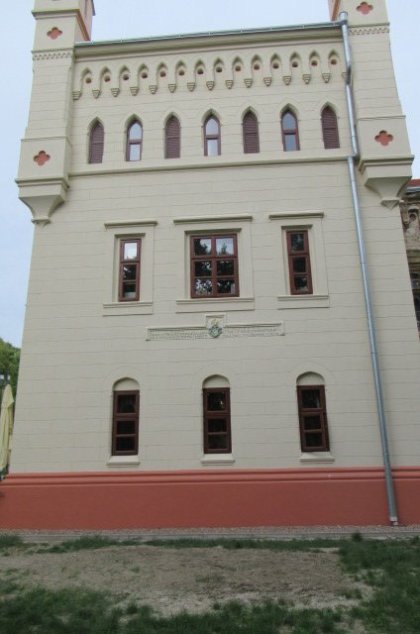 Okná majú pôvodné kované mreže a nadokenné reliéfy s dvojitým frontónom. Na poschodí je vo frontóne polkruhový mušľovitý obrazec. Okná v rizalite sú väčšie, polkruhovo zakončené s klenákom. Portál so segmentovým oblúkom má po stranách štíhle stĺpy, na ktorých sedia ženské alegorické postavy. </bývalý>