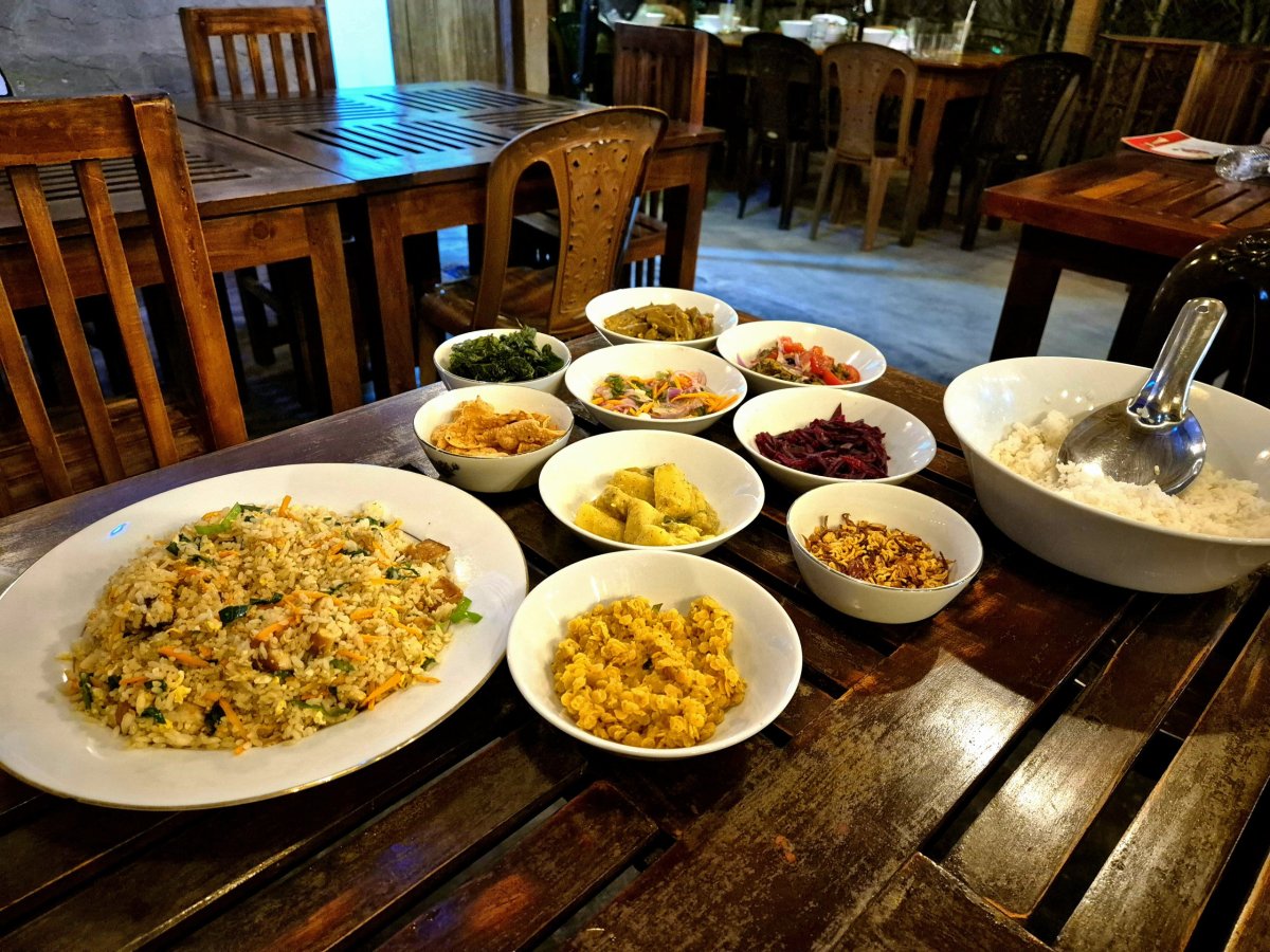 Po vybalení jsme se vydali na večeři do blízké rodinné restaurace Ruwani na naše první pořádné jídlo tohoto dne a konečně to vyhlášené srílanské kari. Naprostá exploze chutí, každá mistička s něčím jiným. Napoprvé jsme vyzkoušeli kari bez masa, jen zeleninové, a ještě kottu – nakrájené a osmažené placičky roti s masem a zeleninou. Objednali jsme si kromě pití jen dvě jídla a bylo toho pro nás tři až dost. Do této restaurace jsme zavítali pak ještě dvakrát a pokaždé jsme platili kolem 5-6 000 LKR (340-410 Kč) a doslova jsme se odkouleli úplně nacpaní.